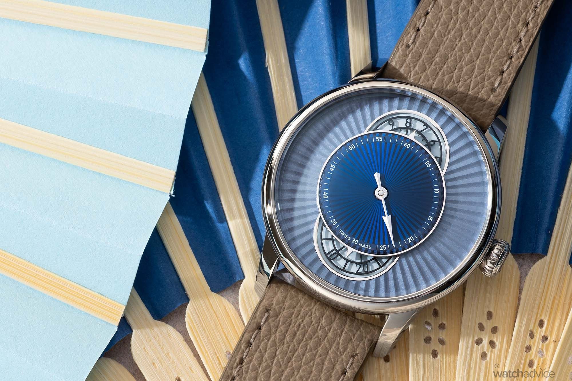 But this watch couldn’t look more different from those old clocks… Rather than conventional sub-dials, the hour and seconds indications are displayed on skeletonized matte-grey rotating discs, set against softly offwhite backgrounds. Hours at 12 o’clock, seconds at 6, and minutes take centre stage in a deep, saturated blue. Both the main dial and the light blue open space feature a subtle fan-like texture, adding depth and catching the light without overwhelming the composition.