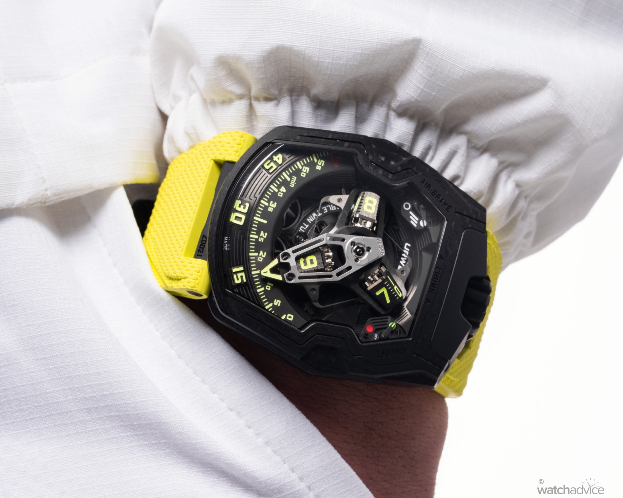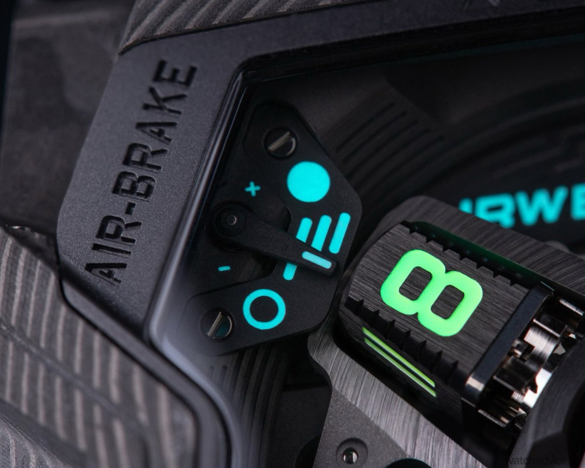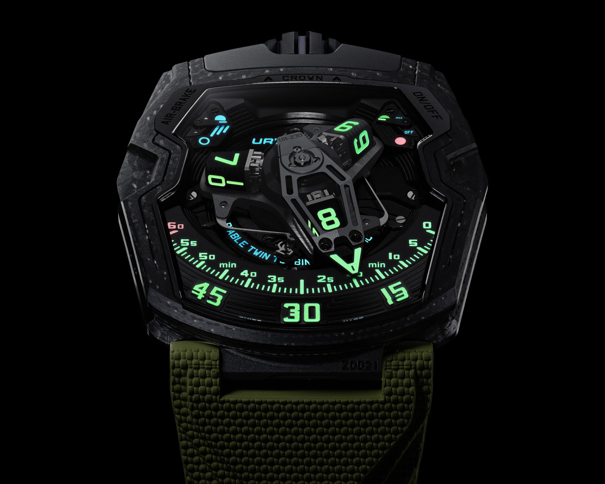 Despite the complexity, legibility remains excellent — something Urwerk has quietly mastered over the years. Strategic use of Super-LumiNova across the hour markers, minute indicator, and functional displays ensures the watch remains readable even as the light disappears. Even the airbrake system indicators are lit up.