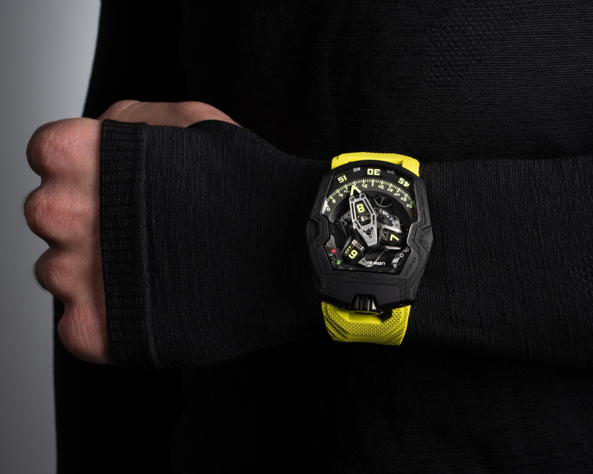 Encasing the movement is a hermetic titanium container, effectively turning the UR-230 into a mechanical safe. This inner structure protects the calibre from shocks and environmental interference, while the outer composite shell and black DLC-treated titanium caseback complete a construction that gives you a machine on the wrist.