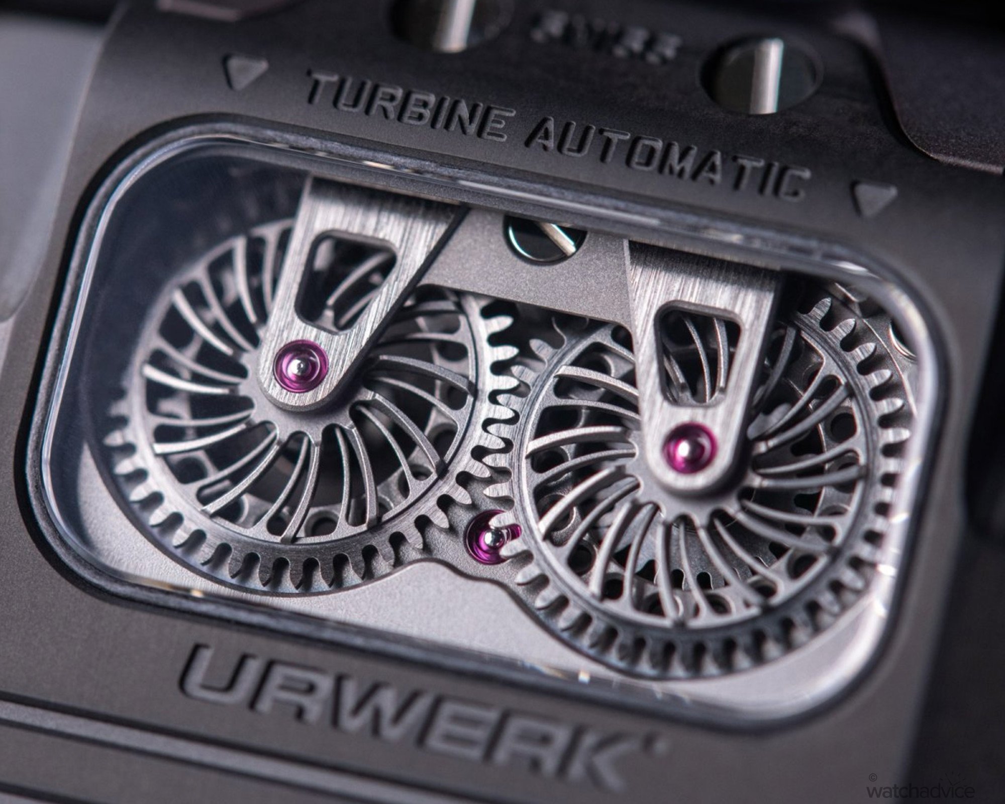 Unlike conventional automatic movements, the UR-230’s calibre UR-7.30 uses two turbines with distinct roles. One turbine absorbs shocks, protecting the movement from sudden impacts. The other acts as an aerodynamic brake, regulating airflow within the case to control winding speed and efficiency.