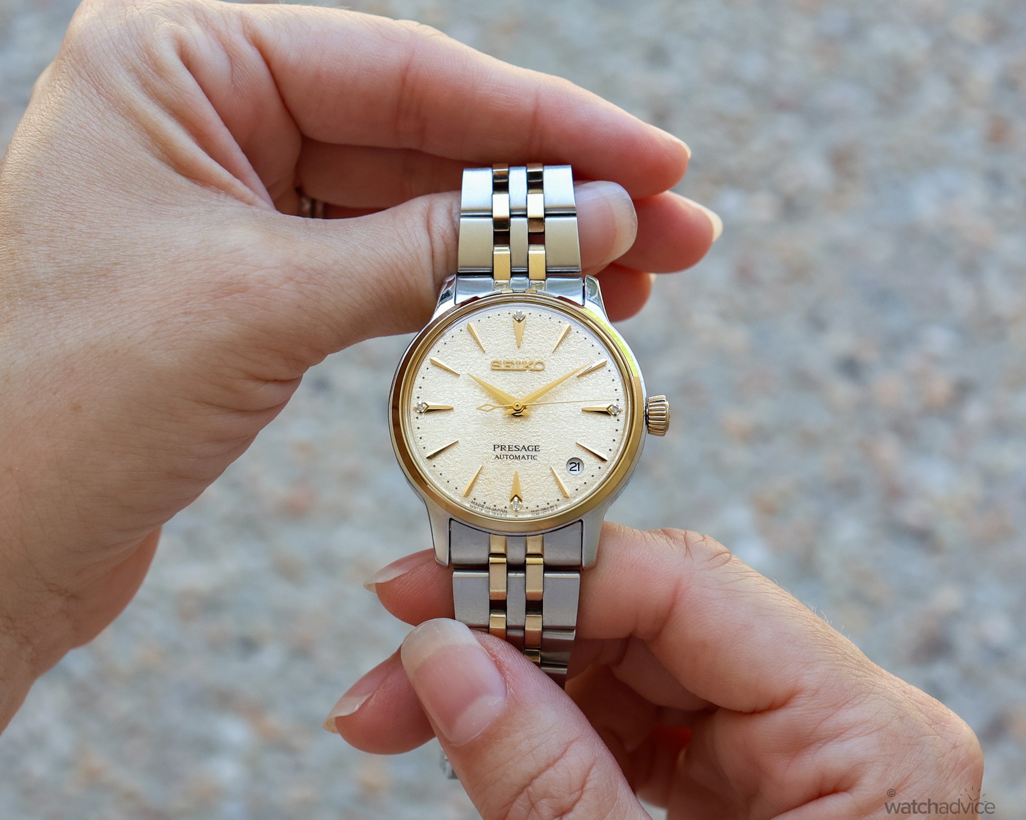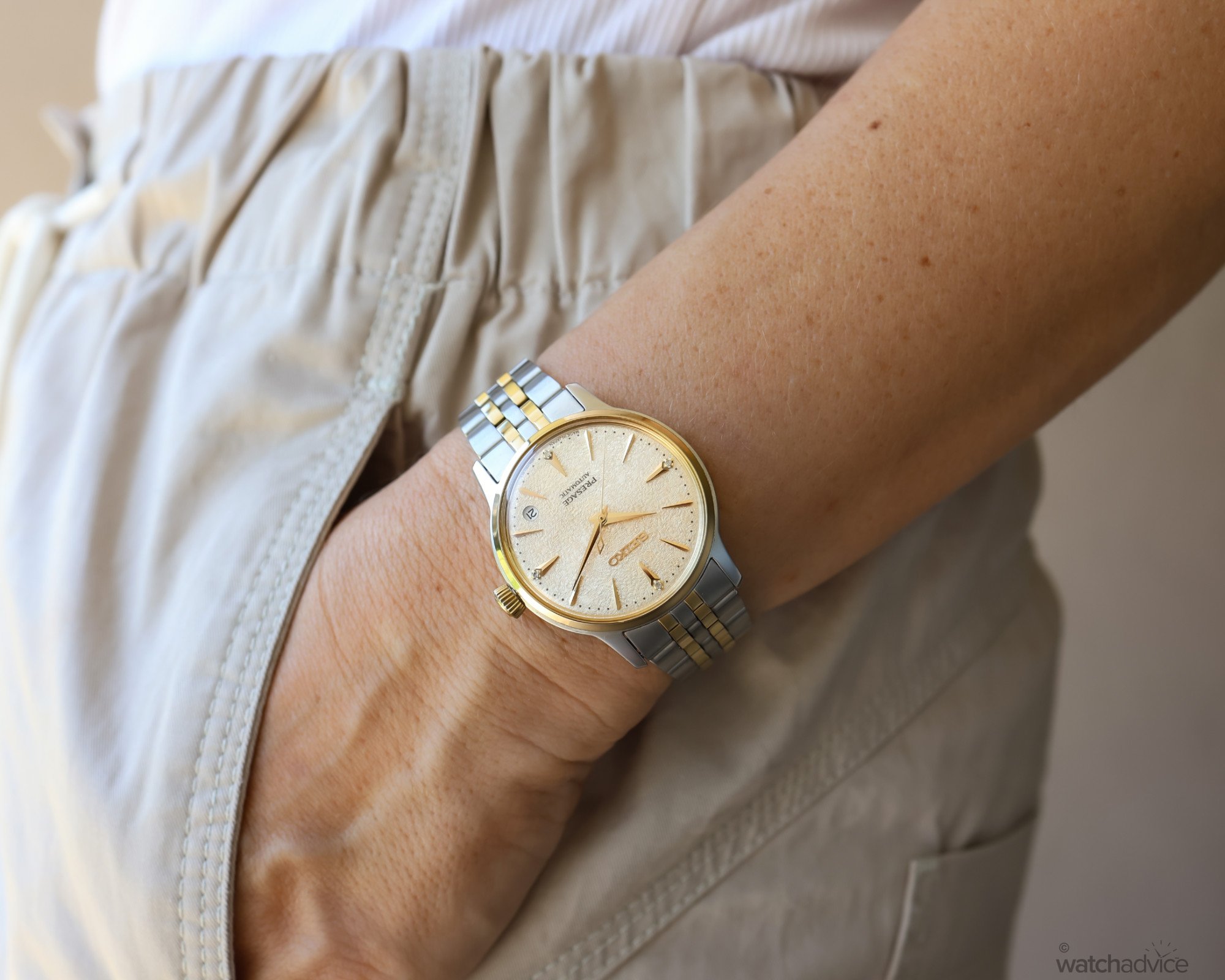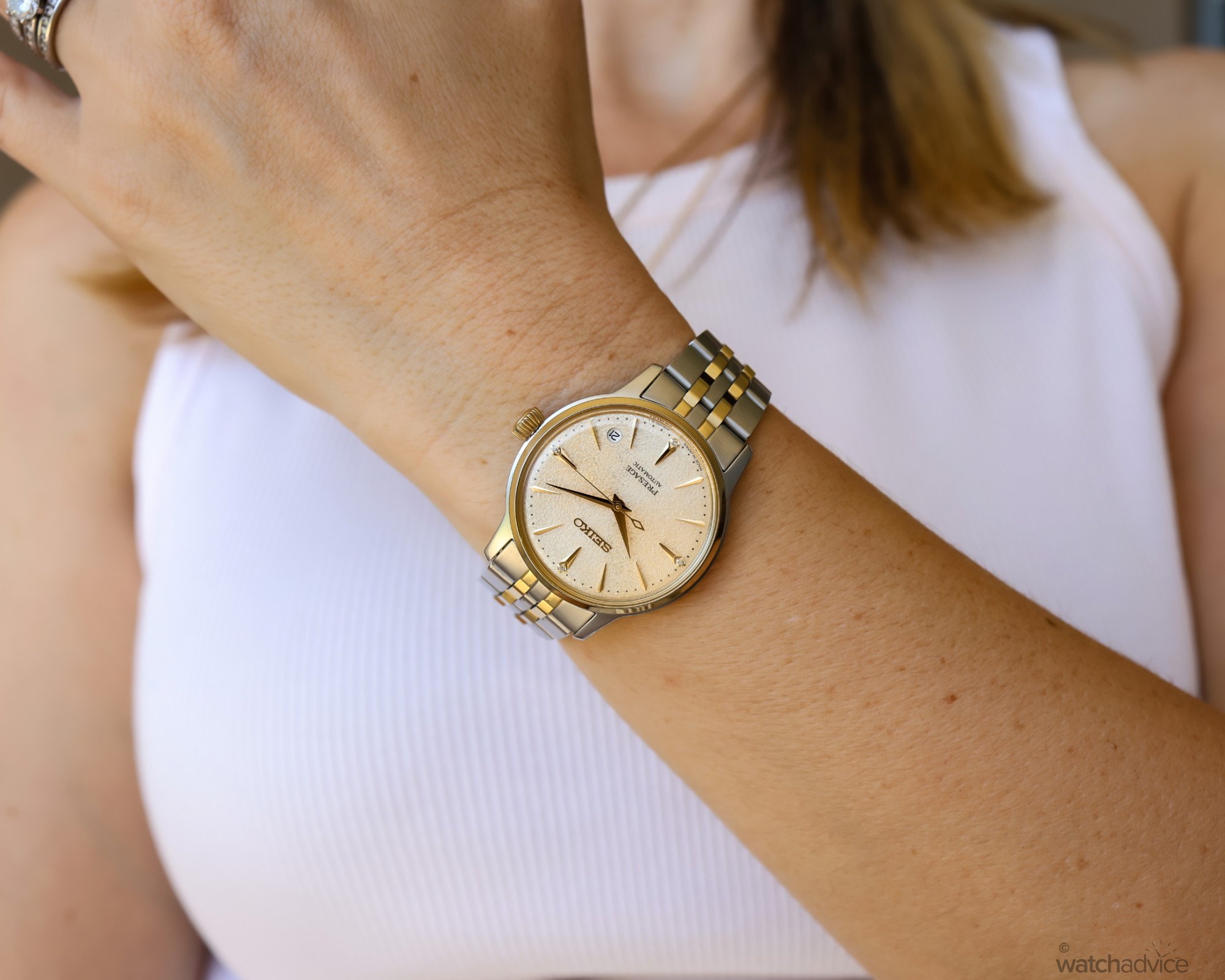 The watch is housed in a 34mm stainless steel case with yellow gold-tone accents, a size that aligns well with the dress-leaning nature of the Presage Cocktail Time range. The polished surfaces really lend to the watch’s formal character, while the two-tone execution ensures versatility across different settings. Paired with a matching two-tone bracelet, the case design feels cohesive and balanced on the wrist.