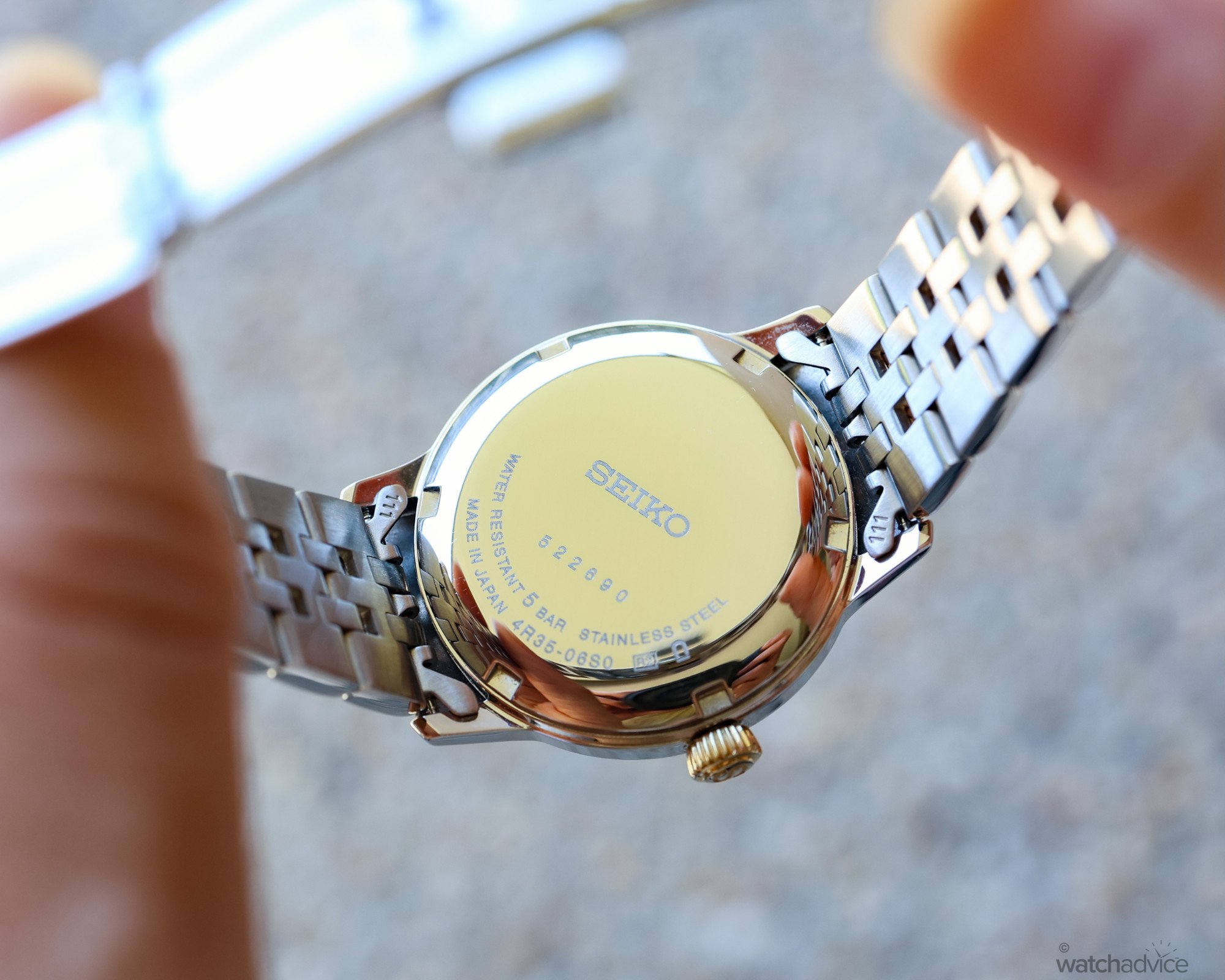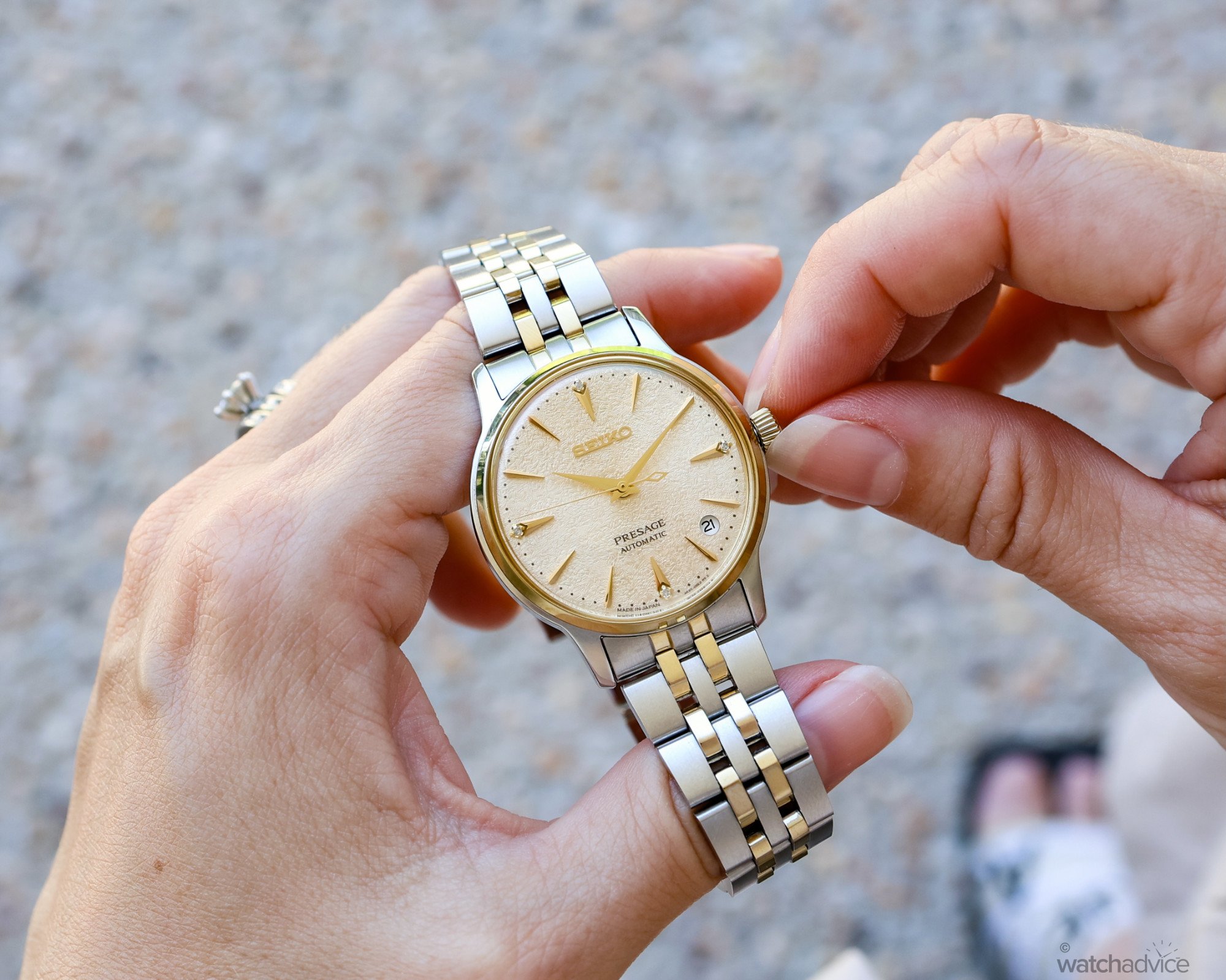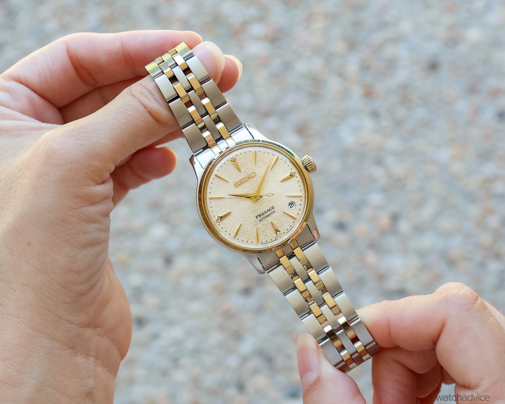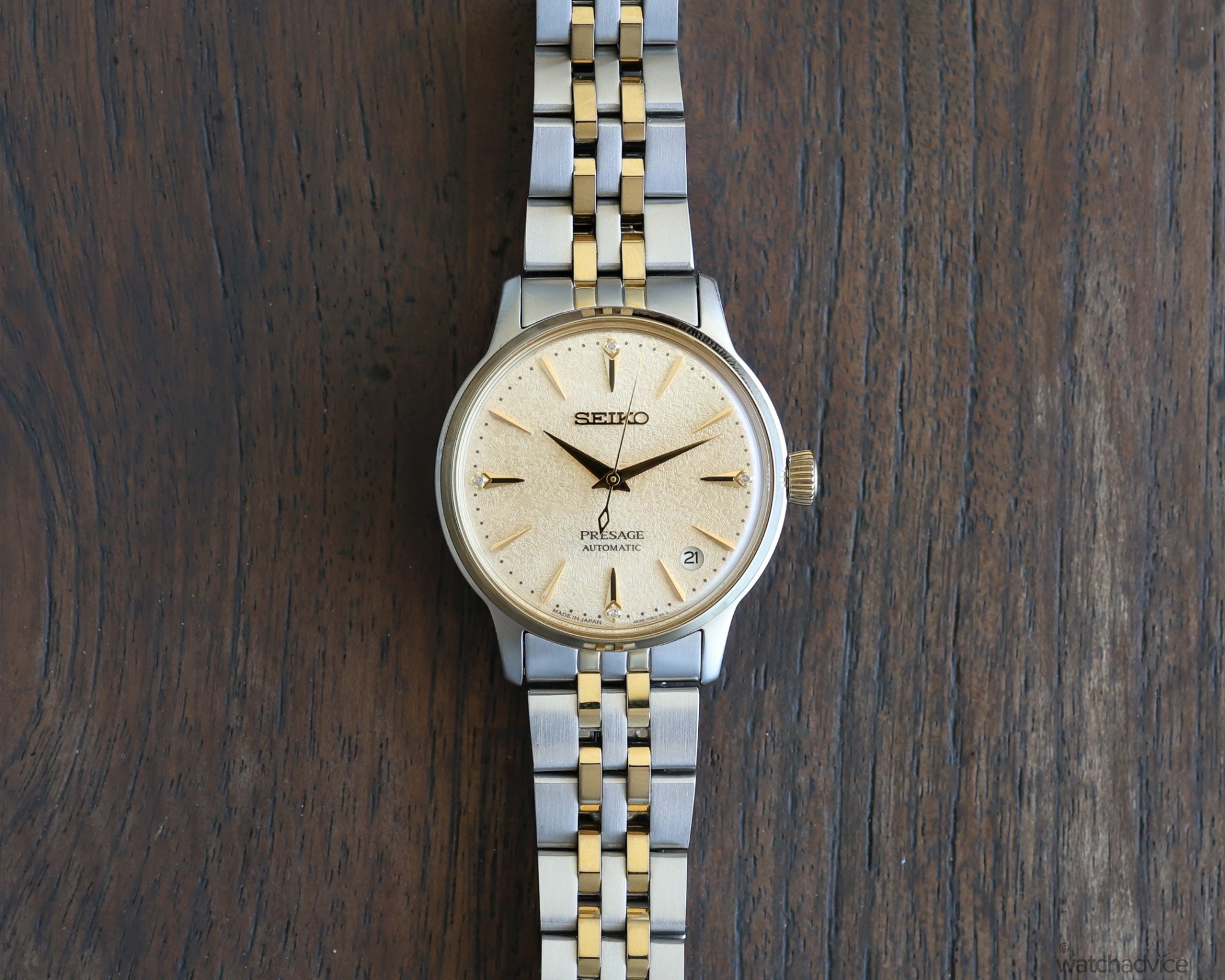The watch is housed in a 34mm stainless steel case with yellow gold-tone accents, a size that aligns well with the dress-leaning nature of the Presage Cocktail Time range. The polished surfaces really lend to the watch’s formal character, while the two-tone execution ensures versatility across different settings. Paired with a matching two-tone bracelet, the case design feels cohesive and balanced on the wrist.