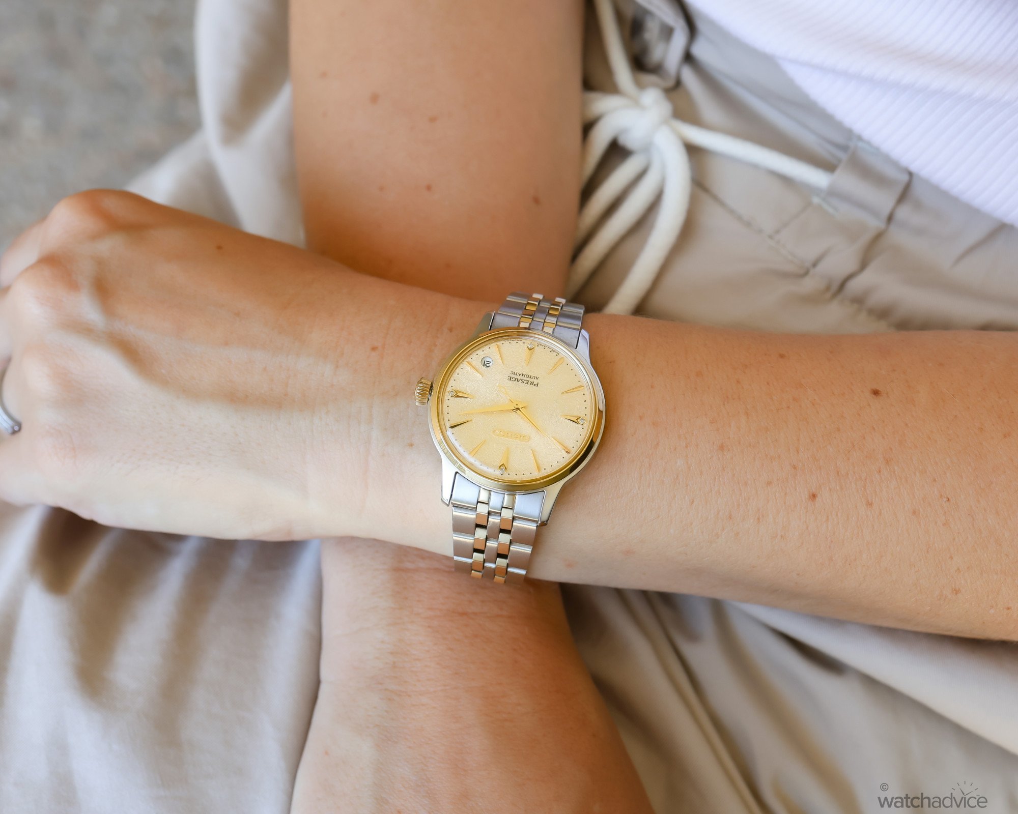 Now, you may have gathered by now, this is more for the ladies – two-toned with gold accents, diamond-set indices and in a smaller 34mm case size. Part of the wider summer collection, which includes a mint green dial – SRPL63J, a vibrant blue texture dial – SRPL61J, both in stainless steel, the “Frozen Banana Daiquiri” sets itself apart, quite literally. As much as I tried, I’m not the best person to test this watch out, so in my usual fashion, when road testing a lady’s watch, I gave my wife, Dominique, the choice of which model she wanted to wear – and without reservation, she chose the two-tone.