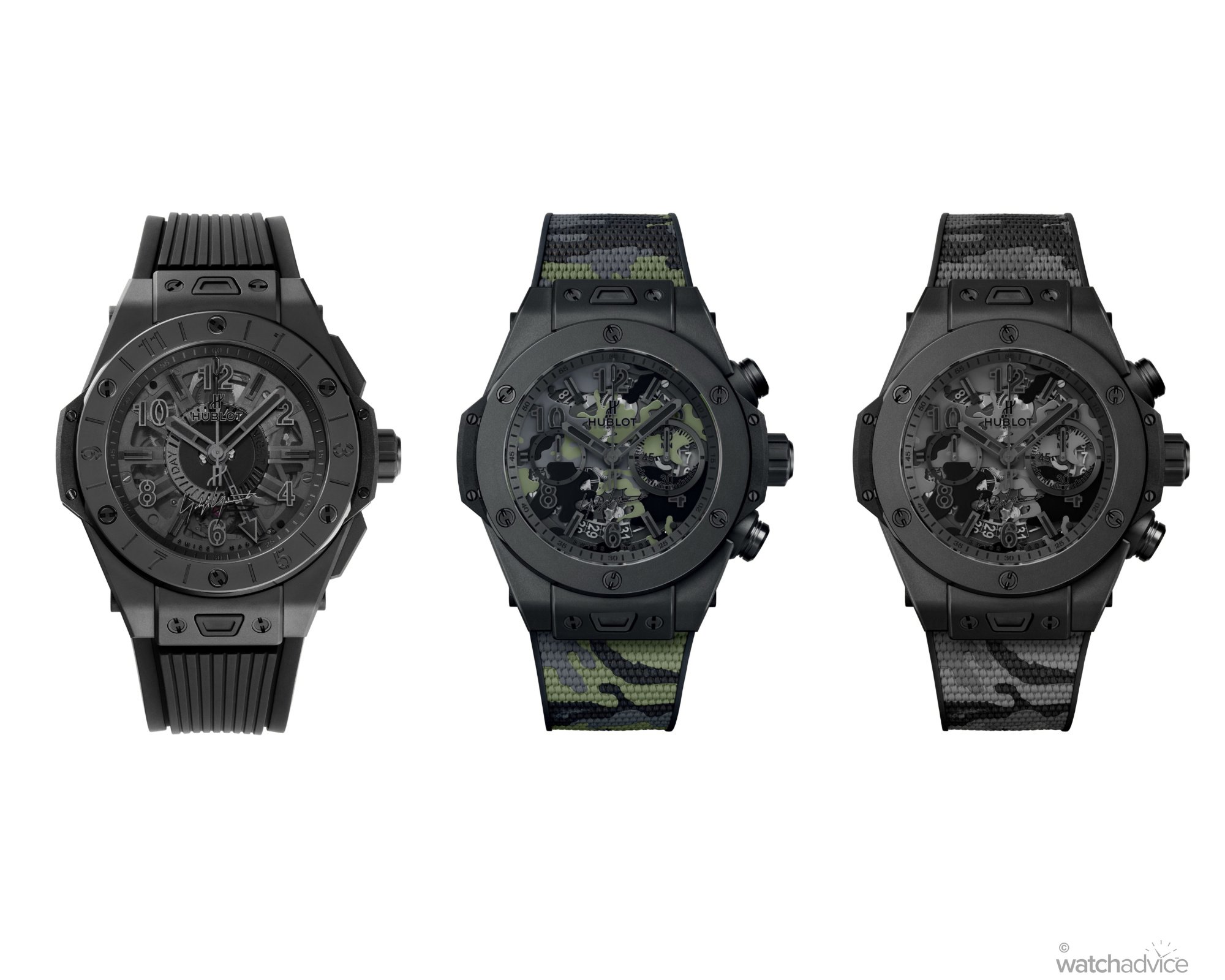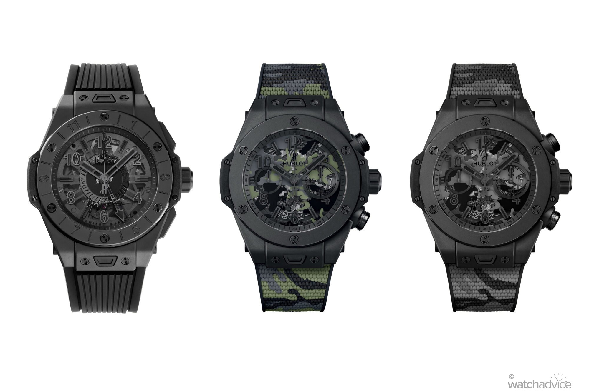 The 2020 Hublot x Yohji Yamamoto collection, including the Big Bang GMT, the Big Bang Camo and the Big Bang All Black Camo