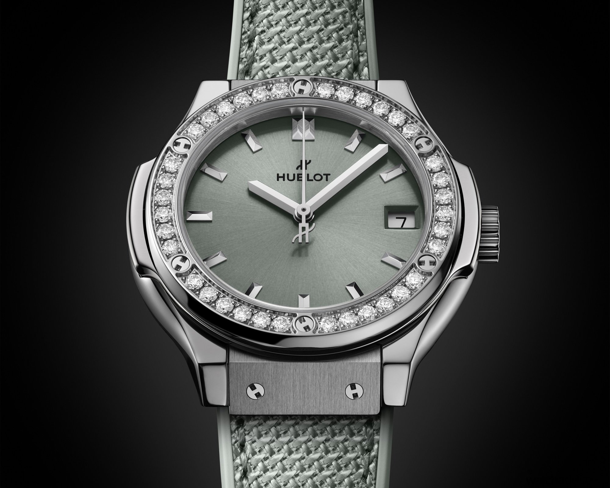 The three Classic Fusion Sage Green models come in distinctive case sizes, all housed in lightweight titanium cases with the iconic H-screw bezel. First is the 45mm model, which has a moderate 13.05mm thickness and silver subdials denoting its chronograph complication. The middle child of the set, at 42mm, is a standard three-hand model with a case thickness of 10.4mm. Finally, the diamond-set 33mm model sits at a demure 8.4mm thick, with the added flourish of a bezel set with 36 diamonds totalling approximately 0.8 carats.