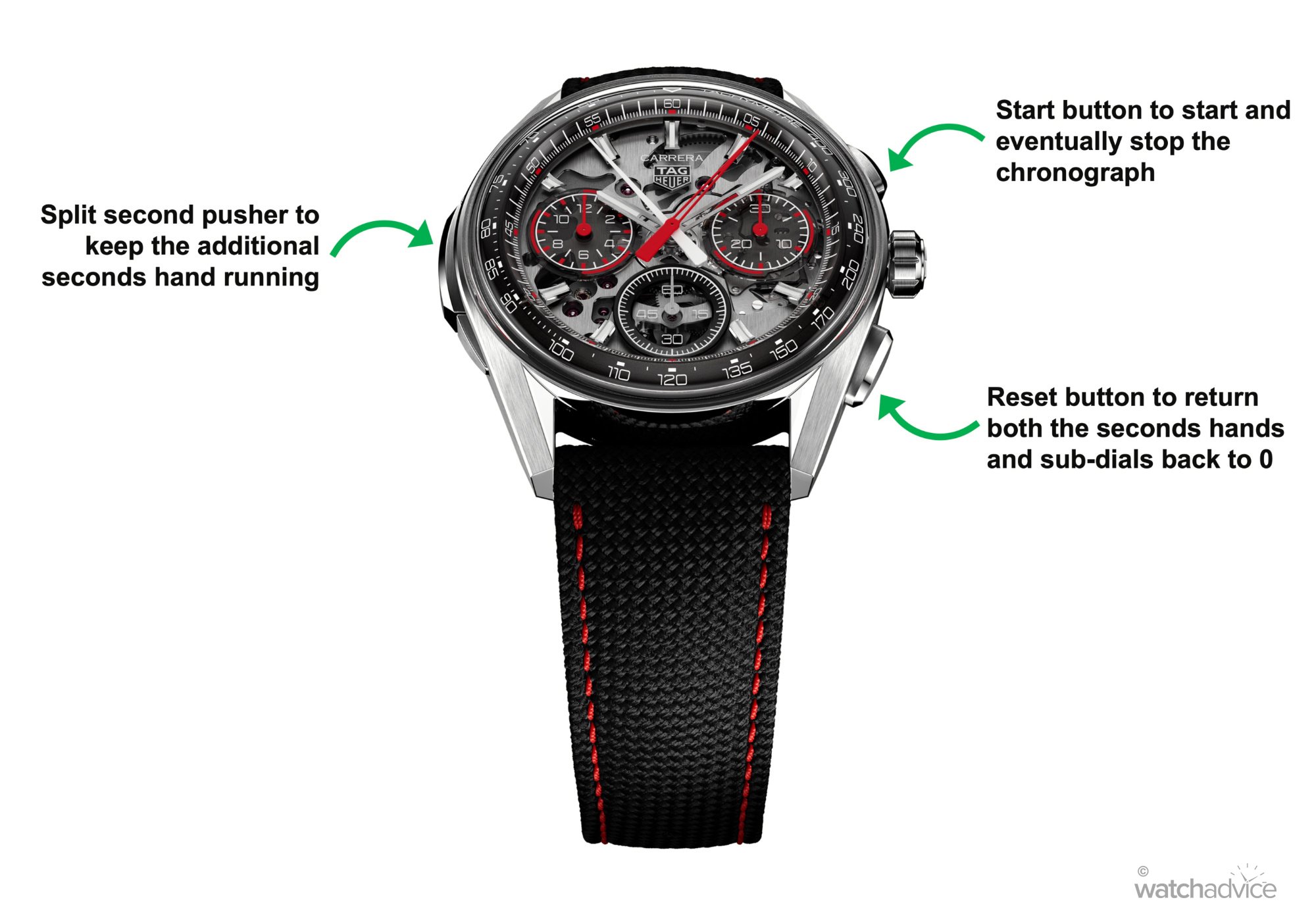 But first, for those asking, what is a rattrapante complication? In a nutshell, it allows you to time two independent events at once via the dual chronograph seconds hand via the start/stop pusher at 2 o’clock and on the side at 9 o’clock. A good example of this is two cars doing a timed lap or drag race. Start the chronograph when the flag drops, when the first car crosses the line, hit the left-hand side pusher and the red hand stops, while the white seconds hand keep time until the second car crosses the line.