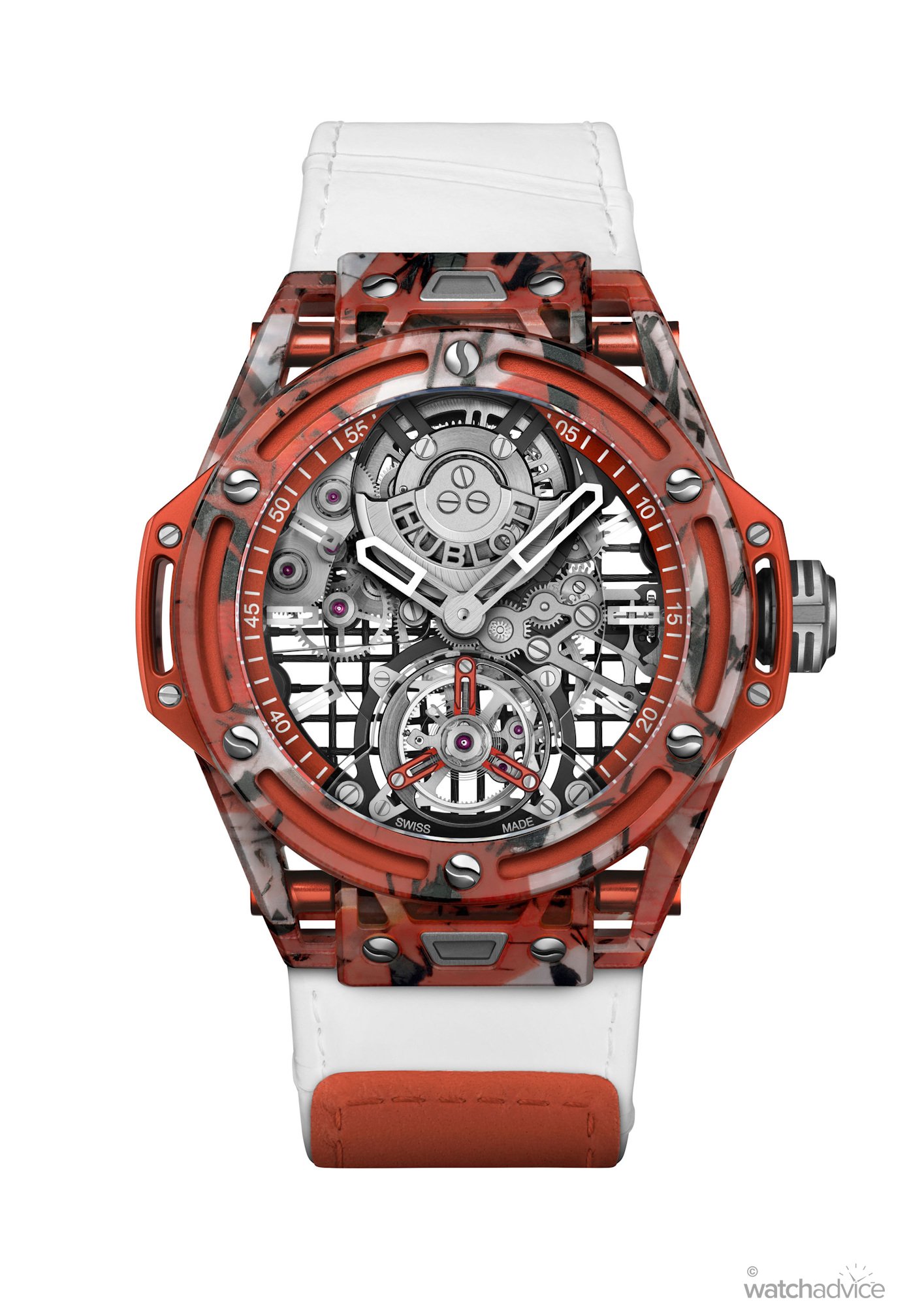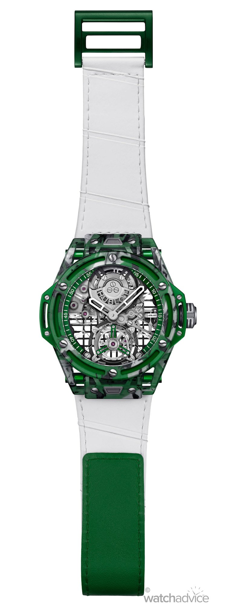 There are also subtle additions to this Big Bang Tourbillon that make it a remarkable tribute to the world of tennis. Firstly, the watches continue to point to Novak’s illustrious career in tennis, with the straps being made of white leather with white stitching that is also embossed, so that it gives the appearance of being padded and patterned like the grip tape on tennis racquets.