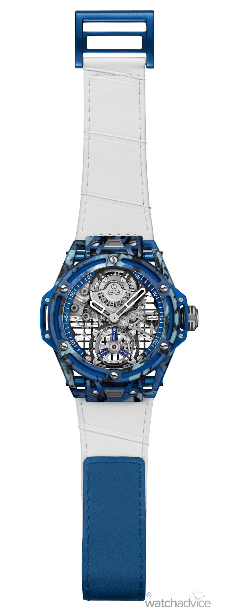 - Strap: White calfskin with grip tape patterned leather with blue Velcro® strap. An additional rubber strap is included.