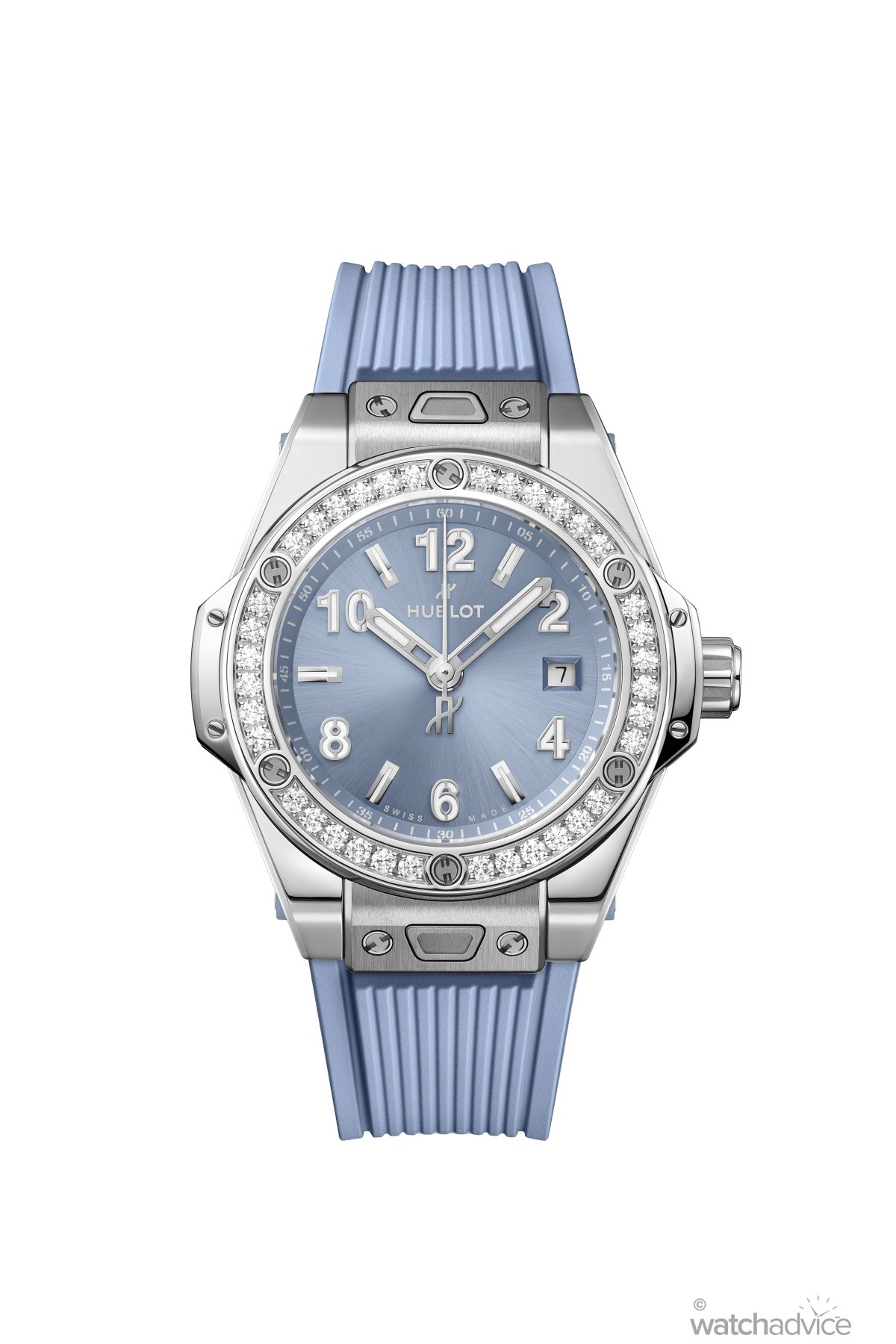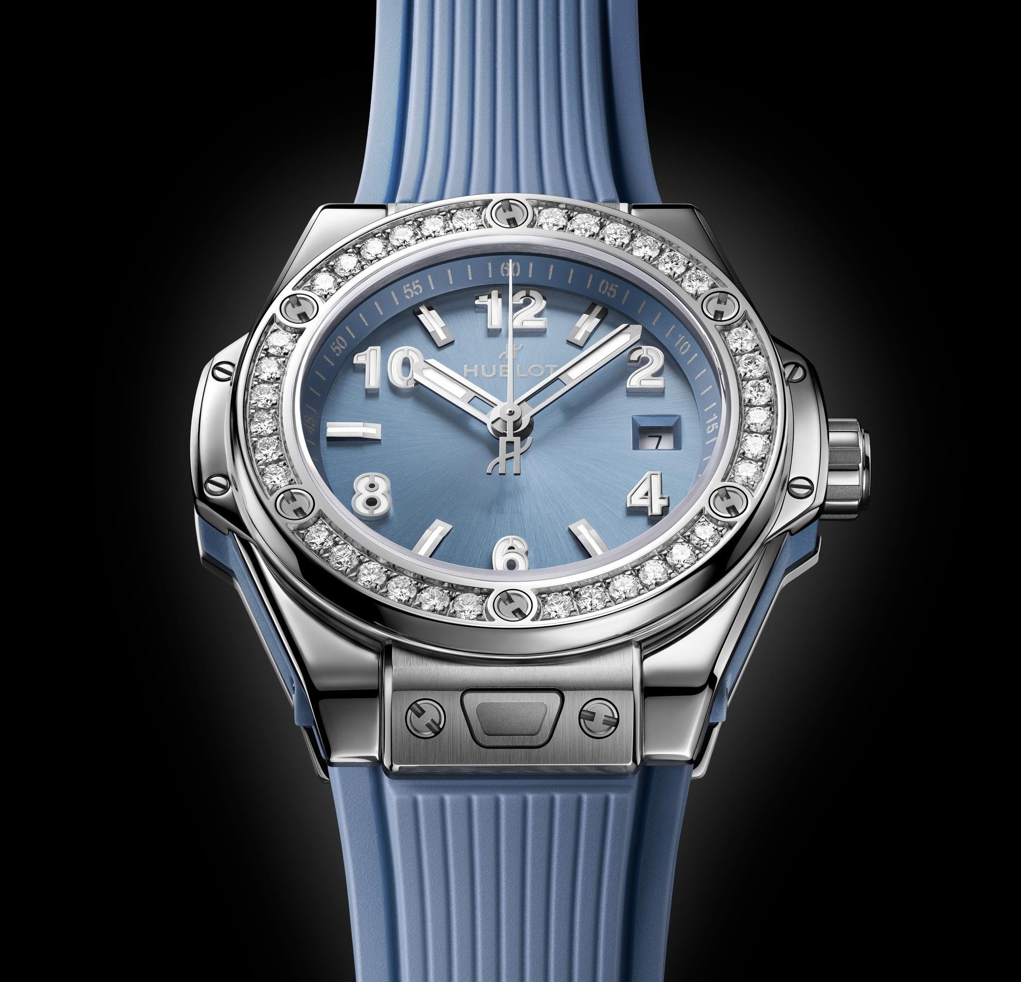 The ladies’ Big Bang One Click Coal Blue Diamonds is presented in a 33mm x 10.5mm case size, with the bezel being adorned with 36 diamonds (0.76 ct). The case features satin-finished and polished surfaces to present a timepiece of refined elegance. Unlike the Big Bang Original Unico Titanium Coal Blue, this model features a straight-lined rubber strap that adds a touch of sportiness to the elegant aesthetic.