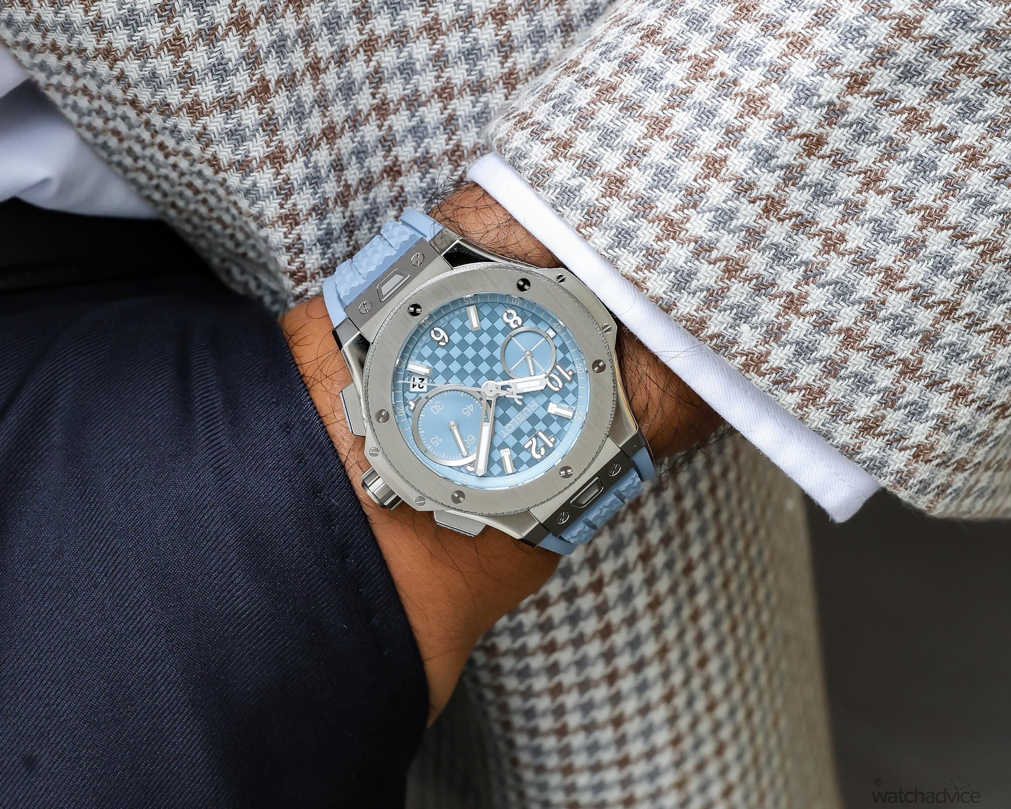 That’s why these new Coal Blue editions stood out to me so well. Before I had a chance to see them in person, the press images already gave an idea of the colour, which feels more refined and nuanced than Hublot’s usual palette. Seeing them in person, however, not only confirmed this first impression, but it was also more visually stunning thanks to the shifts in texture and tones from both the carbon-fiber-inspired geometric weave and the sunburst finish.