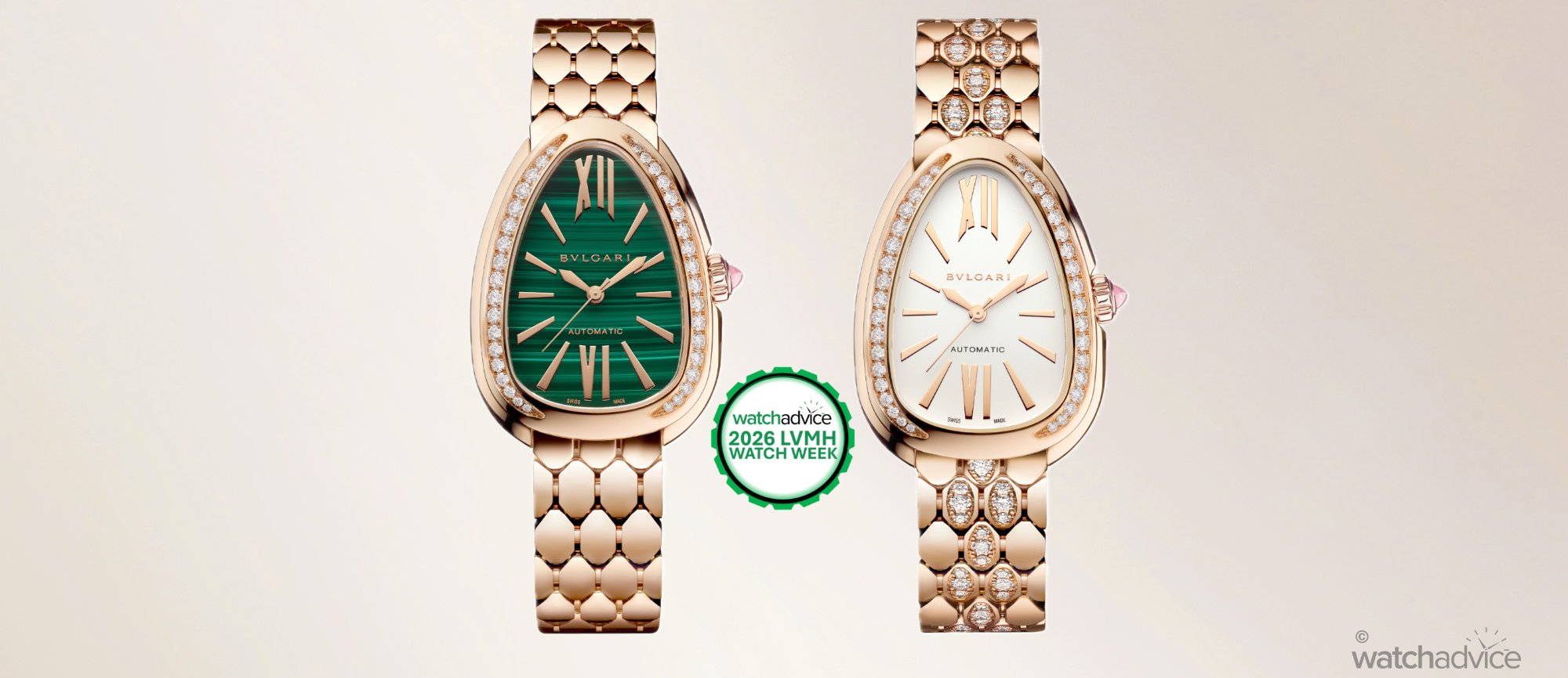 LVMH Watch Week 2026: Roman brand Bvlgari showcases two new stunning Serpenti Seduttori Automatic watches in Malachite and Opaline dials.