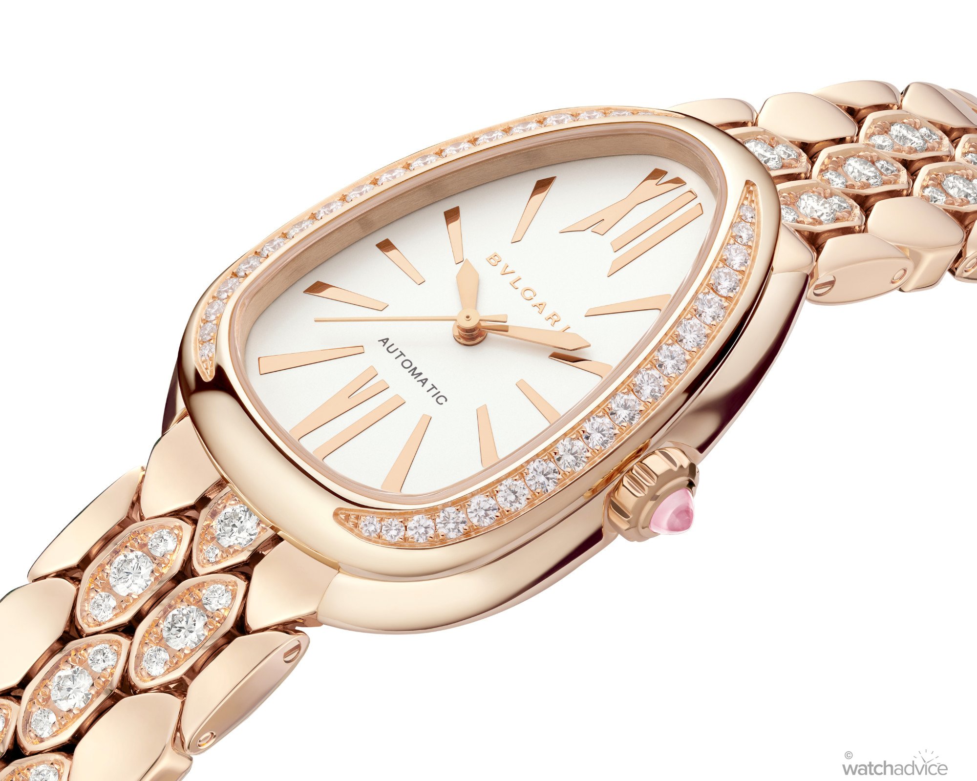 The cabochon-cut pink rubellite on the crown is just another refinement in the Serpenti Seduttori collection
