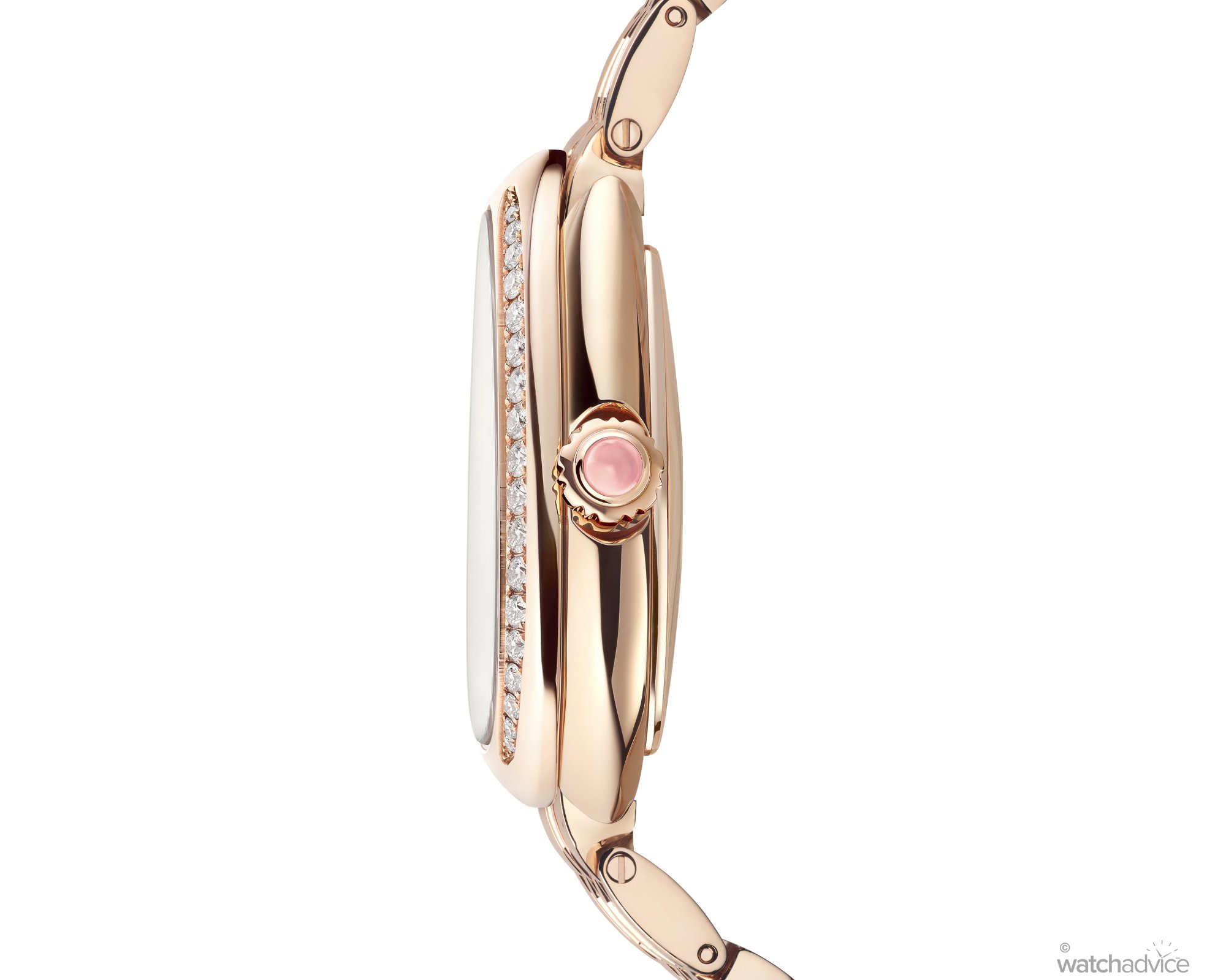 With this model, you also have a snakeskin-like flat 18k rose gold bracelet that fits like a second skin. I’ve tried these on, and while not my style, the watch does slink around the wrist. For anyone lucky enough to have one adorn their wrist, they will know what I mean. Adding to the charm is the cabochon-cut pink rubellite that sits on the crown, adding to the overall look of the watch in a subtle and elegant way.