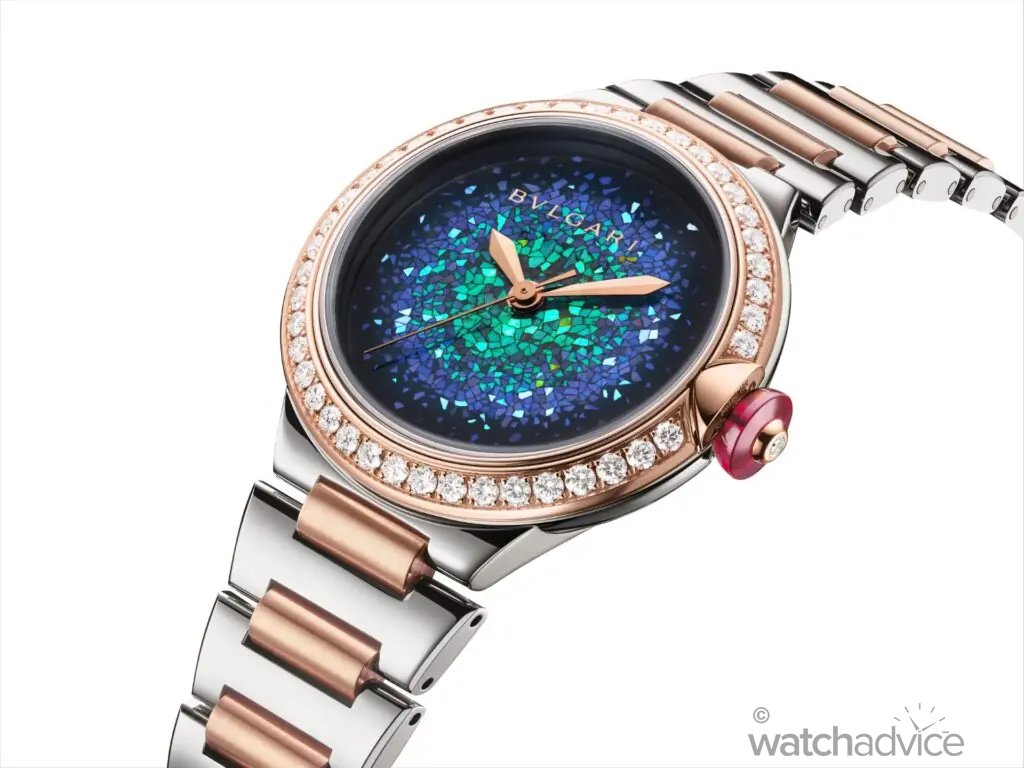 As Bvlgari states, “this ancestral art consists of embedding minute fragments of mother-of-pearl or gold to form intricate motifs. Against the Urushi lacquer’s profound black, each of these mother-of-pearl fragments comes to life in a shimmering play of light.” The design of these dials perfectly fits in with the theme of the Lvcea collection, where light is not just a visual element, but the very essence of the watch’s identity.
