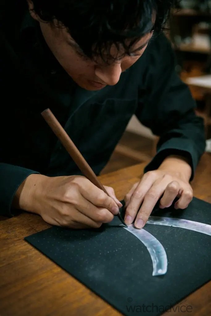 “One by one, Asai selects the tiniest fragments of mother-of-pearl — chosen for their iridescence and their shape — to compose a vibrant mosaic that, after a final polish, emerges fromthe darkness of the lacquer. Sixty days of meticulous effort result in one dial, each entirely unique, and each a symbol of eternity.”