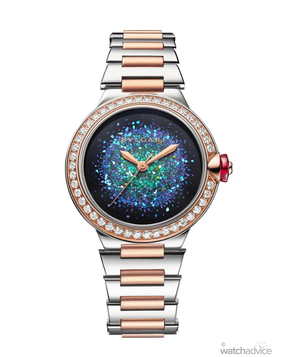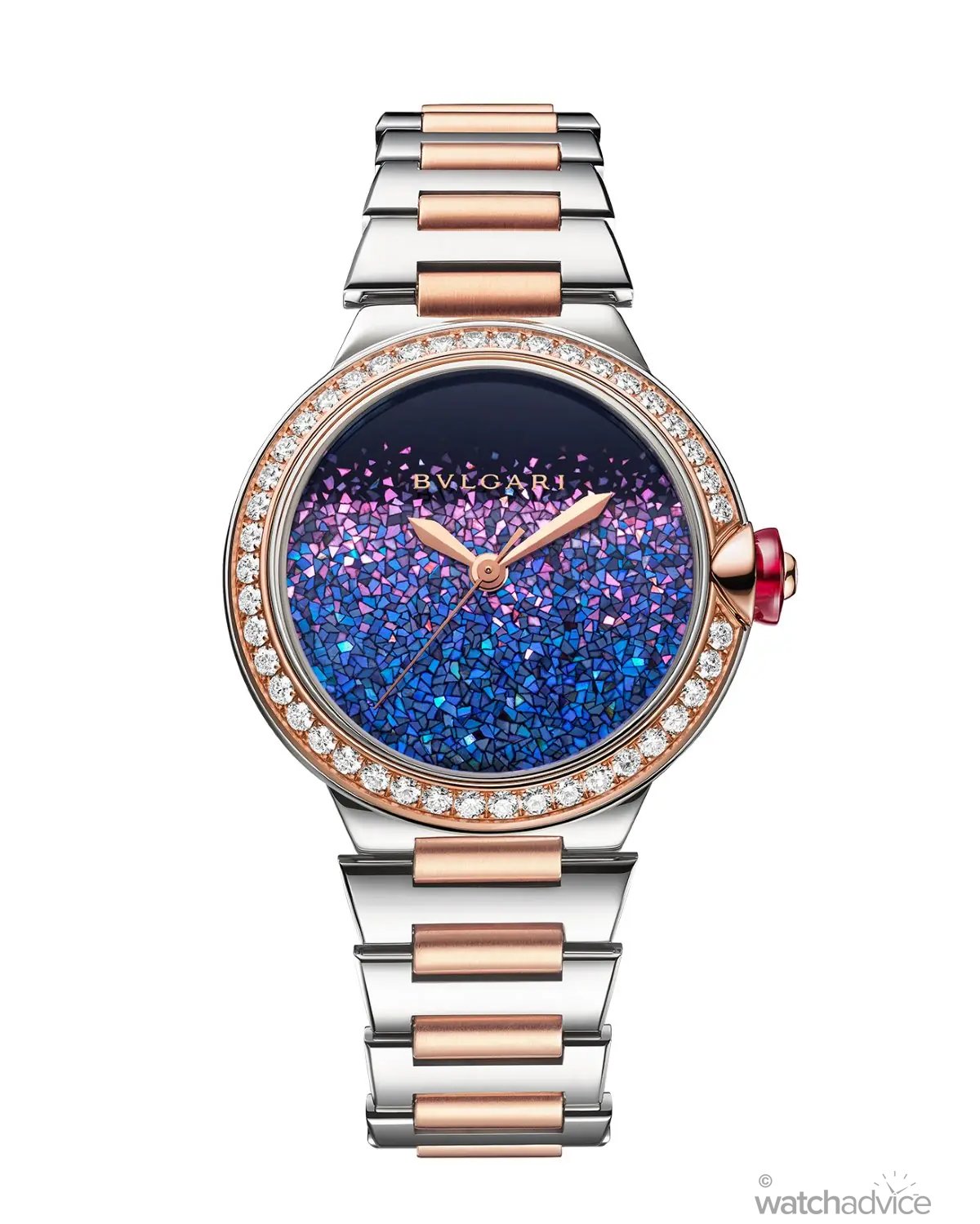 - Case: 43mm two-tone stainless steel and rose gold case. Bezel features round brilliant-cut diamonds (1.075 cts). Crown features a synthetic pink sapphire cabochon, set with a diamond (0.02ct).