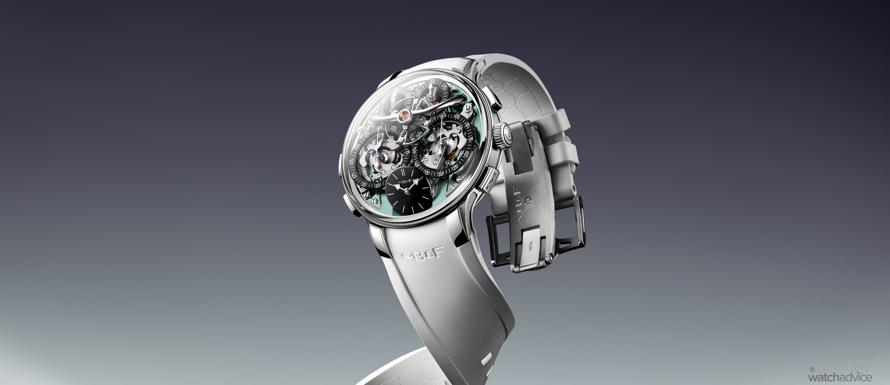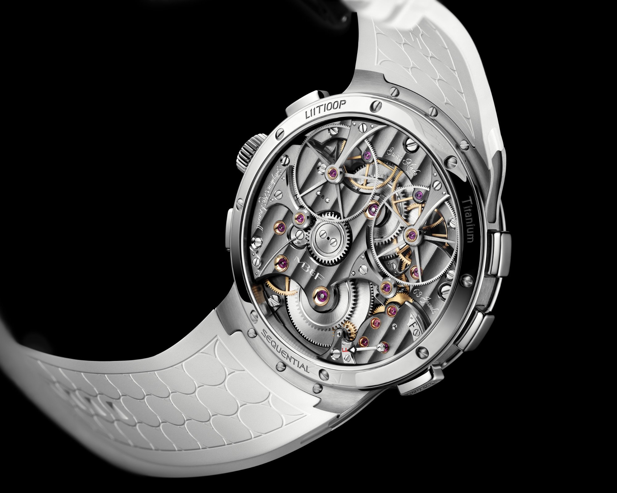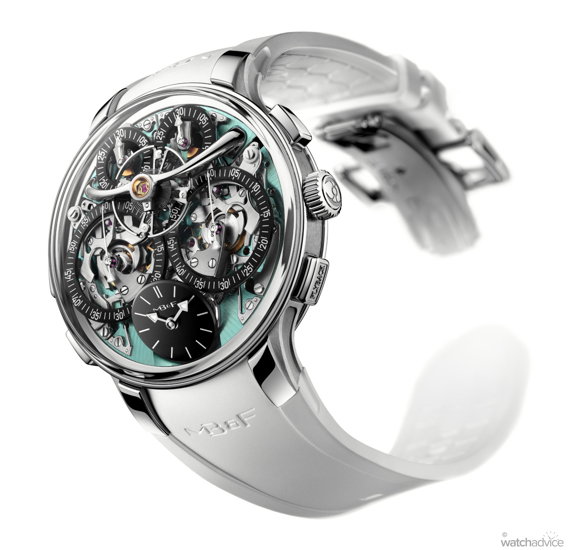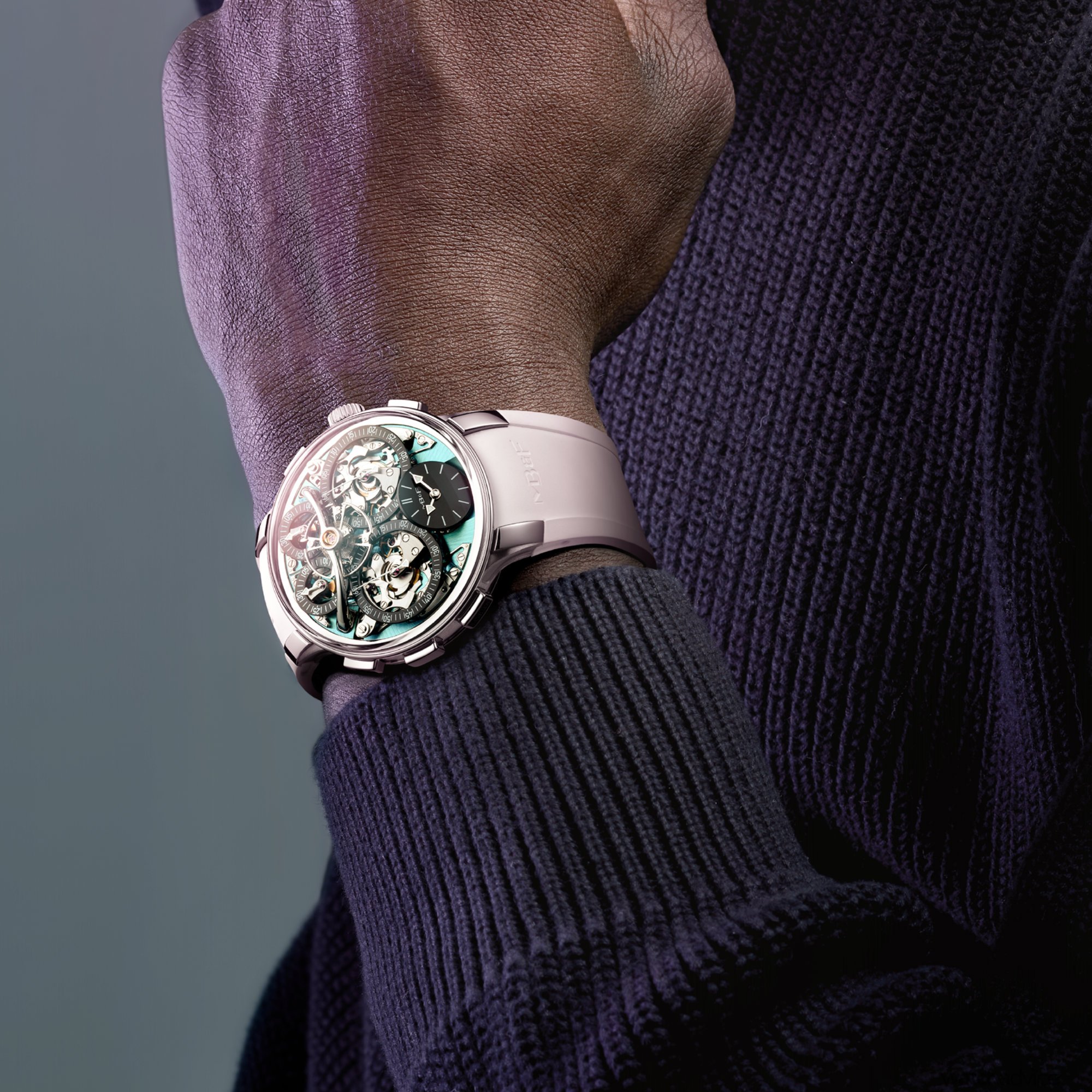 As with all EVO models, this version is designed for more active wear. You get 80 metres of water resistance, a screw-down crown, an integrated rubber strap, and MB&F’s proprietary FlexRing shock-absorption system, which isolates the movement from vertical and lateral impacts.