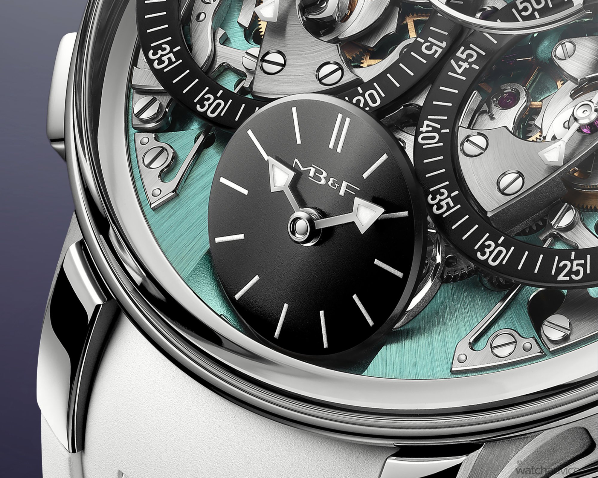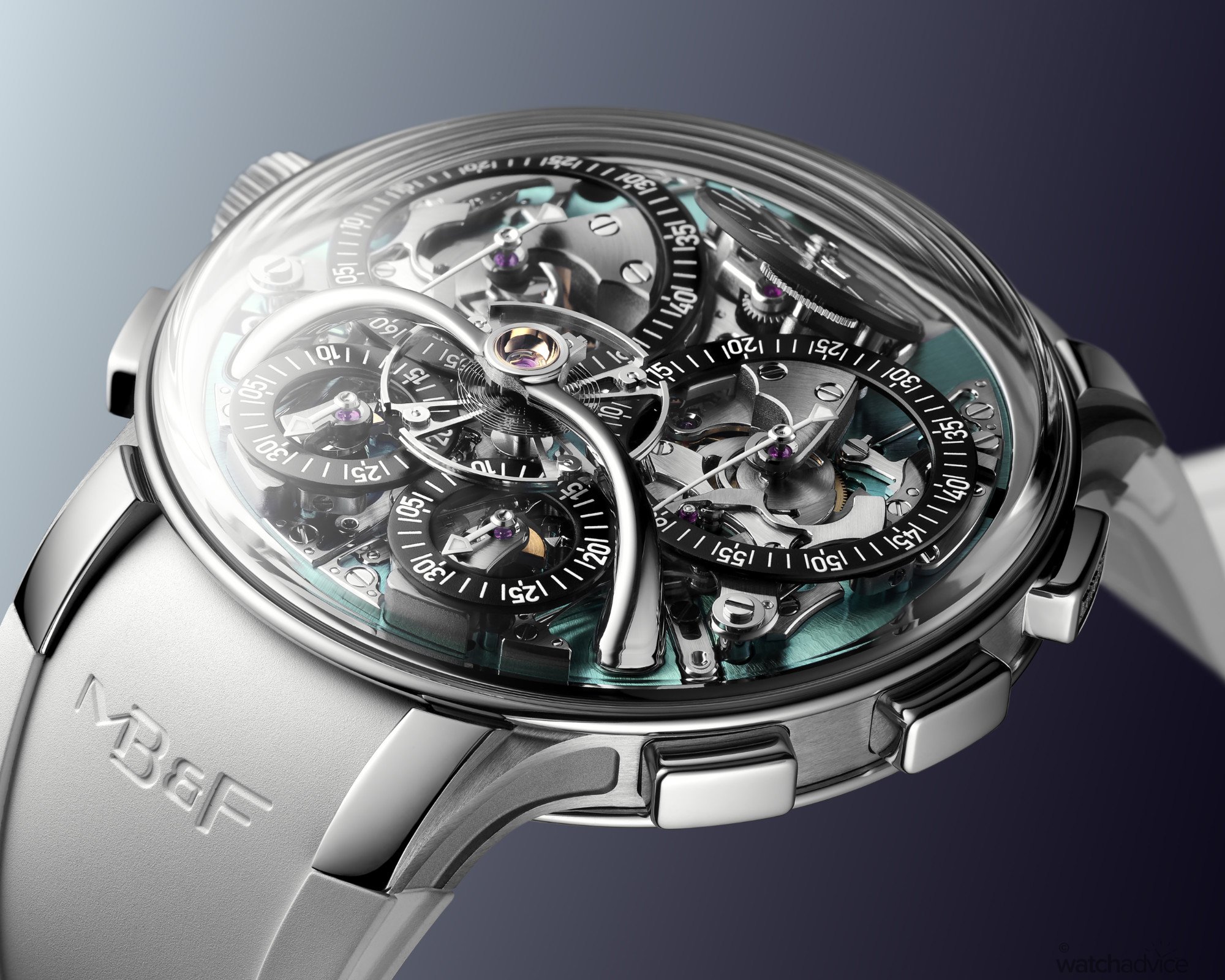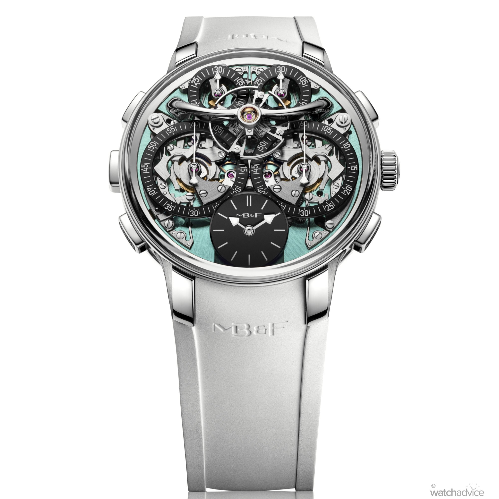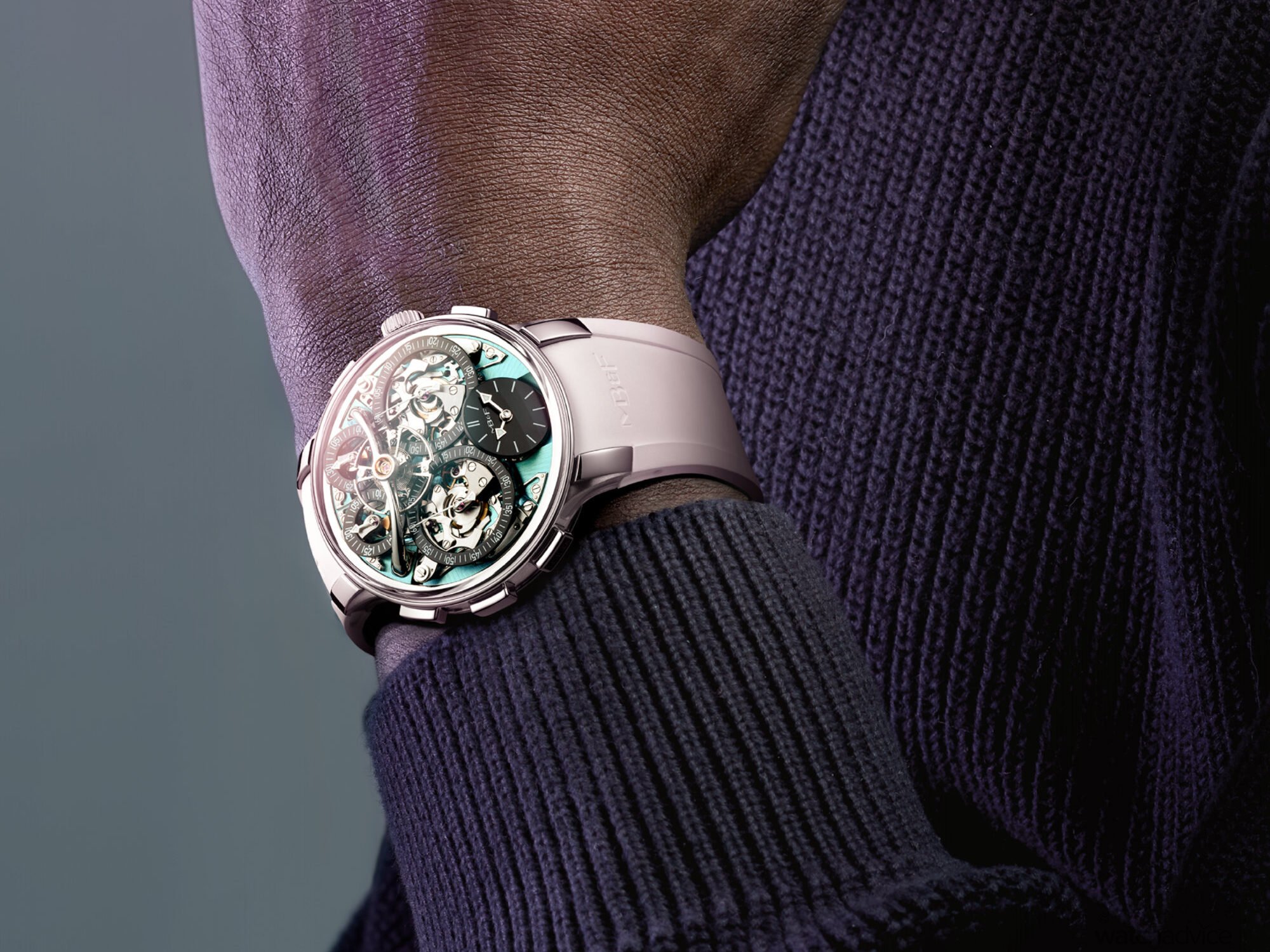 As with all EVO models, this version is designed for more active wear. You get 80 metres of water resistance, a screw-down crown, an integrated rubber strap, and MB&F’s proprietary FlexRing shock-absorption system, which isolates the movement from vertical and lateral impacts.