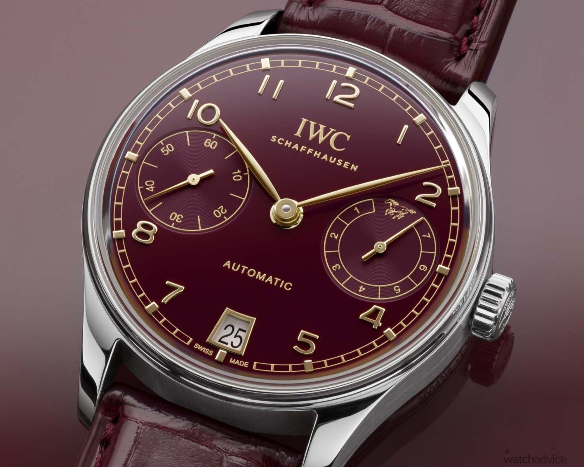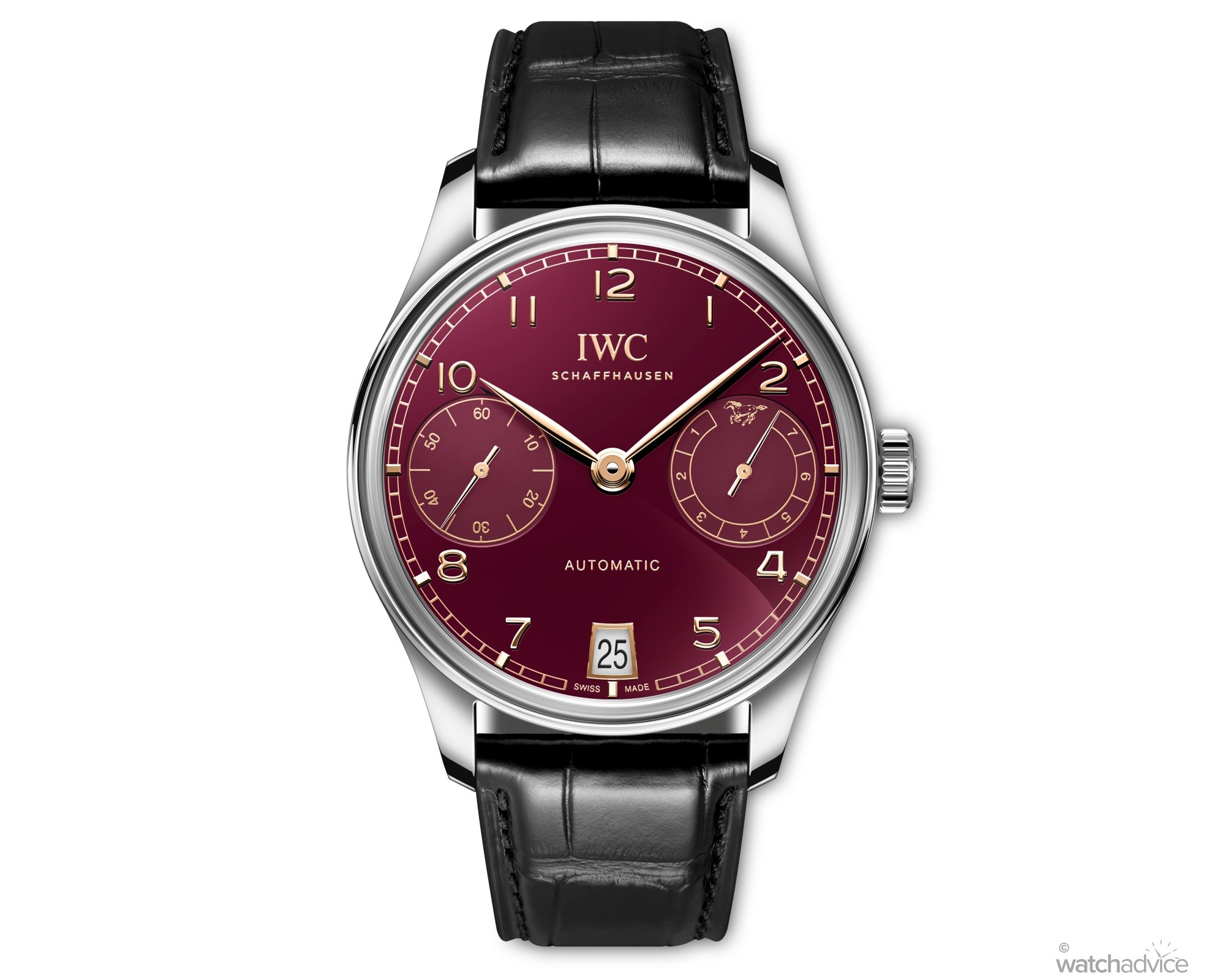 - Strap: Black OR burgundy alligator leather strap with steel deployant buckle