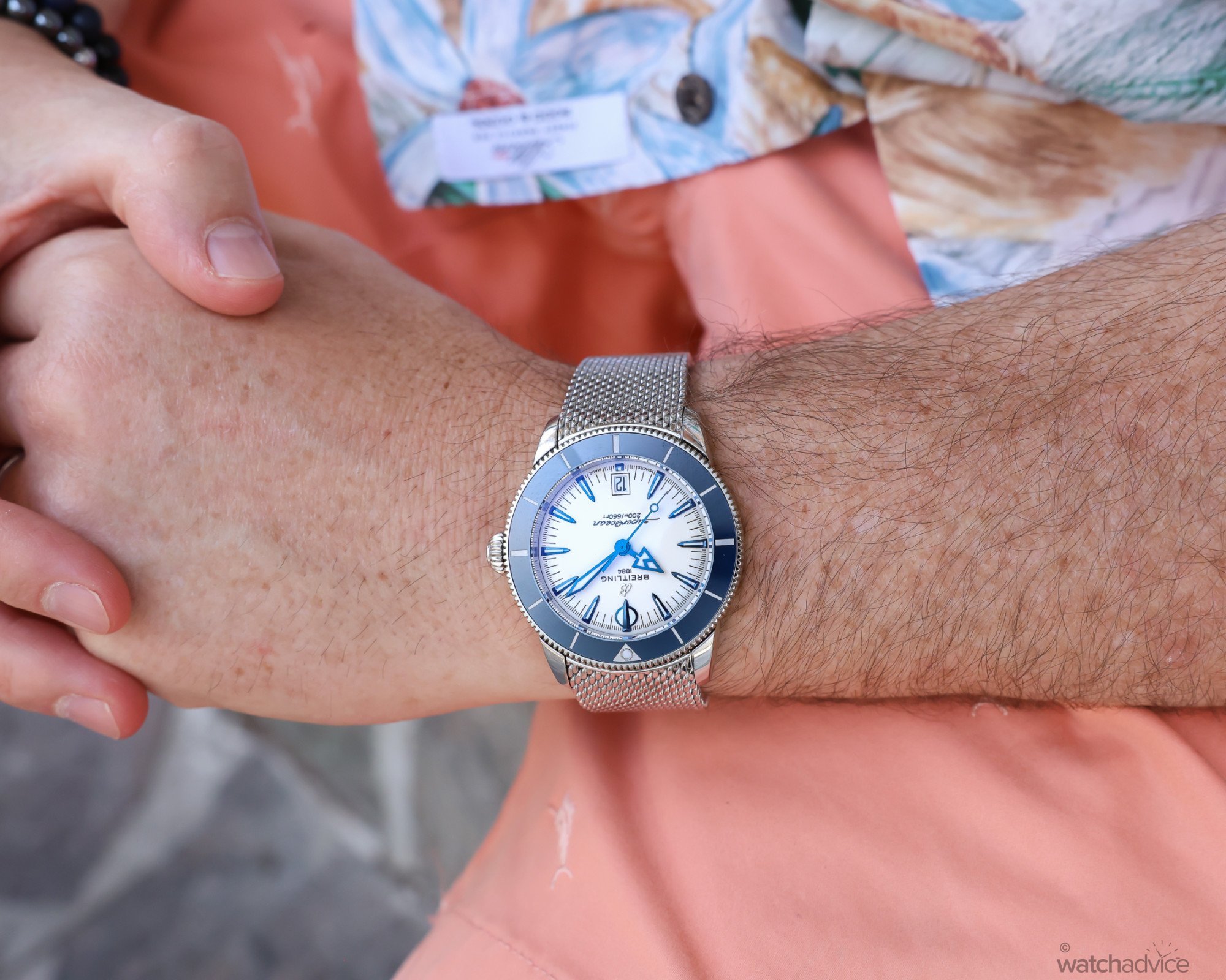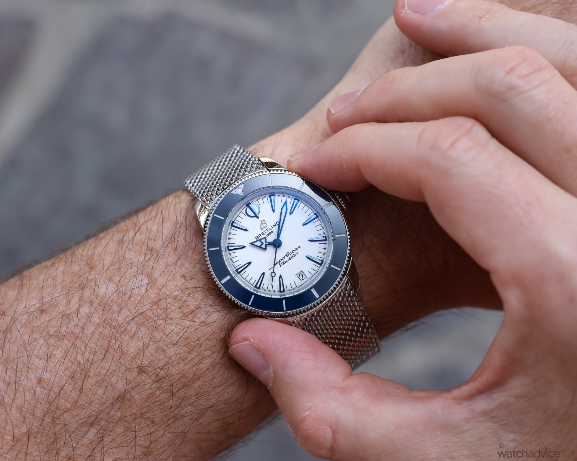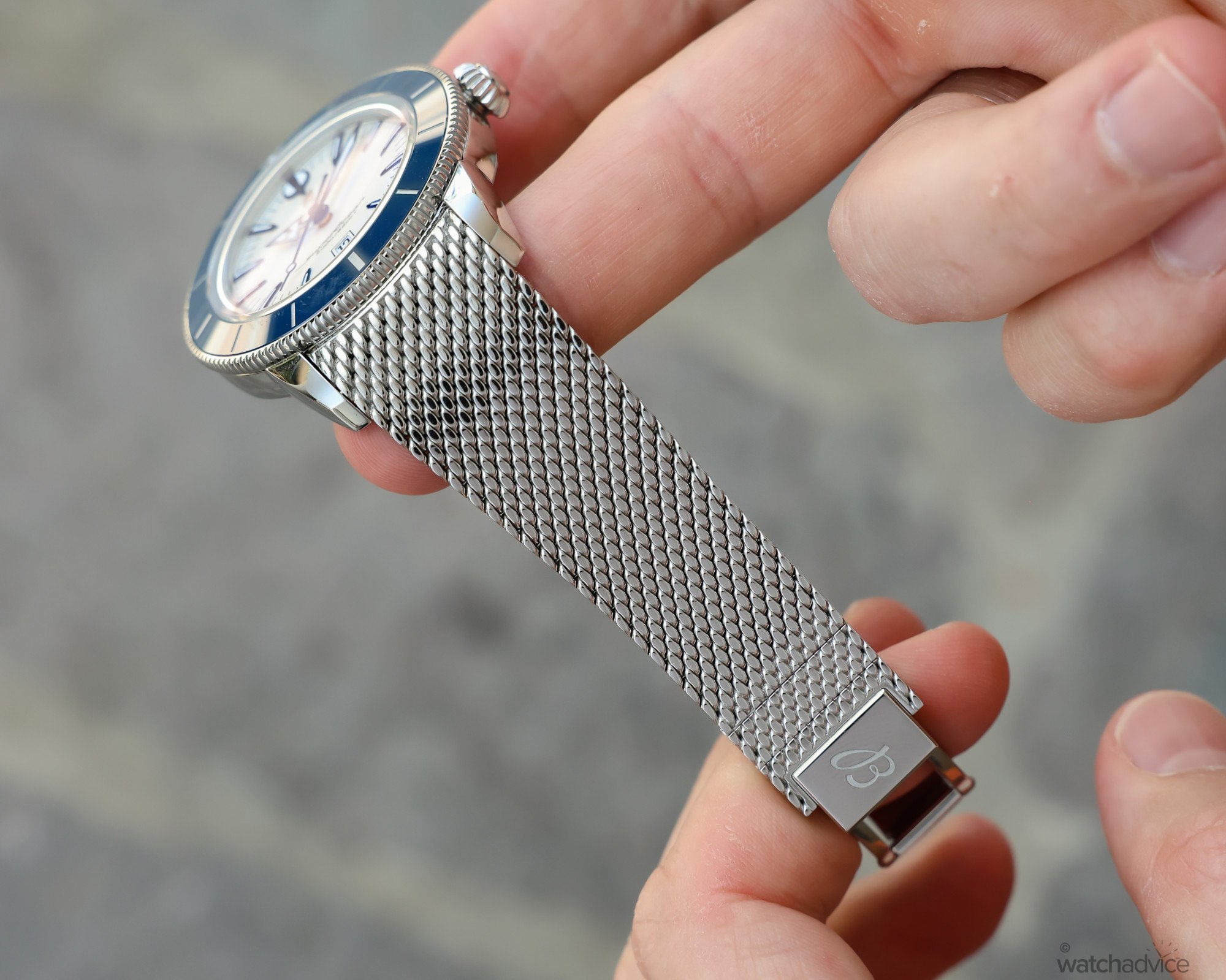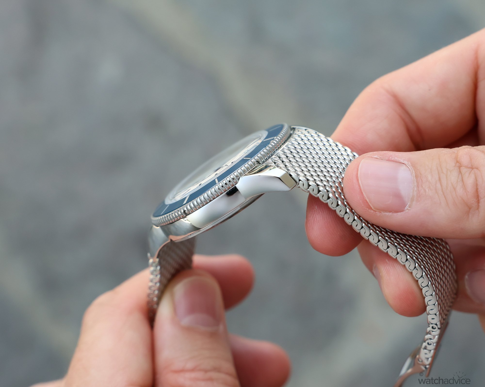 With the previous SuperOcean Heritage collection, the bracelet wasn’t contoured to the case. It was just fitted with the spring bars as you would any other type of strap. The new Milanese bracelets do, however, have a fitted end link that contours to the case properly. This actually helps stabilise the watch on the wrist, as a result, it doesn’t move around as much, and it provides better security.