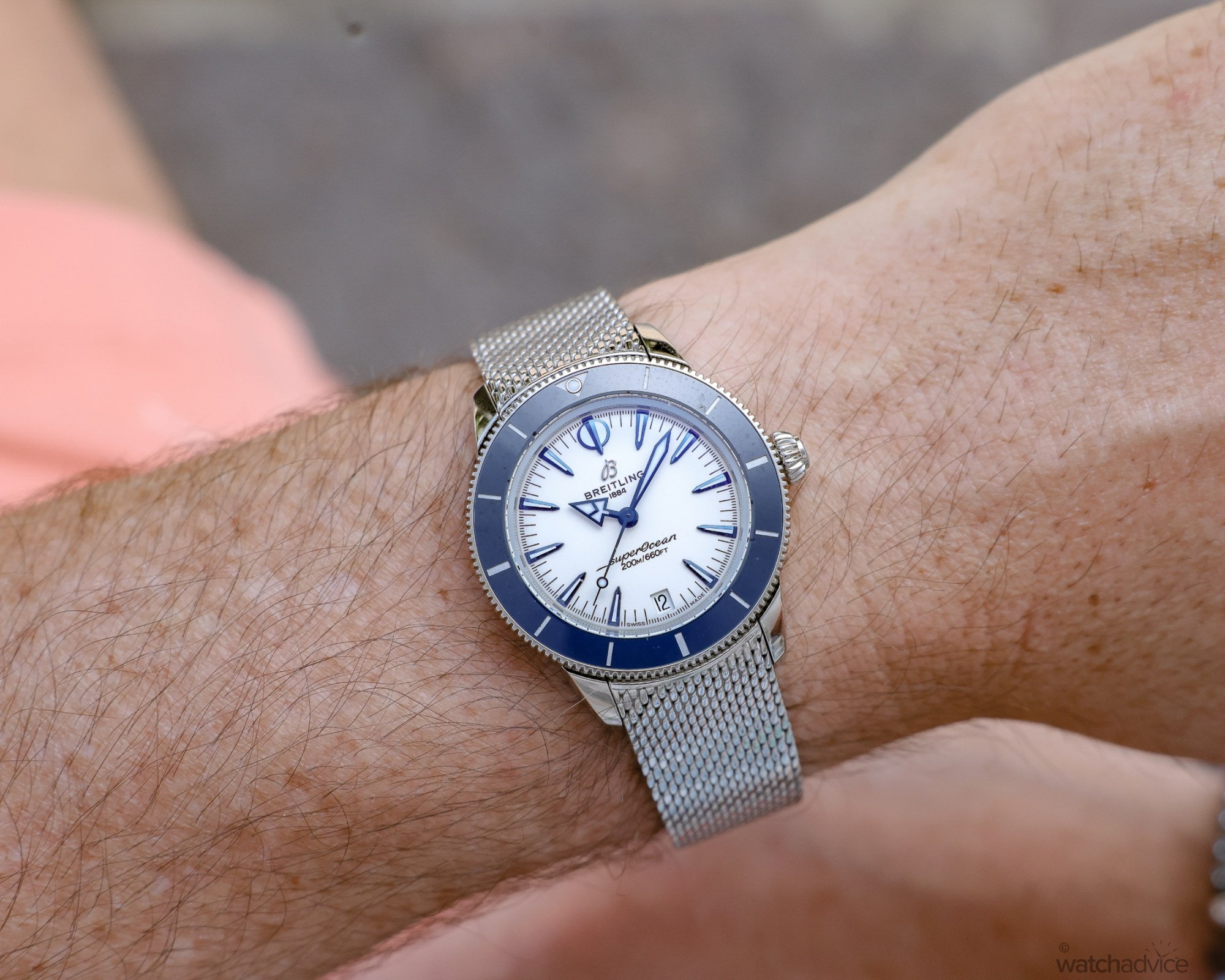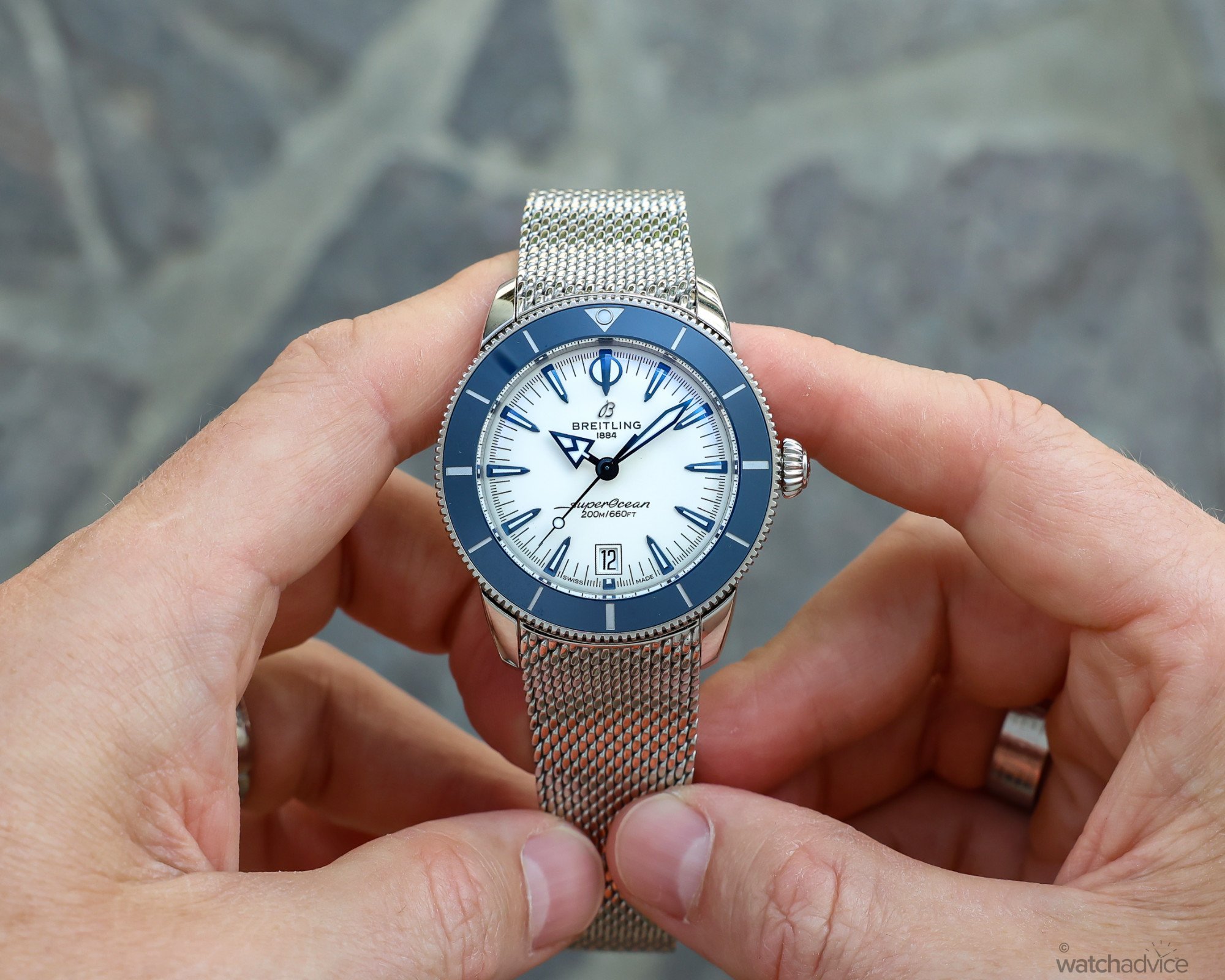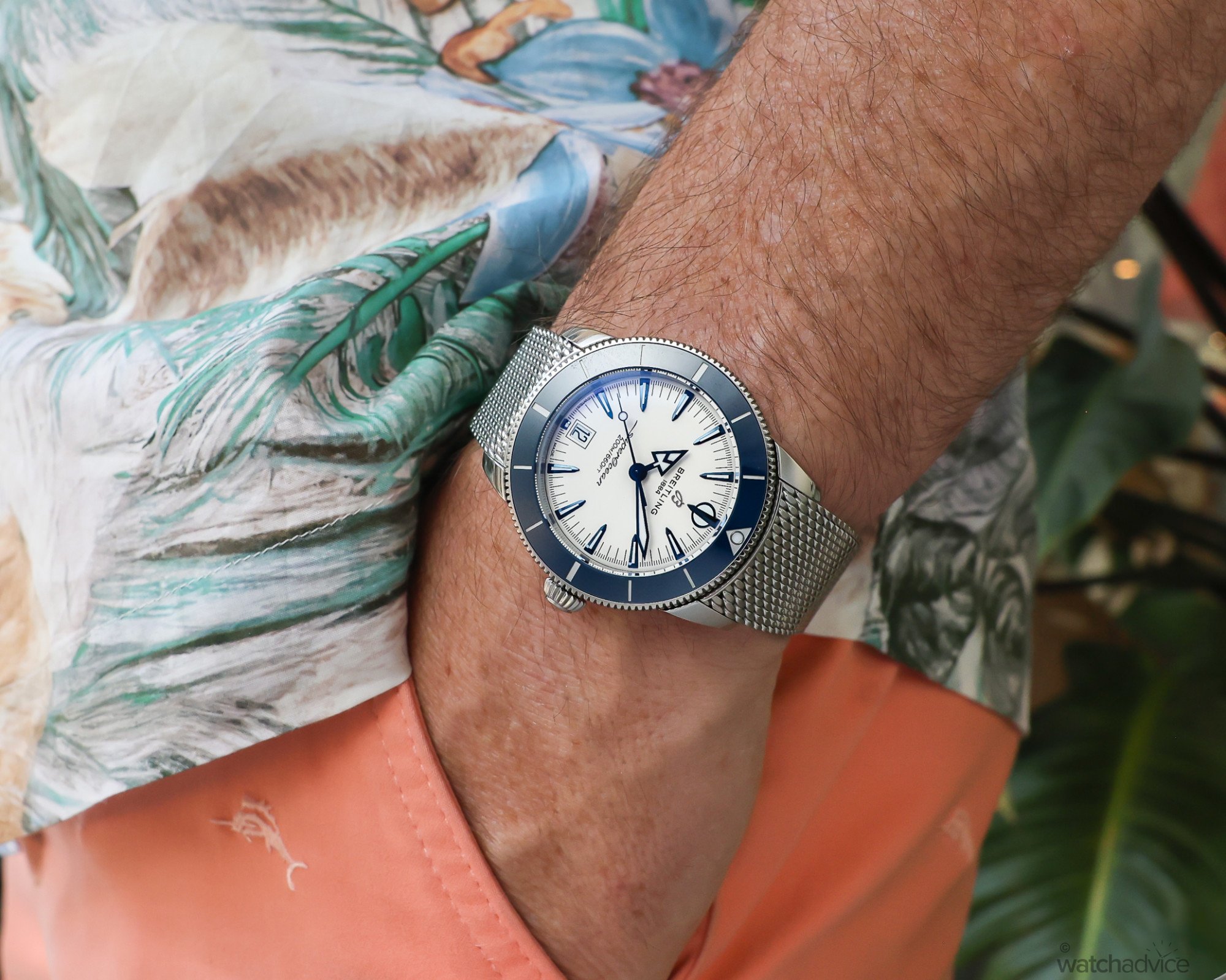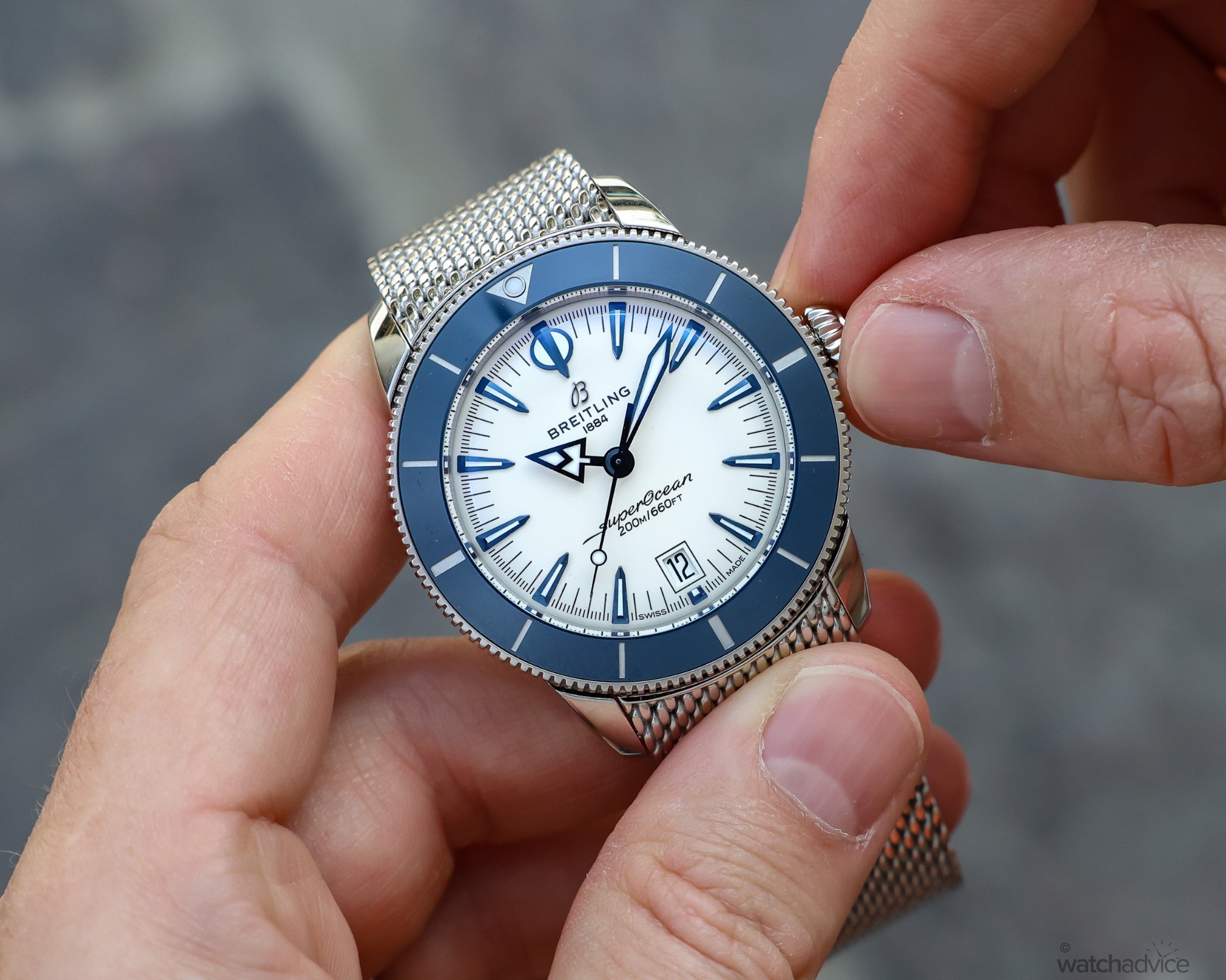 With the previous SuperOcean Heritage collection, the bracelet wasn’t contoured to the case. It was just fitted with the spring bars as you would any other type of strap. The new Milanese bracelets do, however, have a fitted end link that contours to the case properly. This actually helps stabilise the watch on the wrist, as a result, it doesn’t move around as much, and it provides better security.