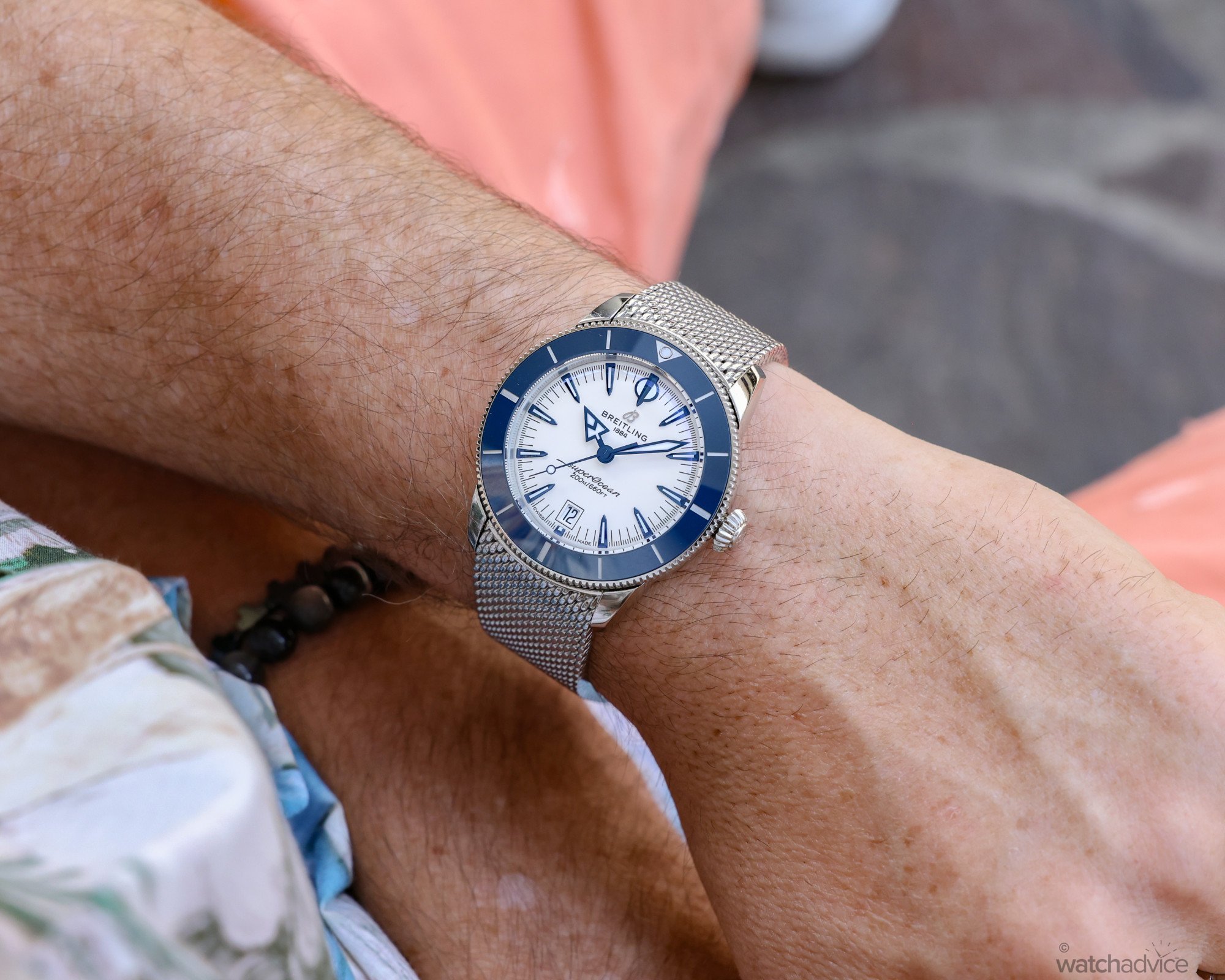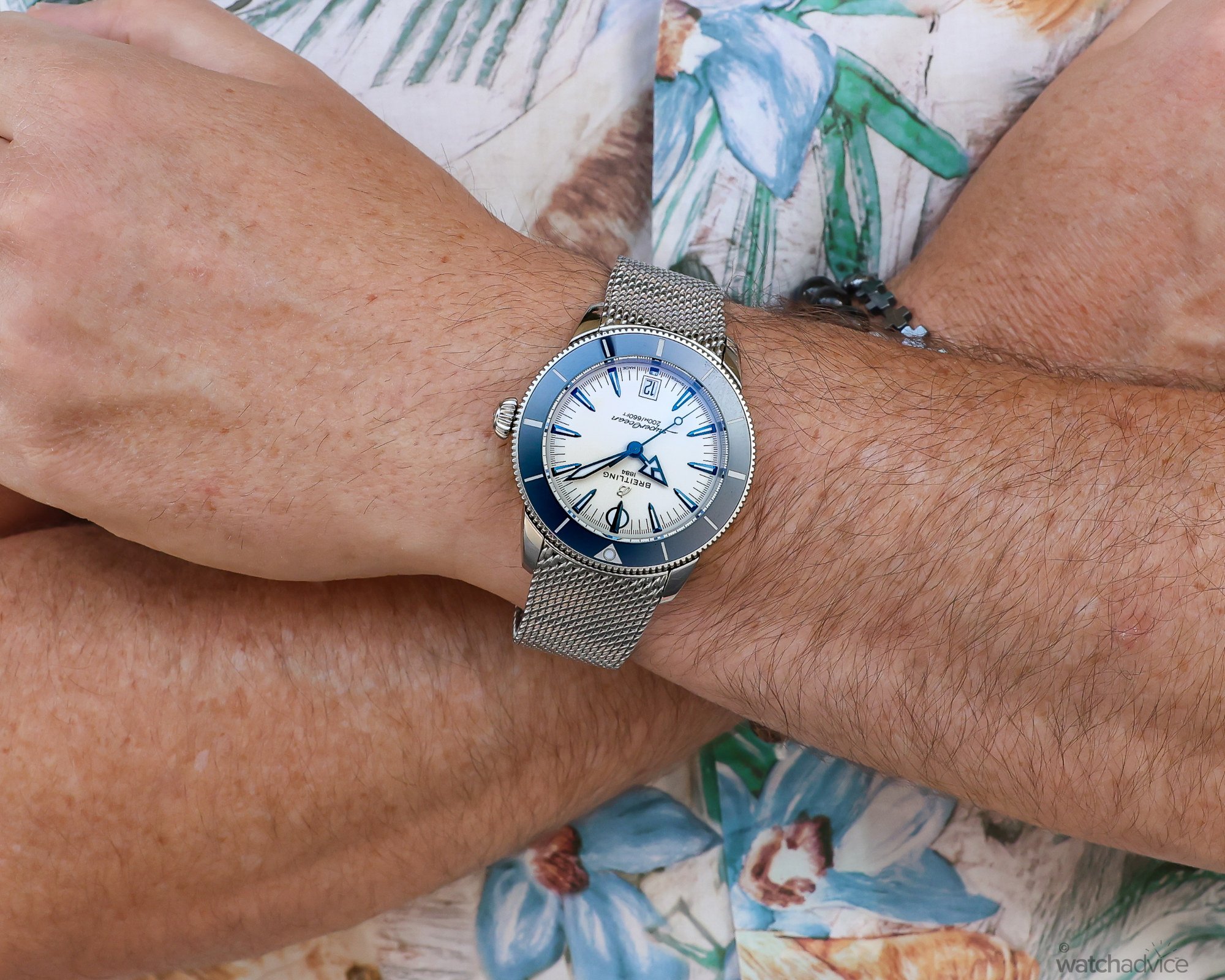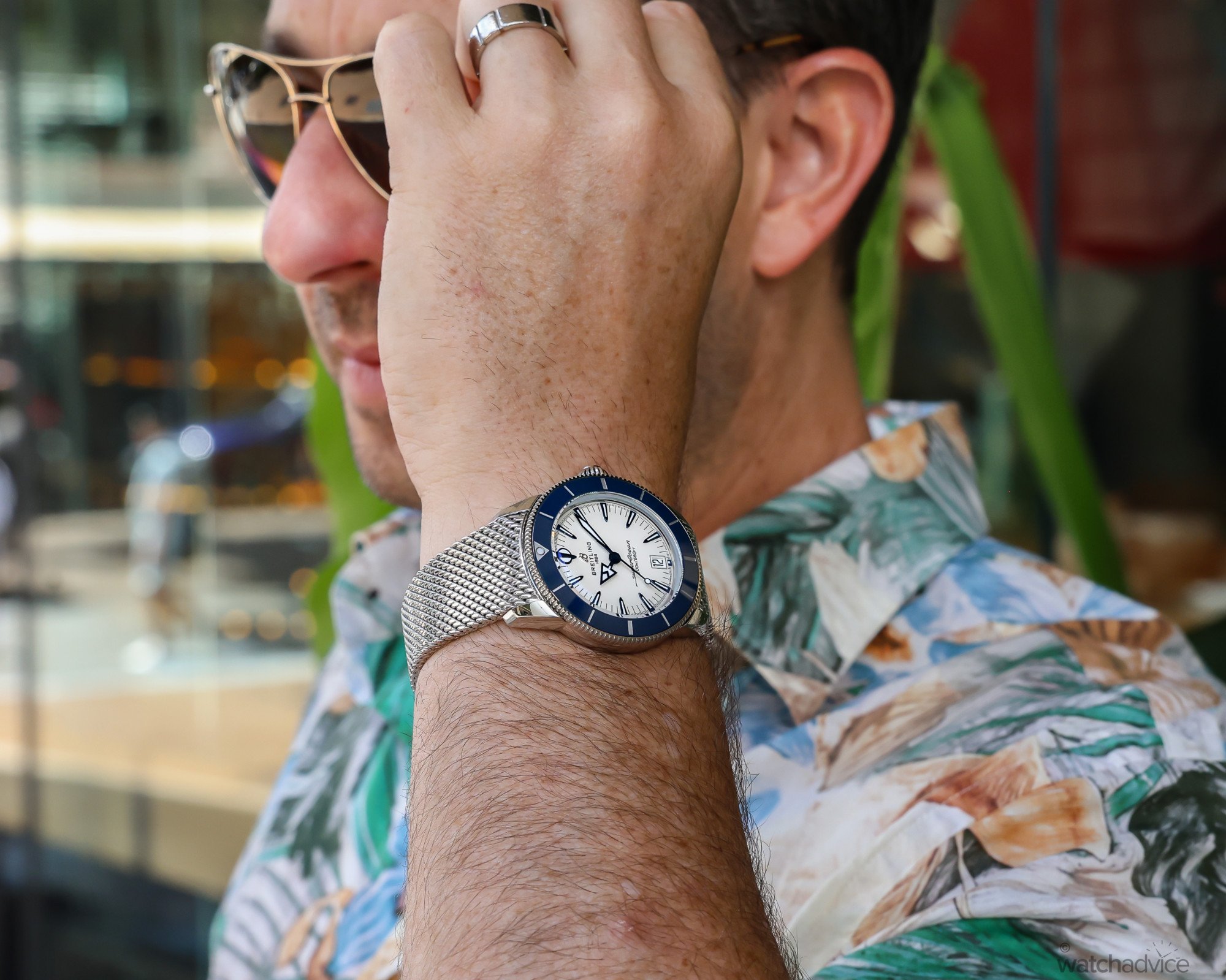 In my last review on the SuperOcean Heritage, I did look at the three larger models, two on the rubber and one on the Milanese. I did gravitate towards the 44mm we had, purely from a looks perspective with the blue and gold, but felt the 42mm was the better size for my 17.5cm wrist. This time, the 42mm was really my focus, and on the Milanese, I had a chance to wear it and test it out more than the rubber strap, which I wore last year. One word: Smooth!