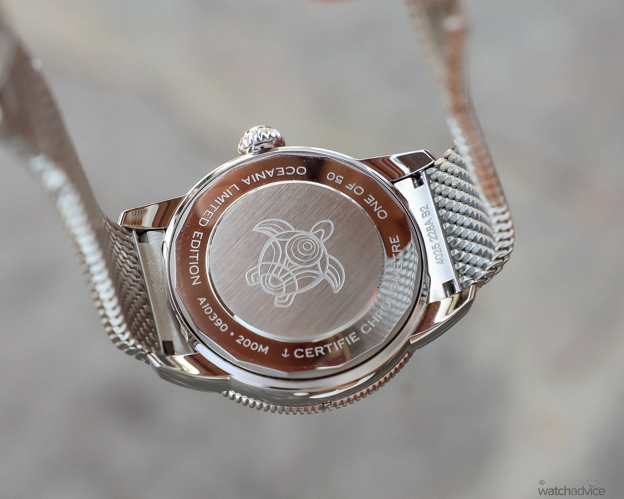 - Case back: 42mm – Sapphire case back with anti-reflective coating & Sea turtle motif / 36mm – closed caseback with sea turtle engraving