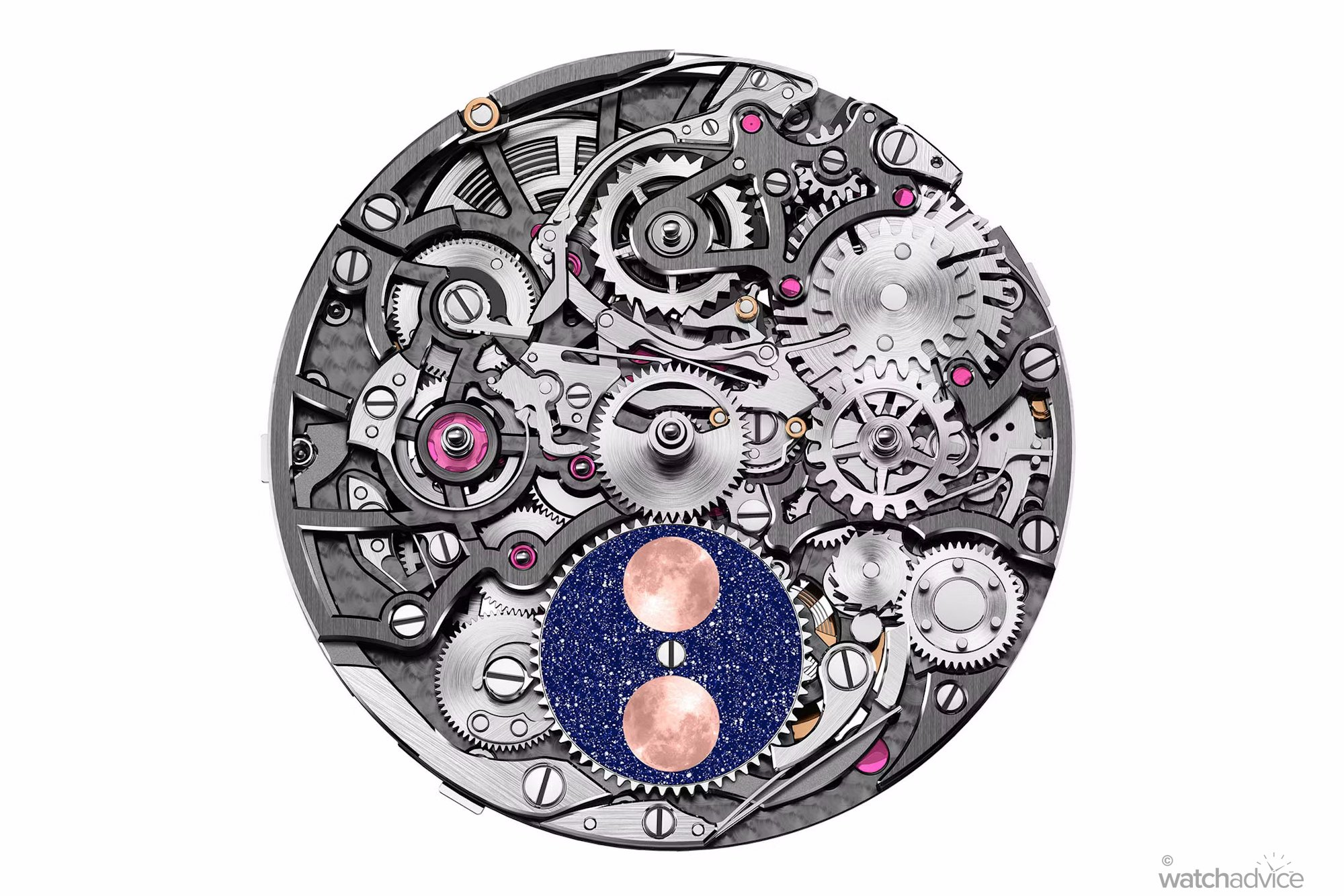 • Dial: Openworked dial showing perpetual calendar complications. Moonphase indicator made from blue aventurine glass. 18-carat pink gold indices and hands.