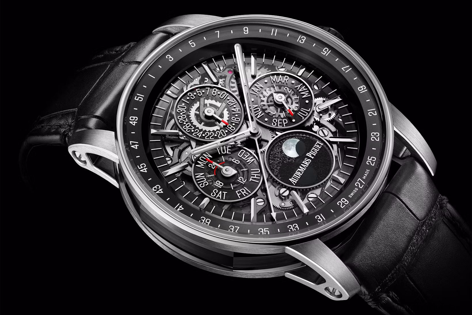 • Dial: Openworked dial showing perpetual calendar complications. Moonphase indicator made from black aventurine glass. 18-carat white gold indices and hands.