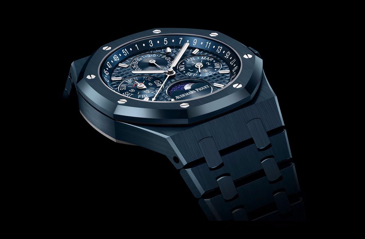 The third Perpetual Calendar unveiled in Audemars Piguet’s latest wave of releases is the non-skeletonised Royal Oak, presented in a striking ceramic case and bracelet. Presented in a 41mm x 9.5mm case constructed in “Bleu Nuit, Nuage 50” ceramic, this Royal Oak Selfwinding Perpetual Calendar provides impressive scratch resistance and durability while also providing a contemporary aesthetic. The case features a mixture of vertical brushed finishes and polished finishes, adding to its sleek, refined look.