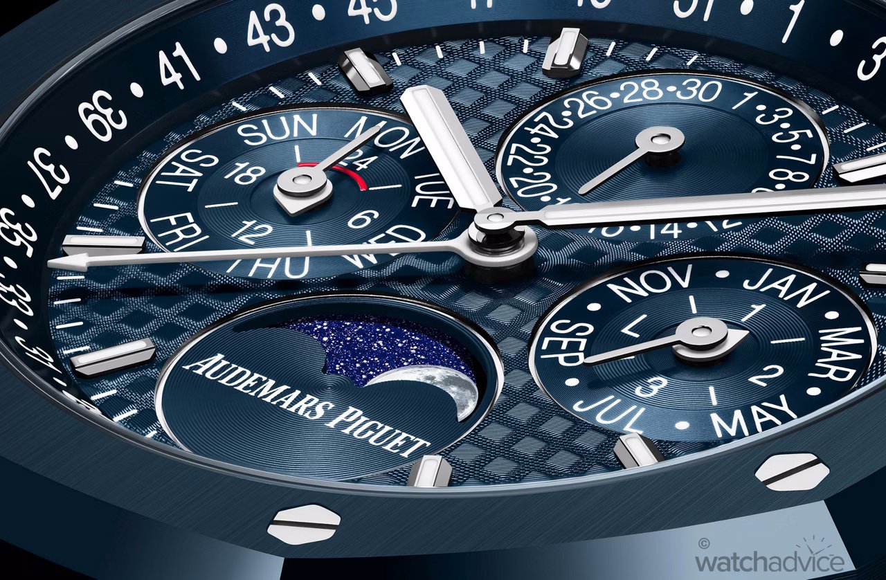 This new system allows every perpetual calendar indication (date, day, month, leap year, moonphase, and week) to be adjusted entirely by the crown alone. This adjustment method is the result of several patented innovations and a very complex crown mechanism developed by Audemars Piguet to control each calendar function. While there are other brands with crown-set perpetual calendars, Audemars Piguet’s traditional layout with moonphase and full calendar indications, while also being a 4.1mm thick movement, presents an enormous leap forward for the perpetual calendar complication.