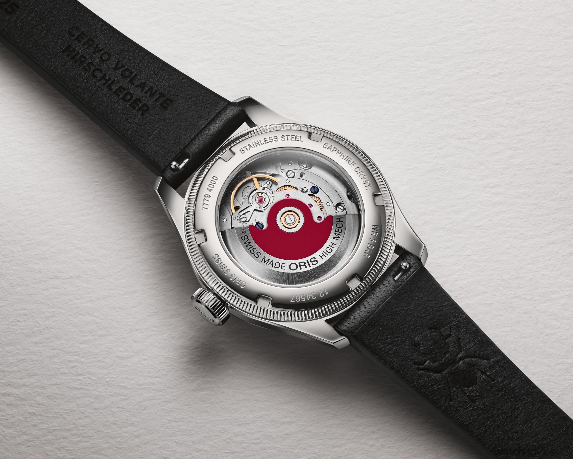 Mechanically, it’s not ground-breaking, but Oris has long been known more for reliability than spectacle. Visible through the transparent caseback is the Calibre 754, an automatic movement beating at 4Hz (28,800VpH) with a 41-hour power reserve. Based on the Sellita SW200 architecture, it has been regulated to meet Oris’ standards. It also carries the brand’s signature touch: the bright red rotor, a hallmark on many calibres.