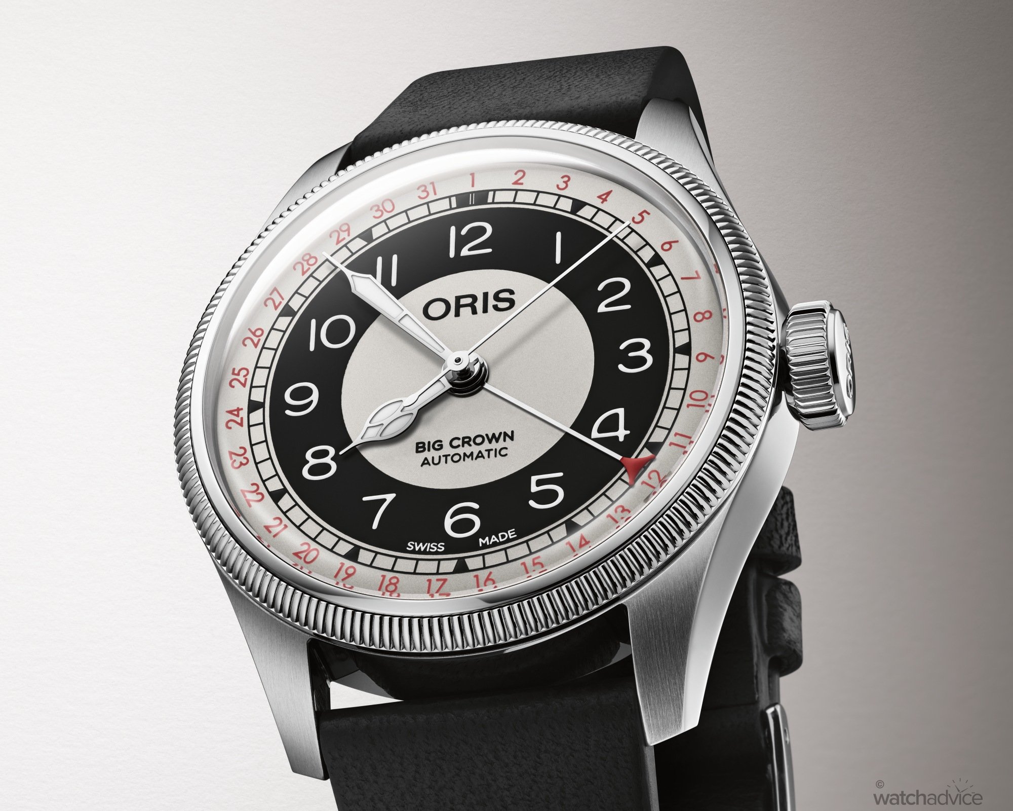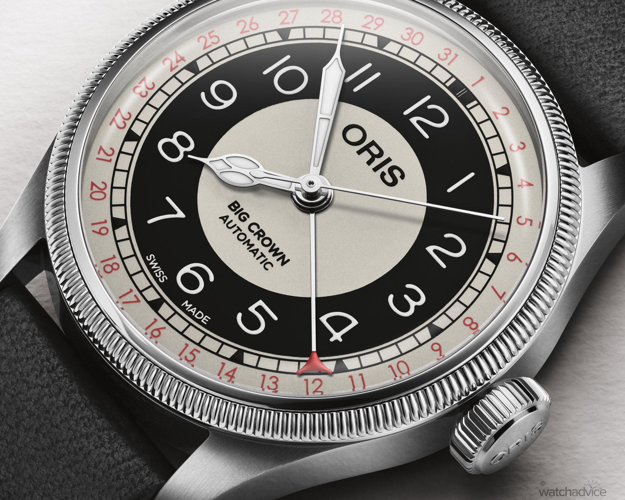 The Bullseye sector dial is composed of four concentric rings: three in off-white/grey and one in black. Red Arabic numerals run around the periphery from 1 to 31, indicating the date via a matching red-tipped pointer hand.