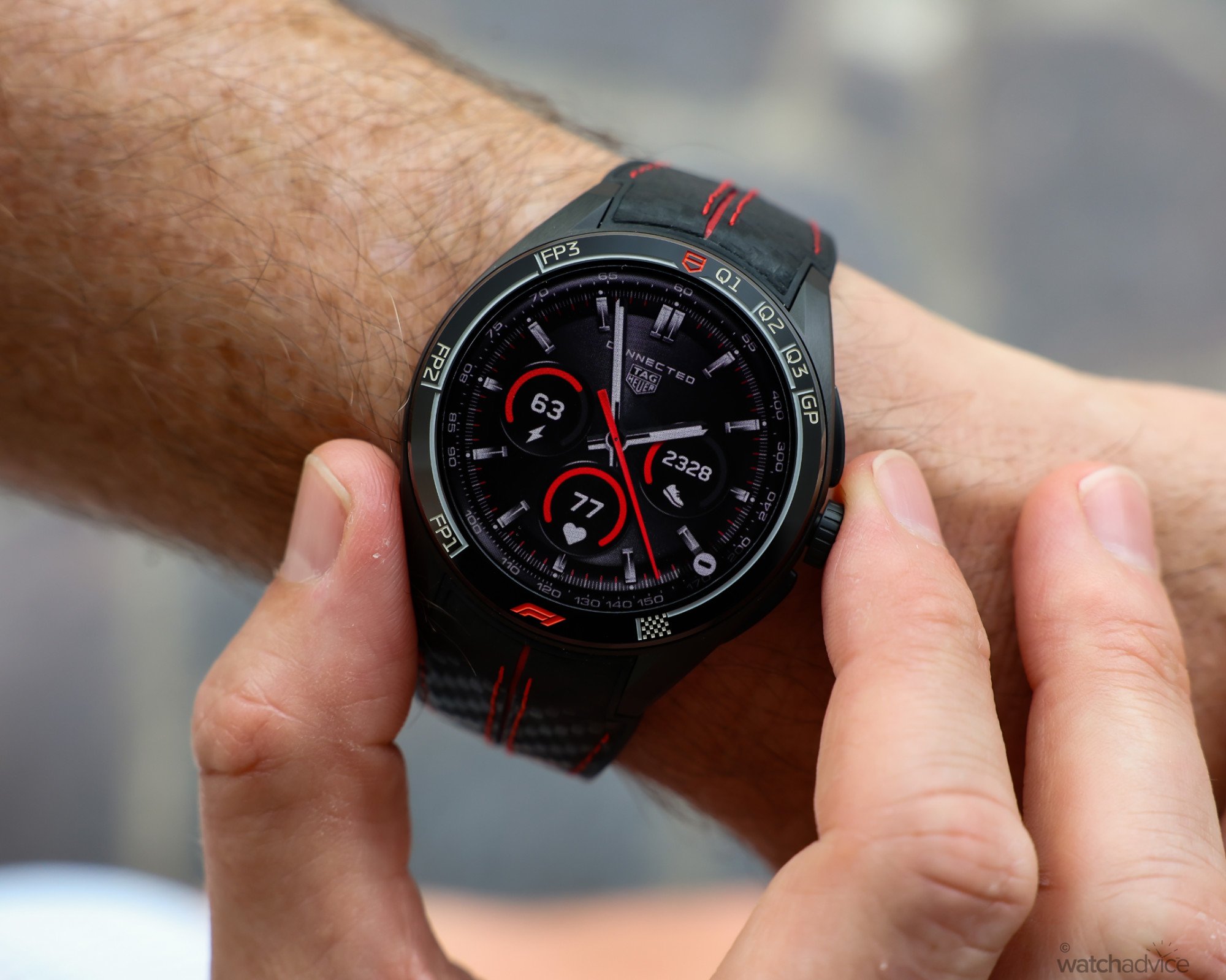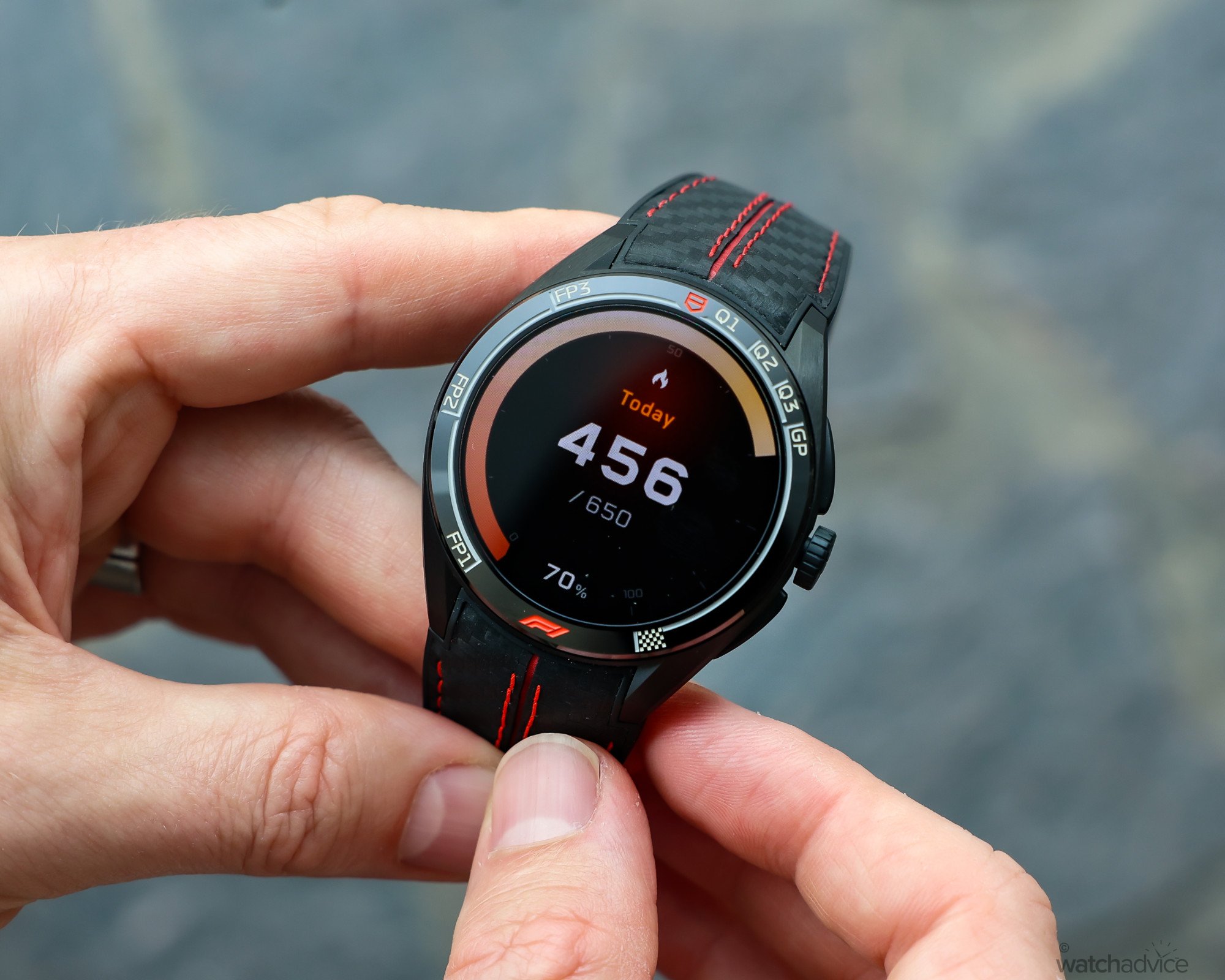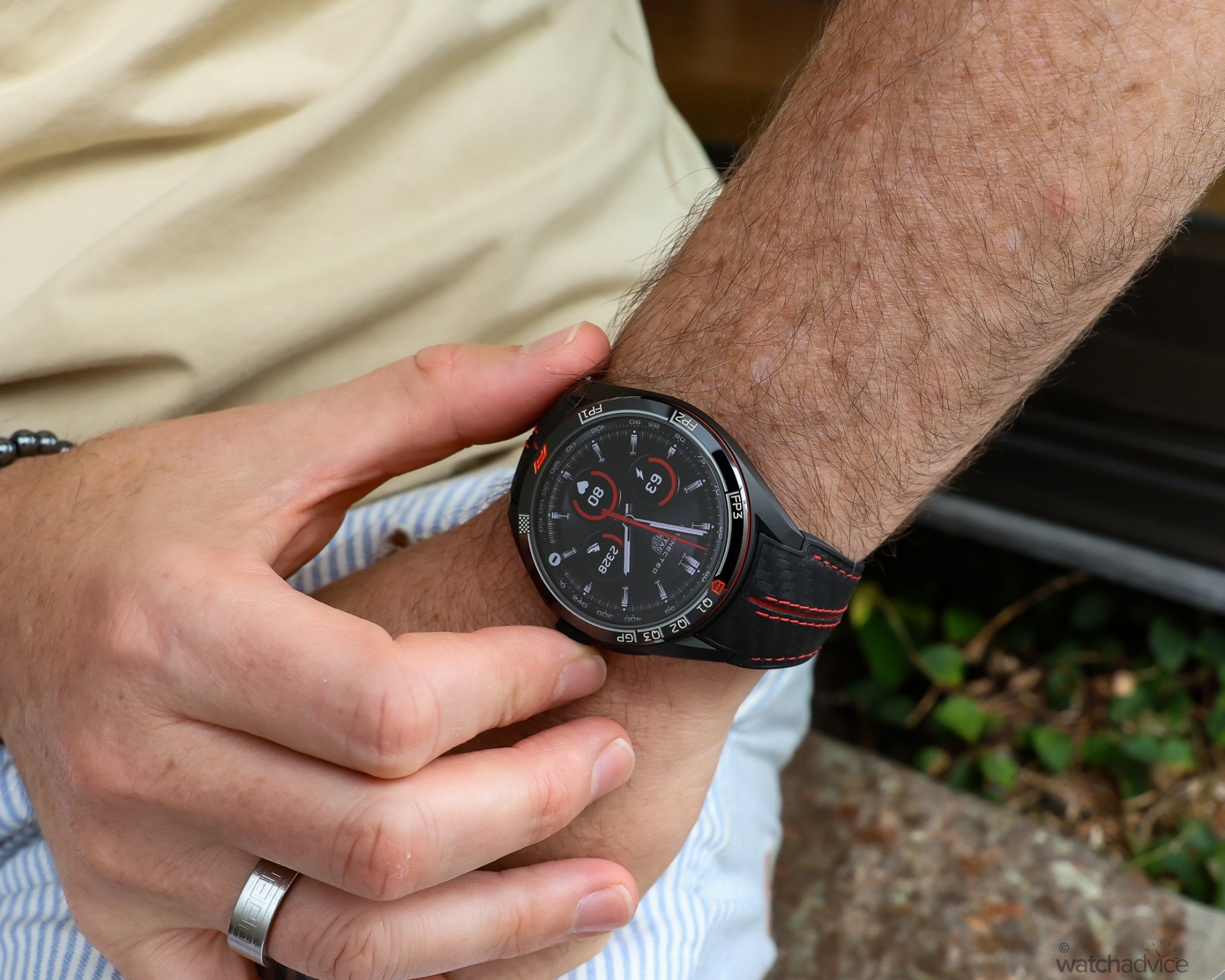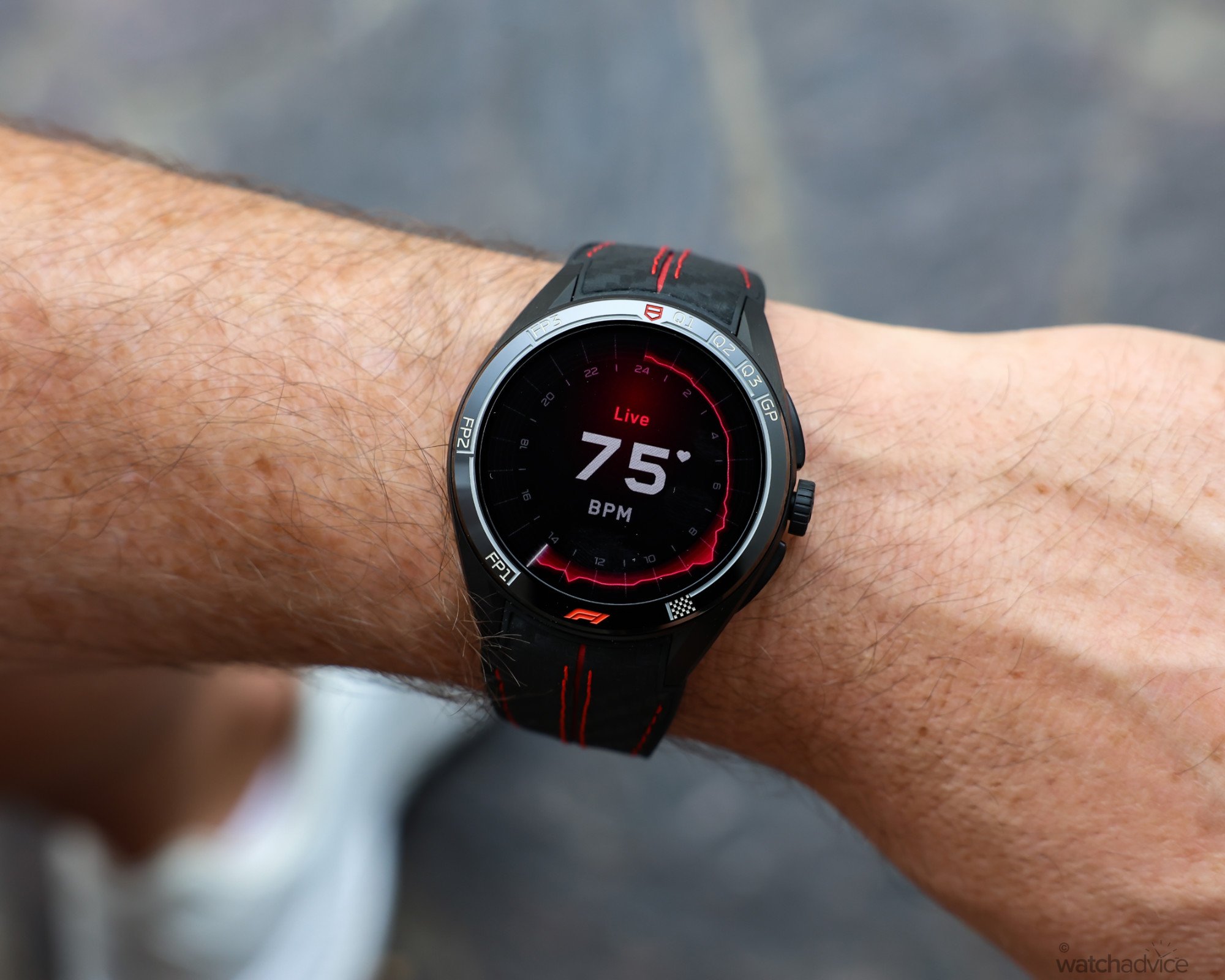 The styling also suited me better, with a distinctly sportier feel. The black and red accents on the Grade 2 titanium case keep the watch extremely light, while the black carbon fibre-effect rubber strap with red stitching reinforces the motorsport aesthetic. The result is a piece that feels less like a typical smartwatch and more like a Carrera-inspired sports model, similar to perhaps the Carrera Extreme Sport models.