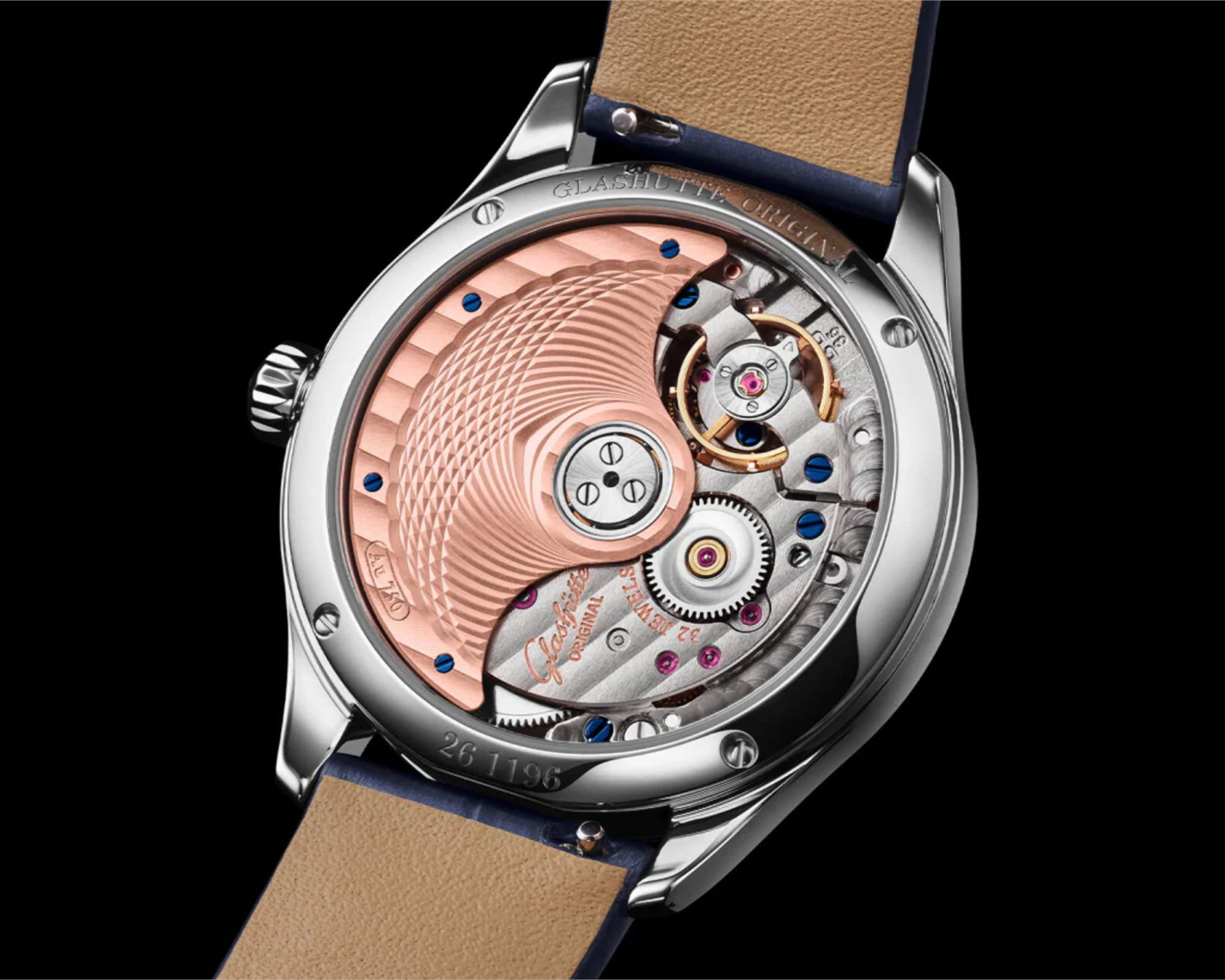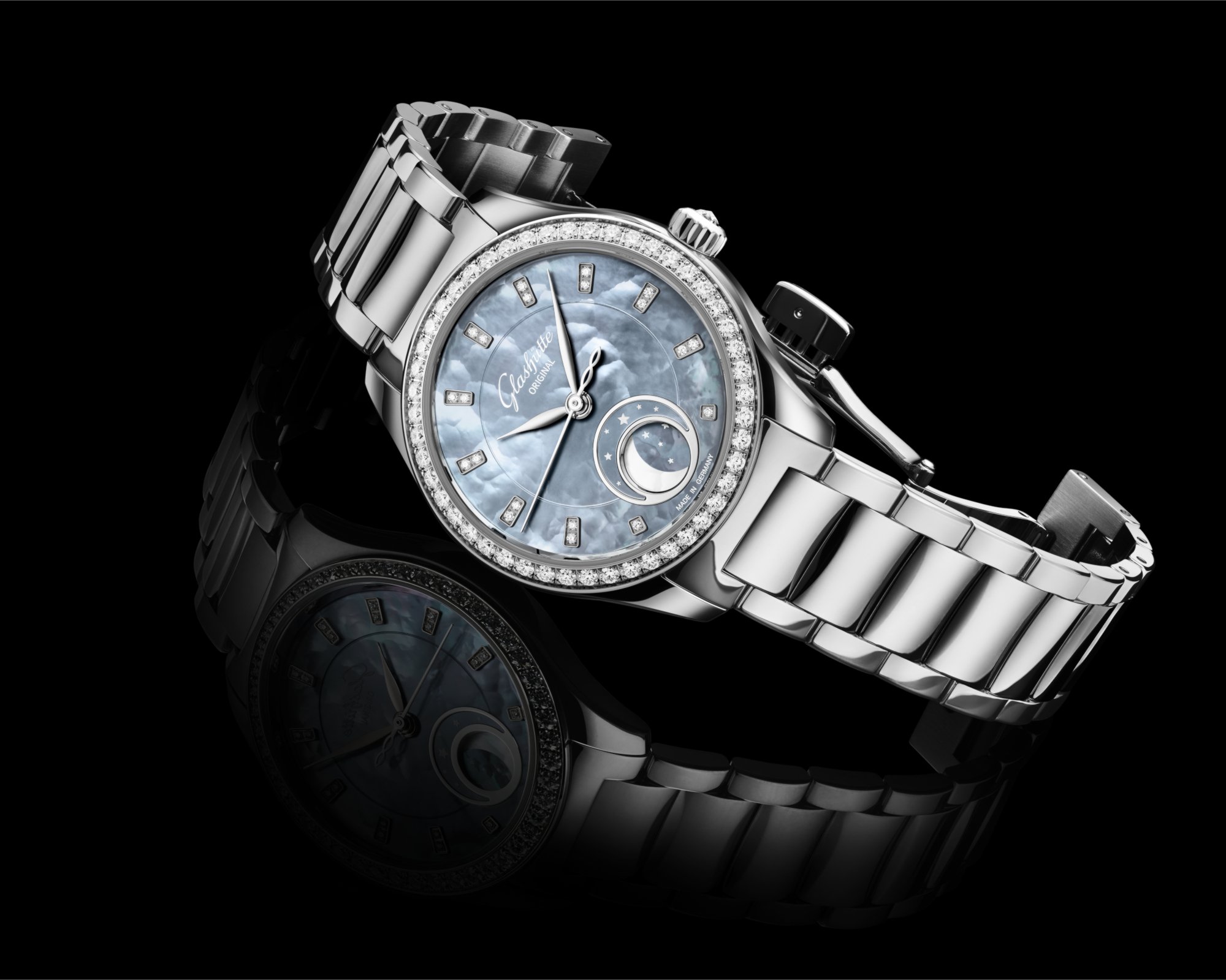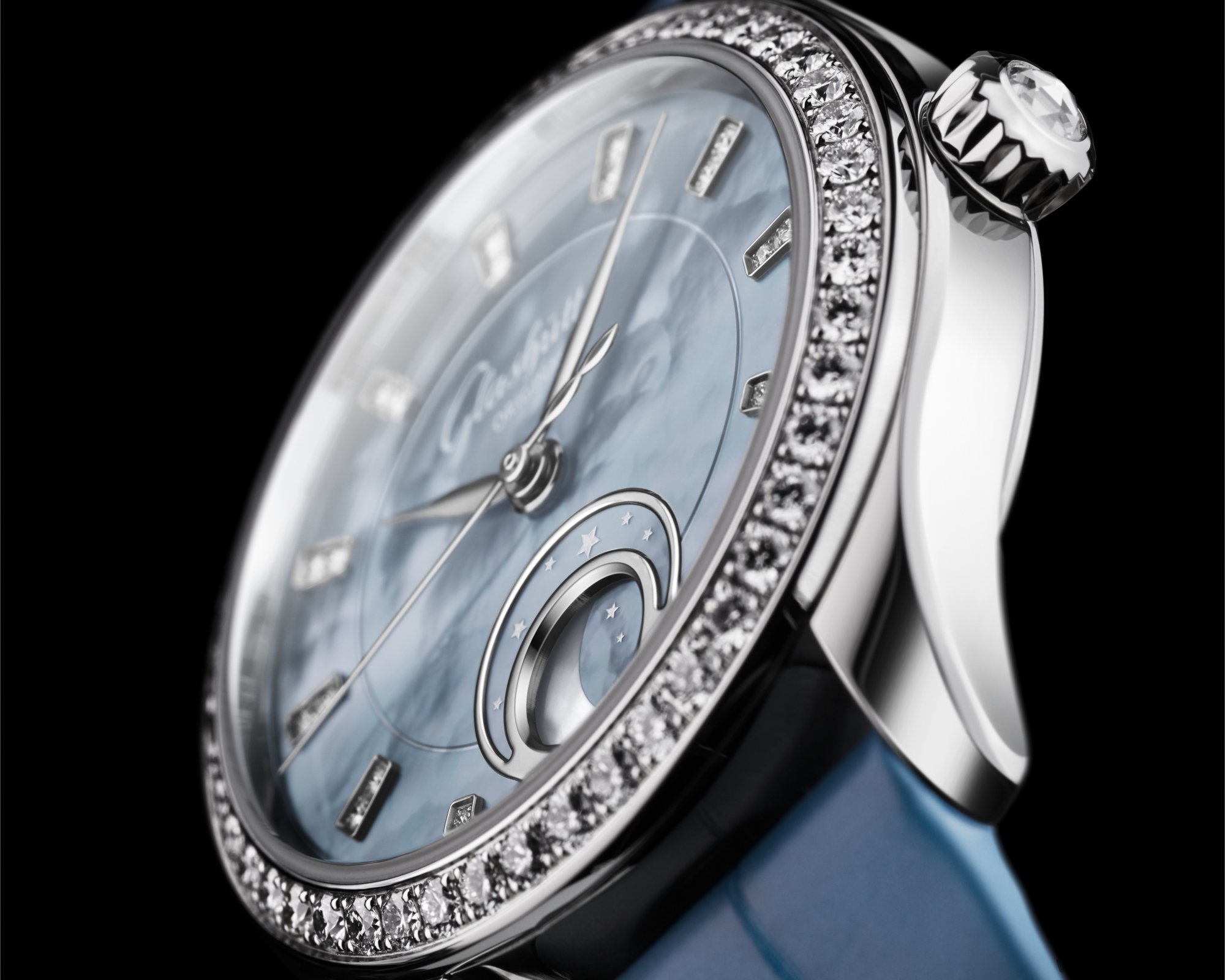 Of course, the star of the show is the brand-new dial. Inspired by high-rise buildings reflecting passing clouds, Glashütte Original captures this imagery with a mother-of-pearl dial finished with dark lacquer. Multiple layers, applied to the underside of the dial, allow it to shift between hues of silver and blue, with light refracting across every surface.