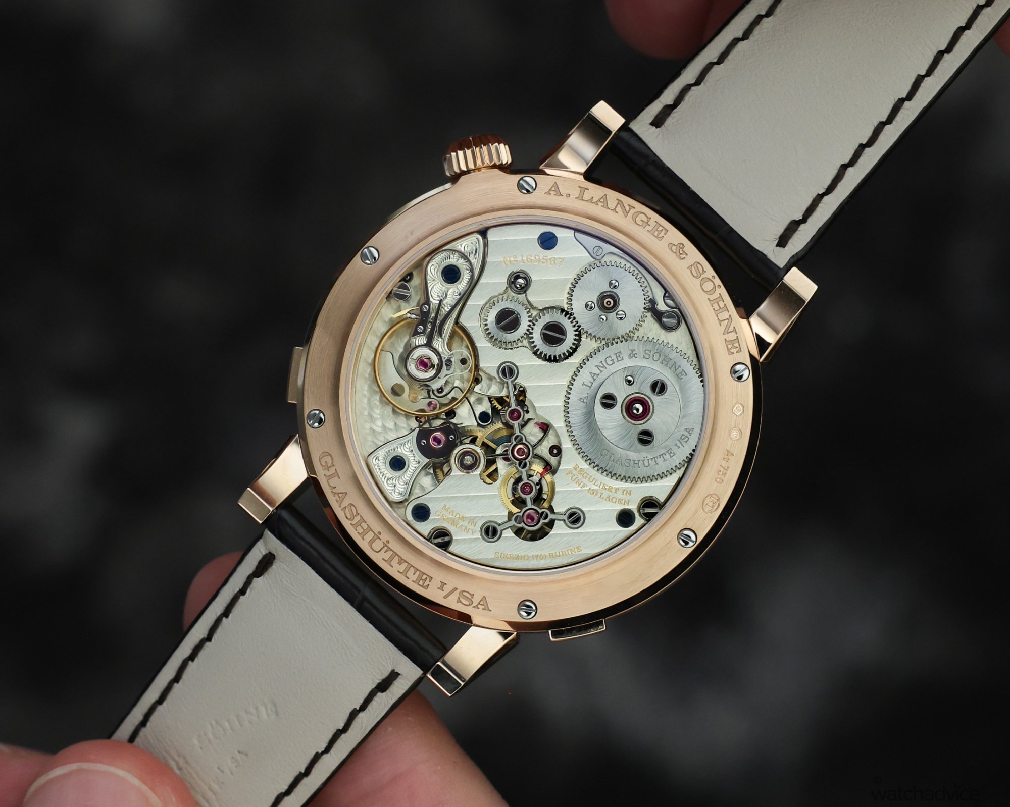 Of course, the caseback is typically Lange: beautifully finished and decorated — from the German silver bridges with Glashütte striping to the solarisation on the gears and barrel, to the hand‑engraved balance cock. It is ornate and impeccable, and it is double‑assembled to ensure reliability and accuracy.