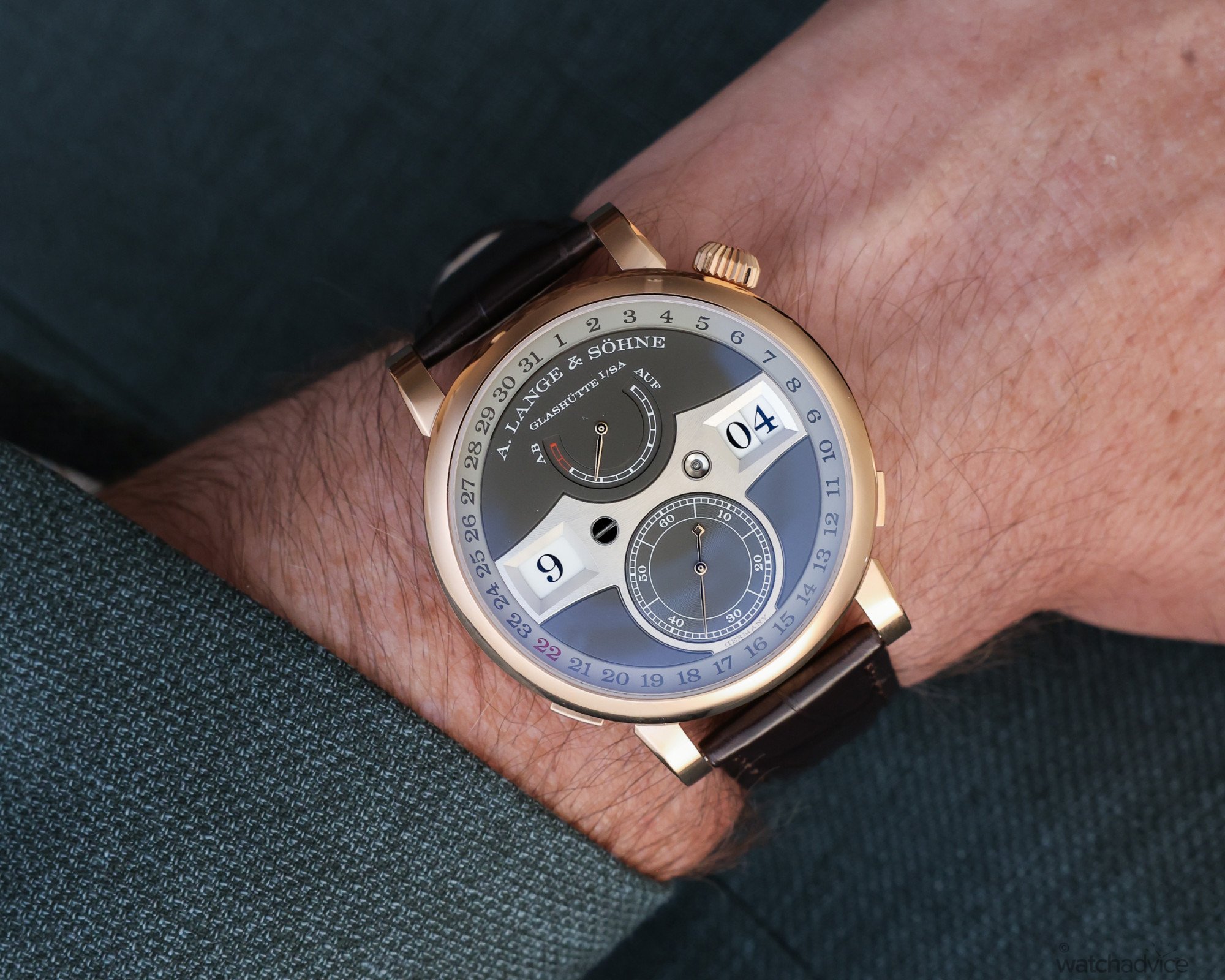 At 44.2 mm in diameter, the Zeitwerk Date is substantial. But, at 12.3 mm thick, it feels smaller on the wrist than those numbers suggest — something I’ll cover in the next section. That size is not large by choice but rather dictated by the movement architecture. The twin mainspring barrels, constant‑force escapement, and layered disc system require space, and Lange has never been inclined to shrink mechanical ambition to chase wearability metrics.