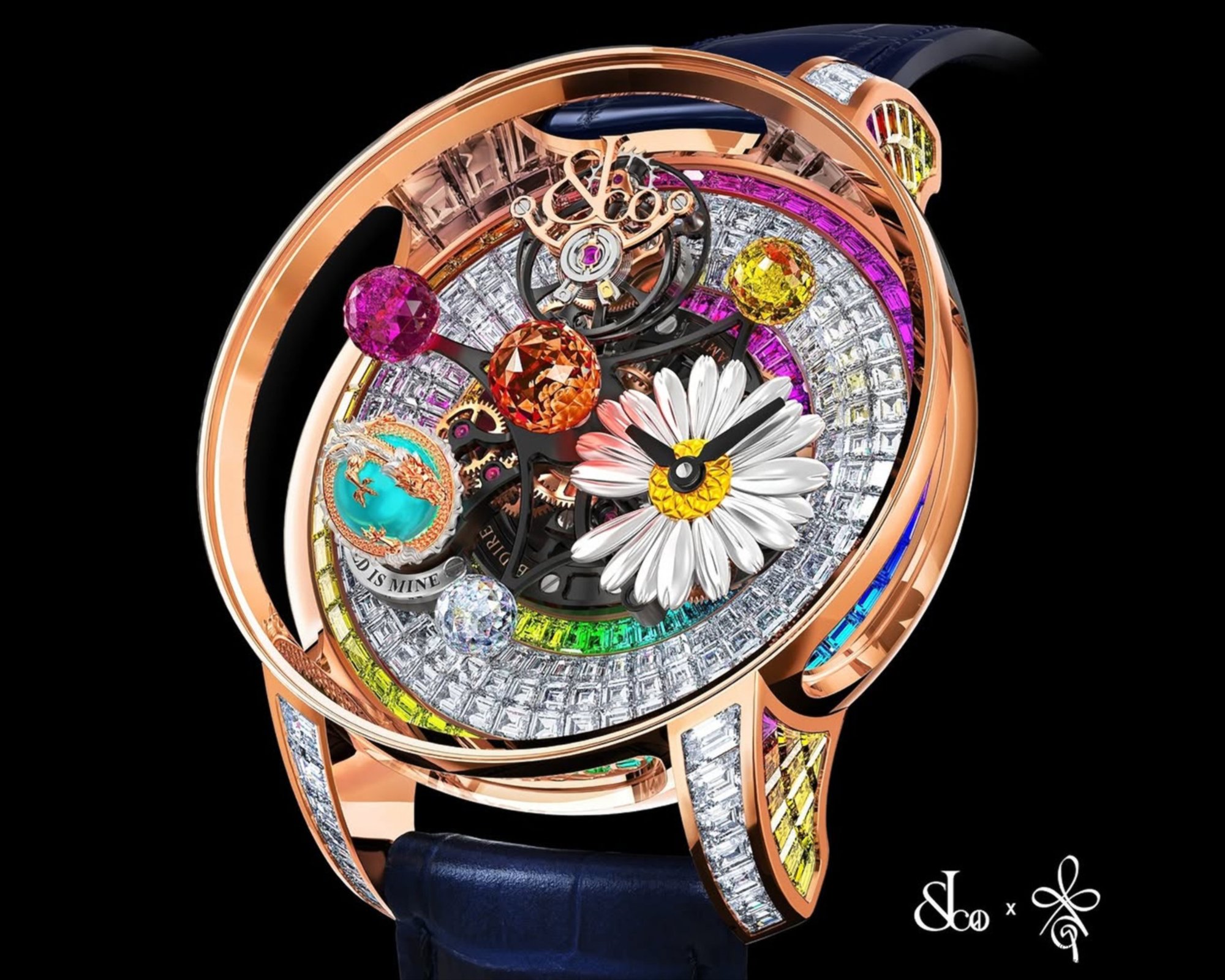 For G-Dragon himself, Jacob designed an extremely limited set of unique Astronomia Solar models, one of which was gifted to the King of K-pop. Complete with a rose-gold case, orbiting tourbillon, and every conceivable jewel colour imaginable, it perfectly encapsulates G-Dragon’s contributions to the space, summed up with a single engraving: “The World Is Mine.”