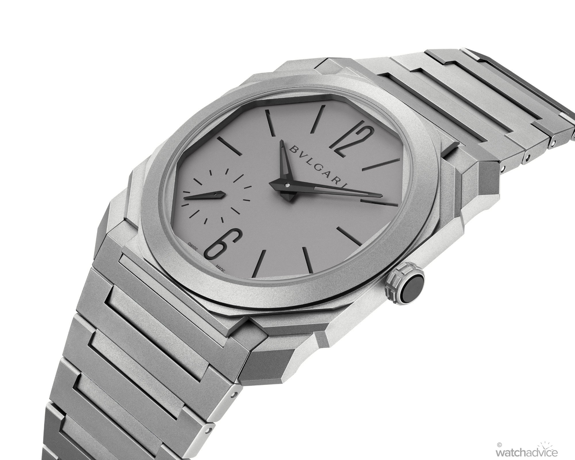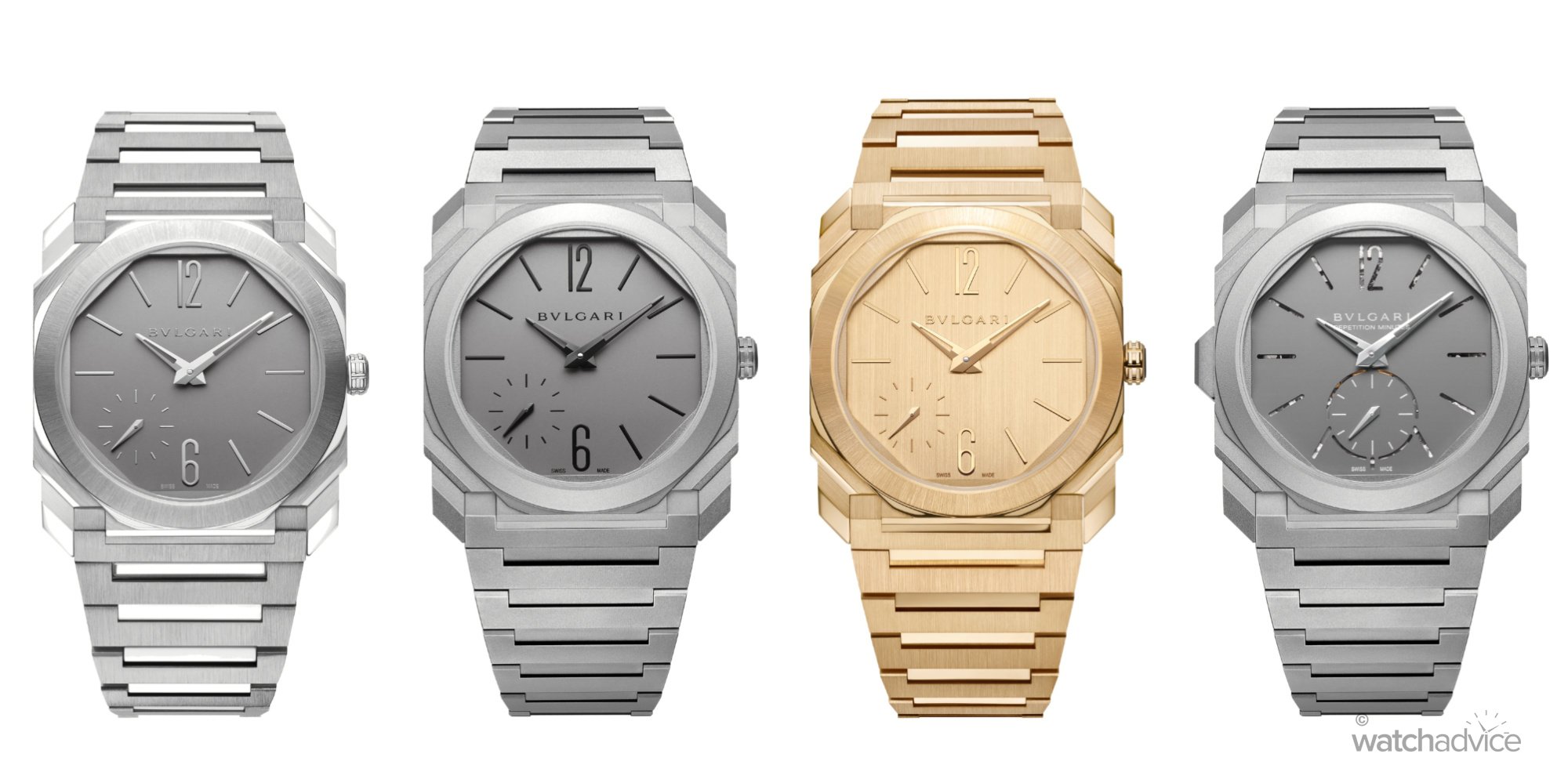 The new Bvlgari Octo Finissimo collection comprises four new models. Two models in titanium – one with a sandblasted finish, the other satin-brushed and polished for two different textures and looks. The third is crafted in 18k yellow gold, giving the wearer more heft and a feeling of ultimate luxury. The fourth is a high complication in the form of a sandblasted titanium minute repeater.