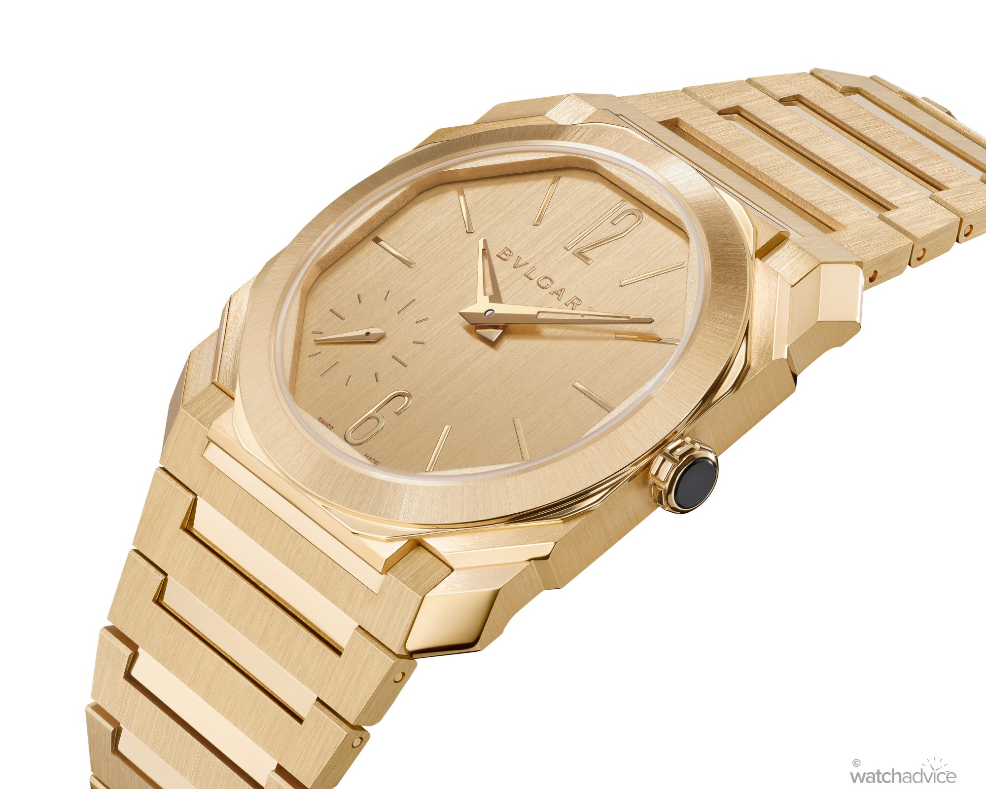 The third ticks the ultra-luxury box, with a full 18k yellow gold model that mirrors the finish of the Satin-brushed titanium version, with a combination of brushed and polished surfaces that catch the light. Bvlgari goes one step further on this watch, with a monochromatic yellow gold dial with yellow gold-plated hands and indexes. Even the screw-down crown is 18k yellow gold with a black ceramic insert.