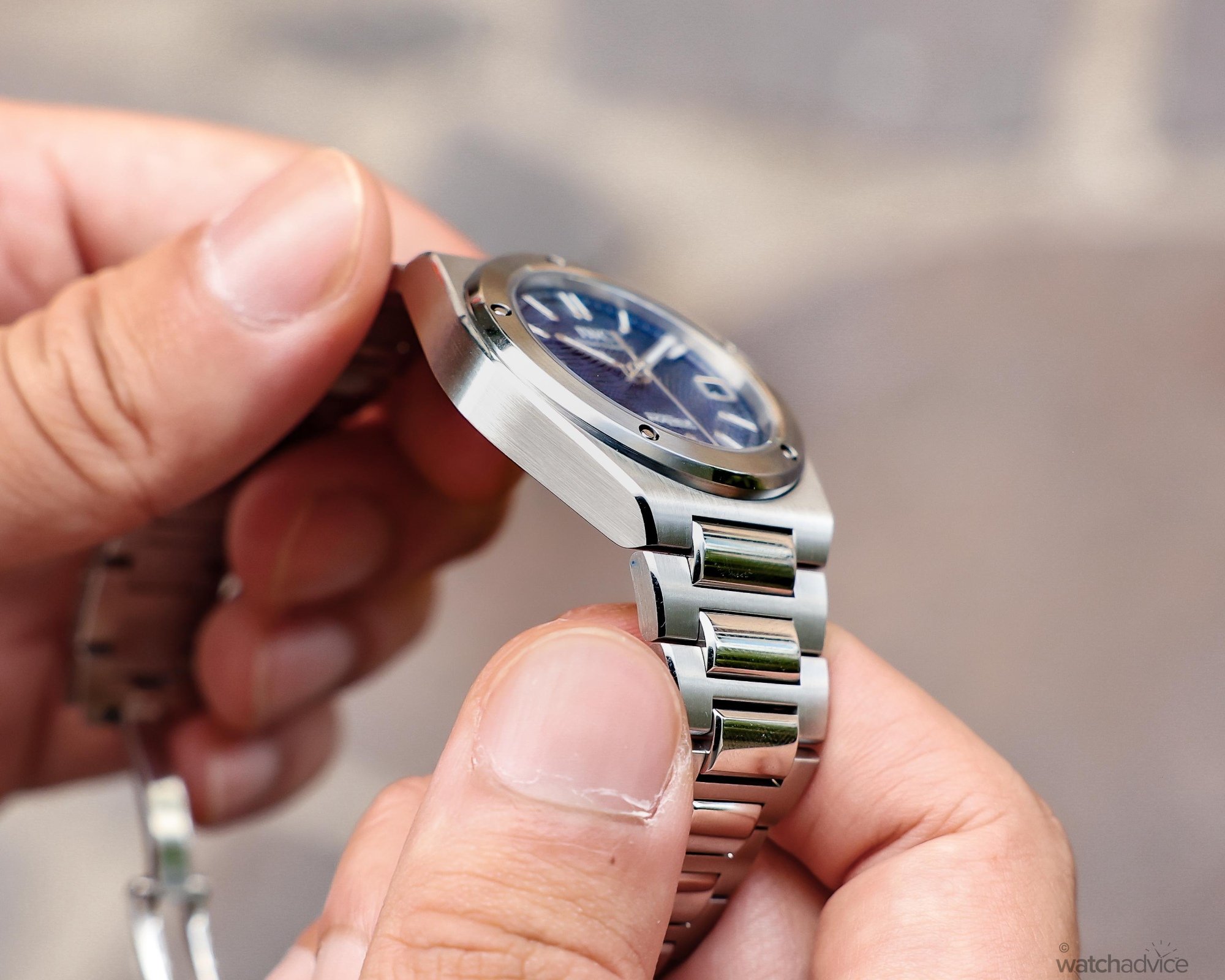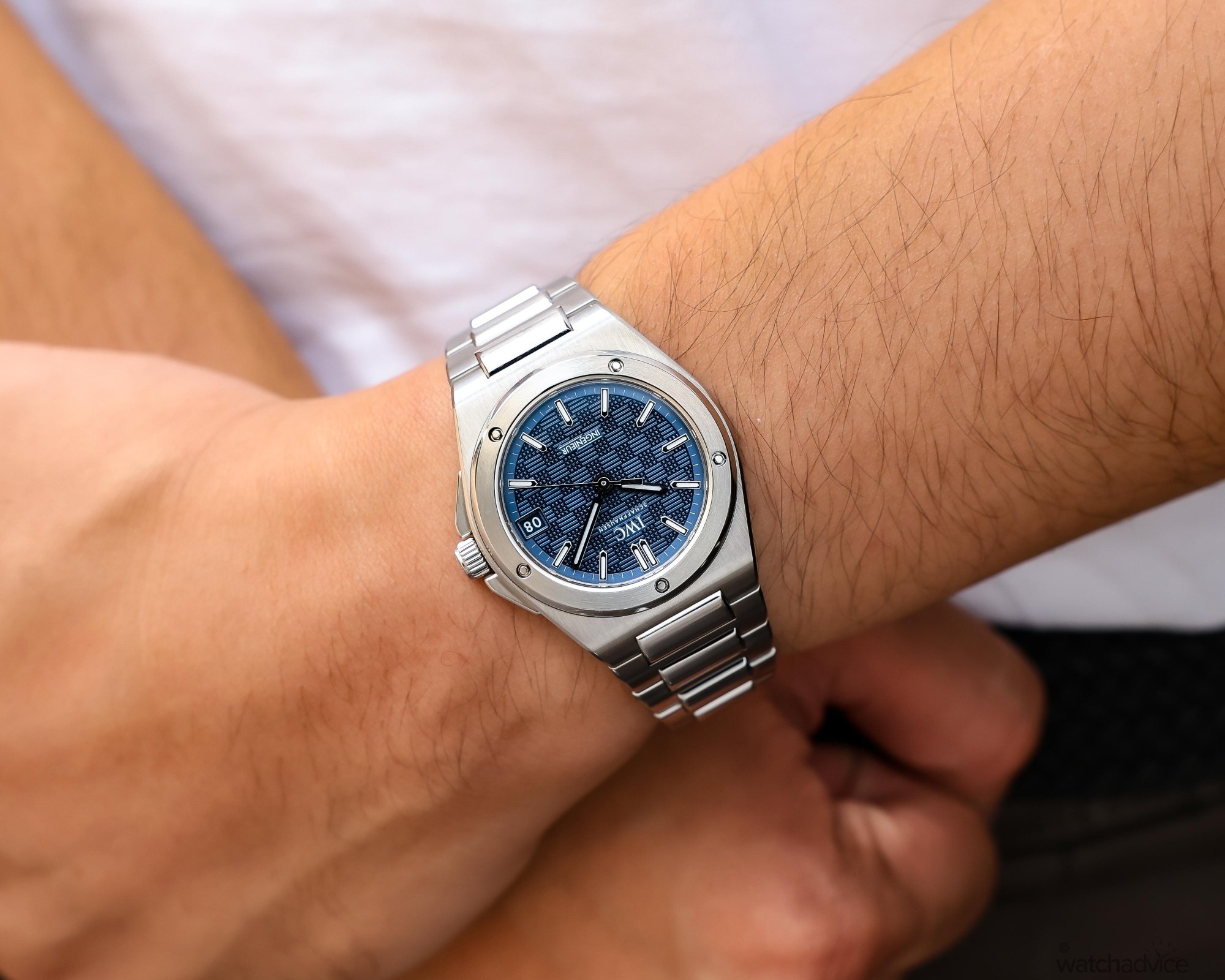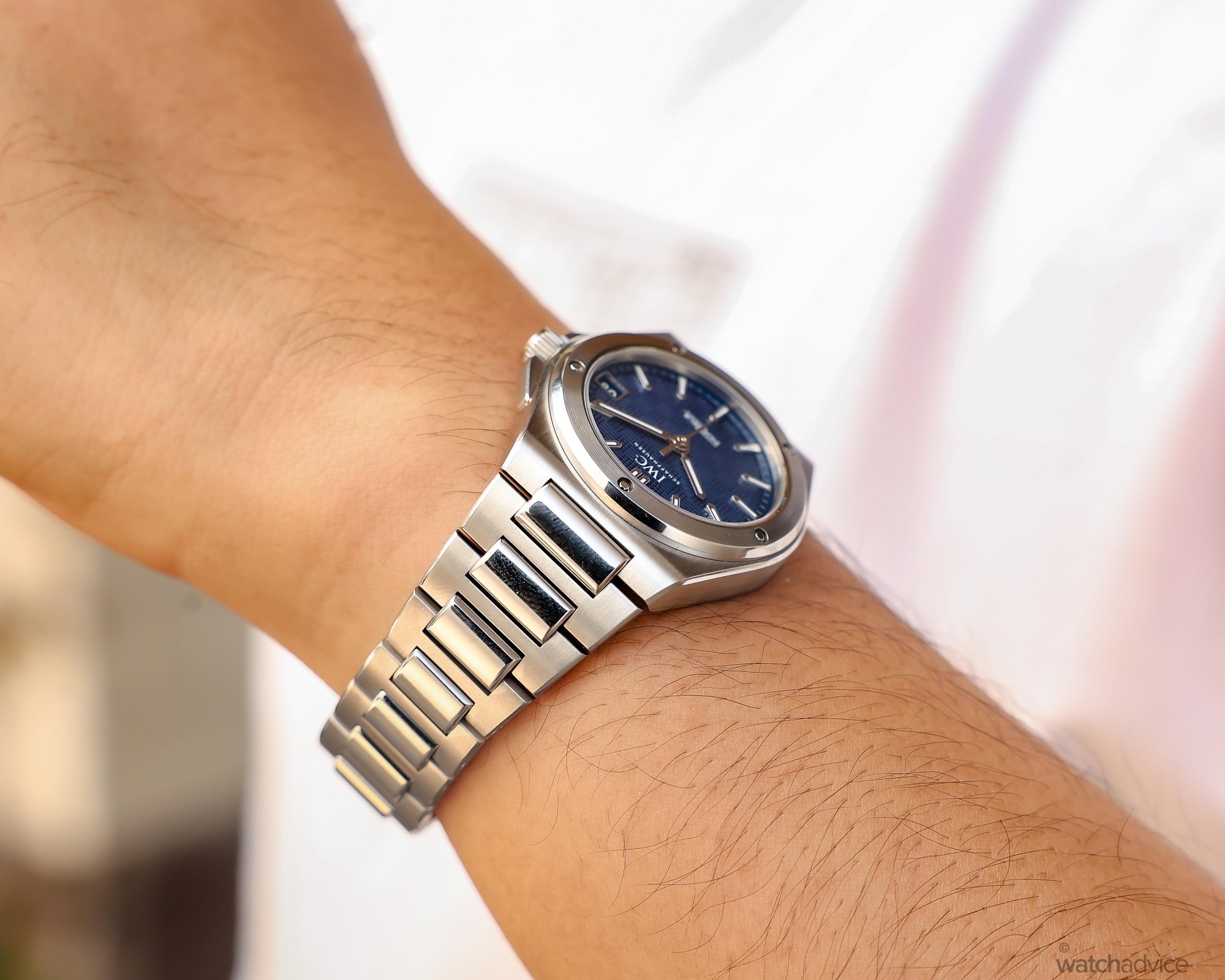 The 35mm case profile is larger than one would expect, as the Ingenieur is an integrated bracelet watch.