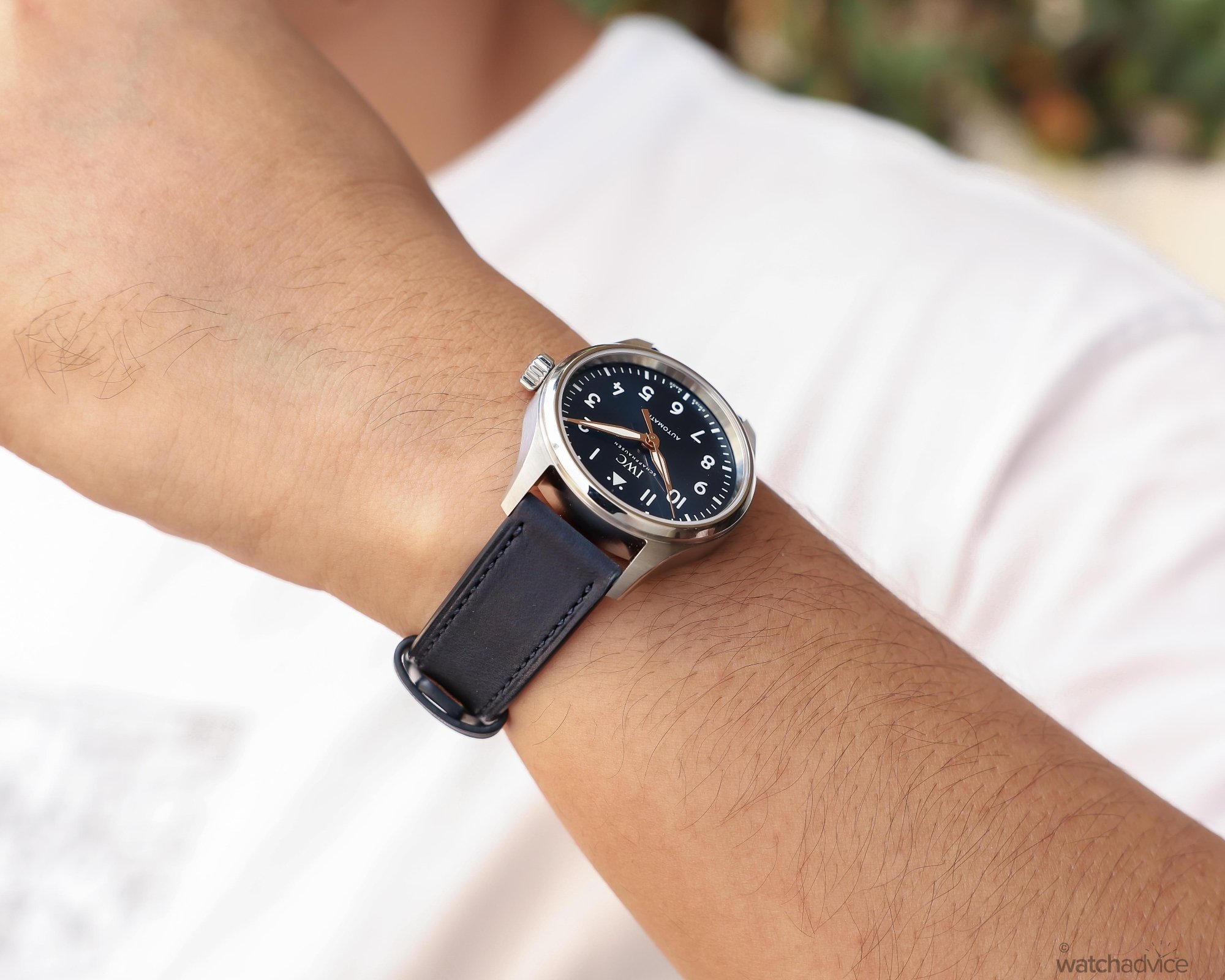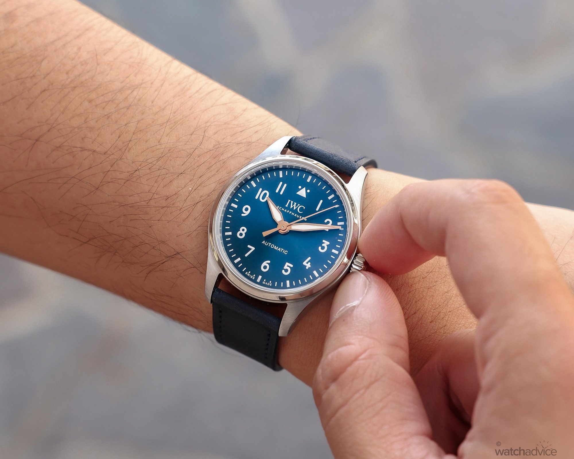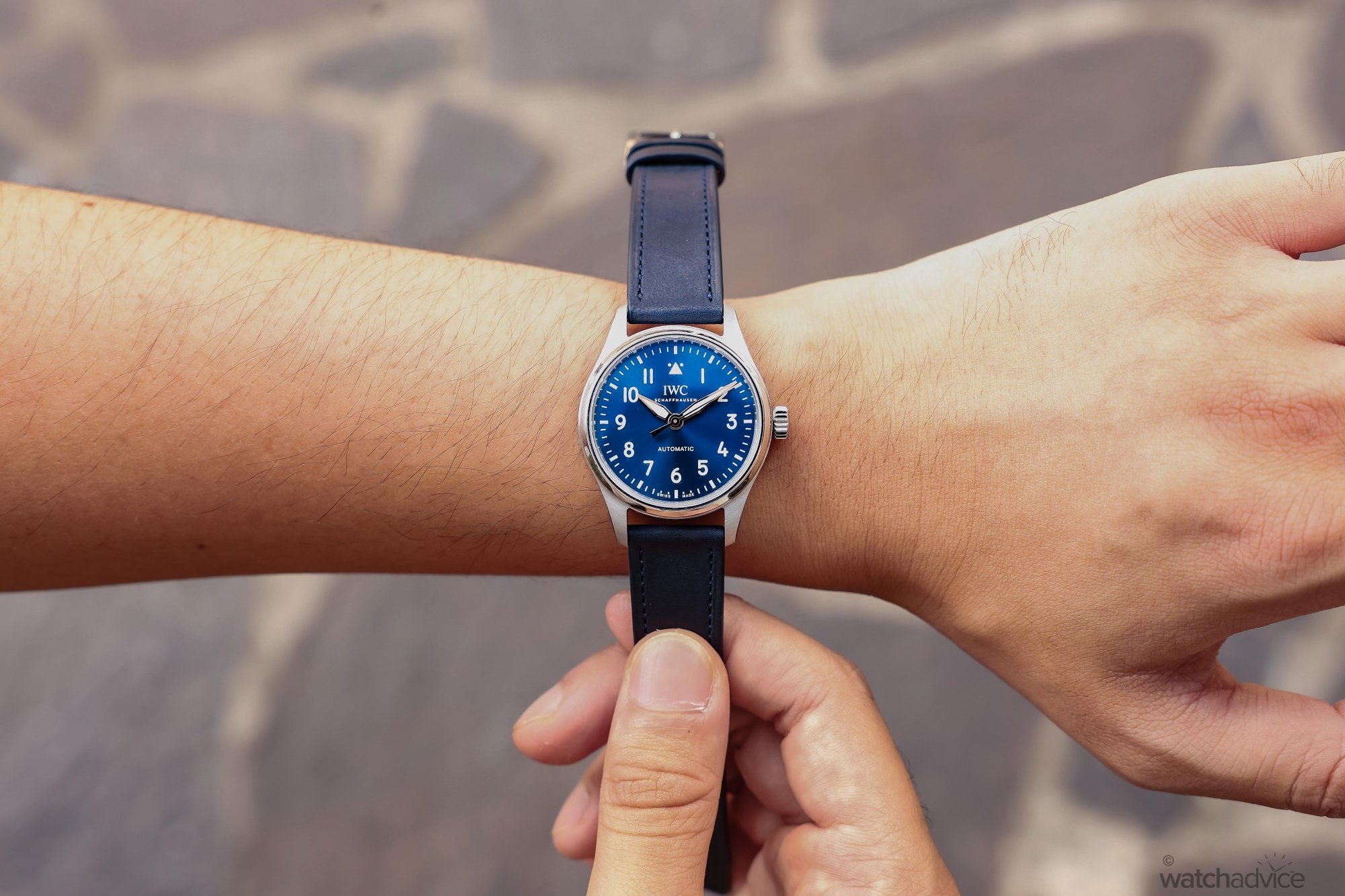 Further enhancing the wearability of the watch is the blue calfskin leather strap. While it loses some of the ‘cool’ factor of the previous Santoni alligator strap, it’s a small sacrifice, and one I believe was necessary. Given the simplicity of the Pilot’s Watch design, an alligator strap felt like it was caught between dramatic flair and pragmatic purpose. Interestingly, it doesn’t come with any interchangeable strap system, an omission that extends across the other 36mm models.