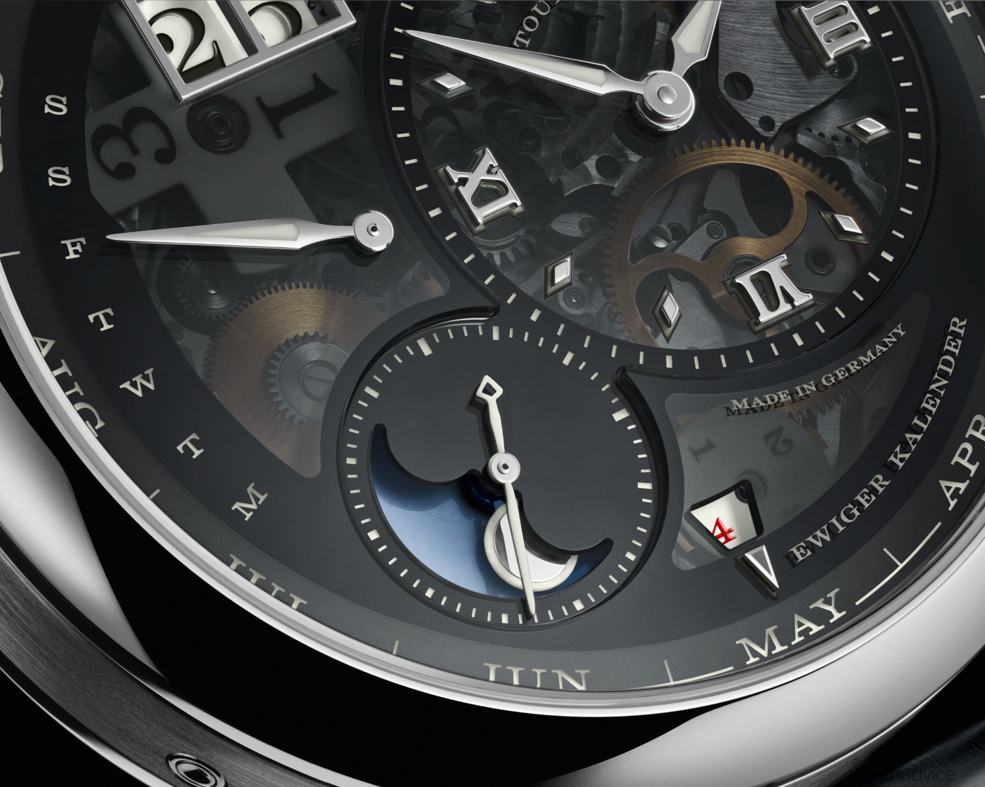 The date functions are all simultaneous, so at the end of the day at the end of the month, you can watch the date, retrograde day, and month wheel all change at the stroke of midnight.