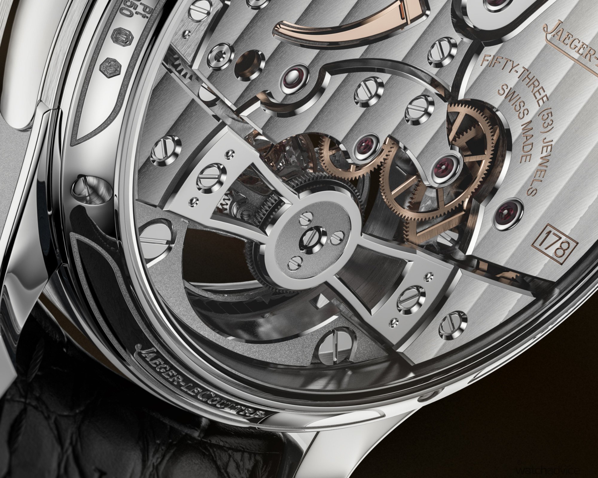 Much of this is visible via the transparent sapphire crystal case back. Features such as the solid 18k White Gold bridges, traditionally decorated with Côtes de Genève, which are also hand-bevelled, and high-polished. Jaeger-LeCoultre has also used 53 rubies, some of which are in gold chatons, giving contrast to the monochrome white gold-and-steel aesthetic.