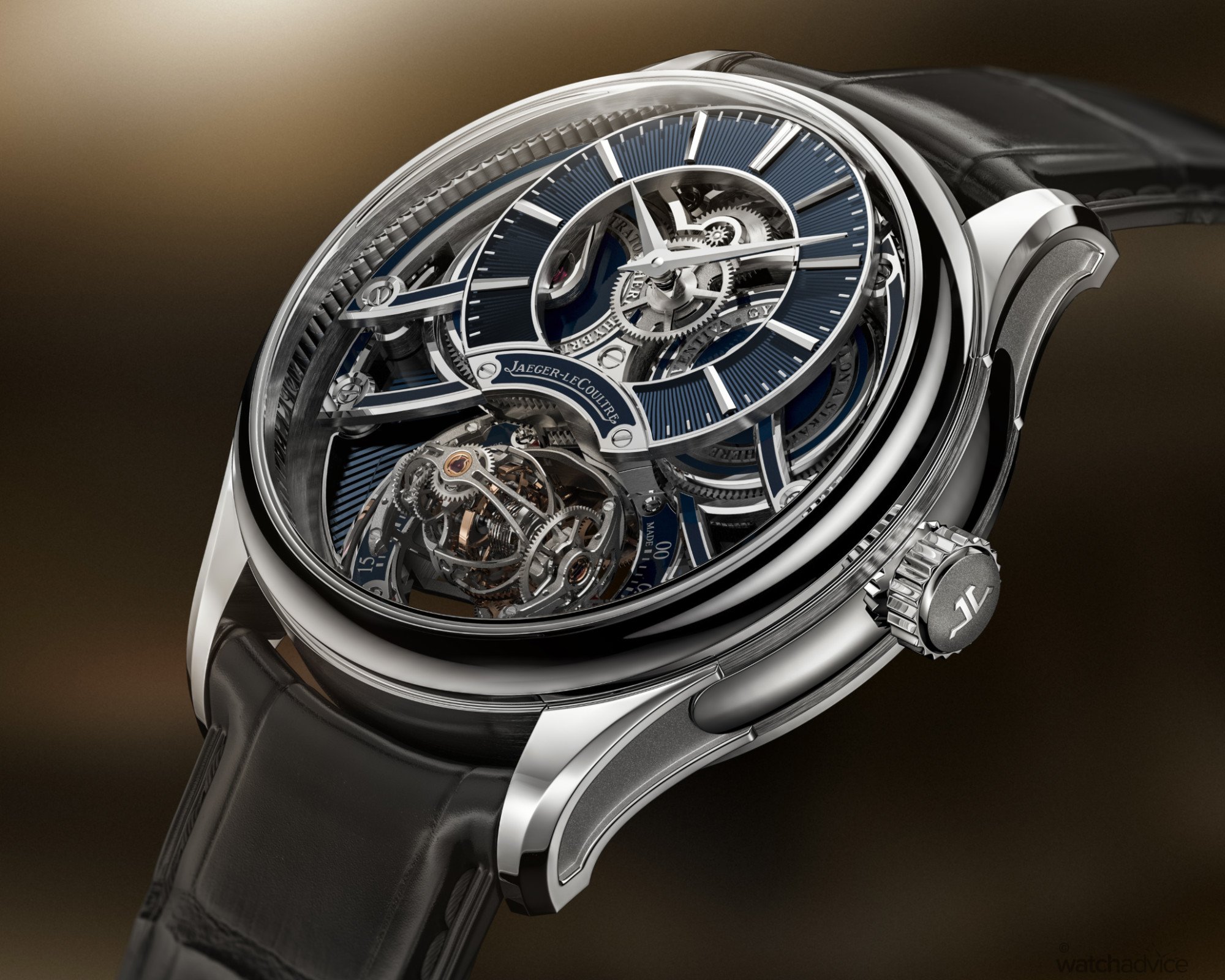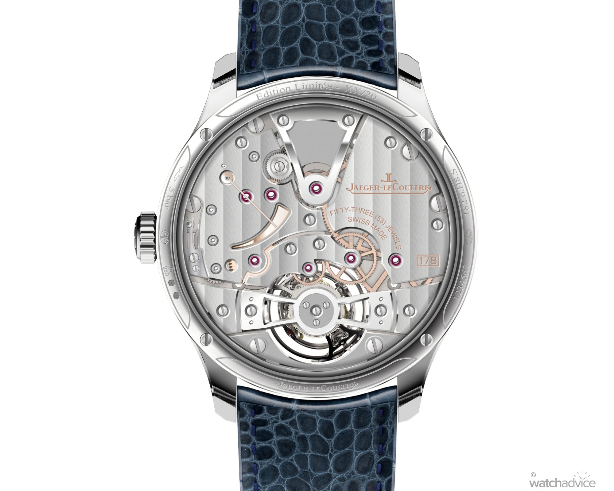 That said, the watch has been crafted from 950 platinum in a 42 mm diameter x 16.15 mm thick case, and is complemented by a blue alligator leather strap and an 18k white gold folding buckle. But this is really a (quite lovely) shell to showcase the dial side of the movement, which Jaeger-LeCoultre has made sure shieas as much as the rest of the calibre 178 itself.