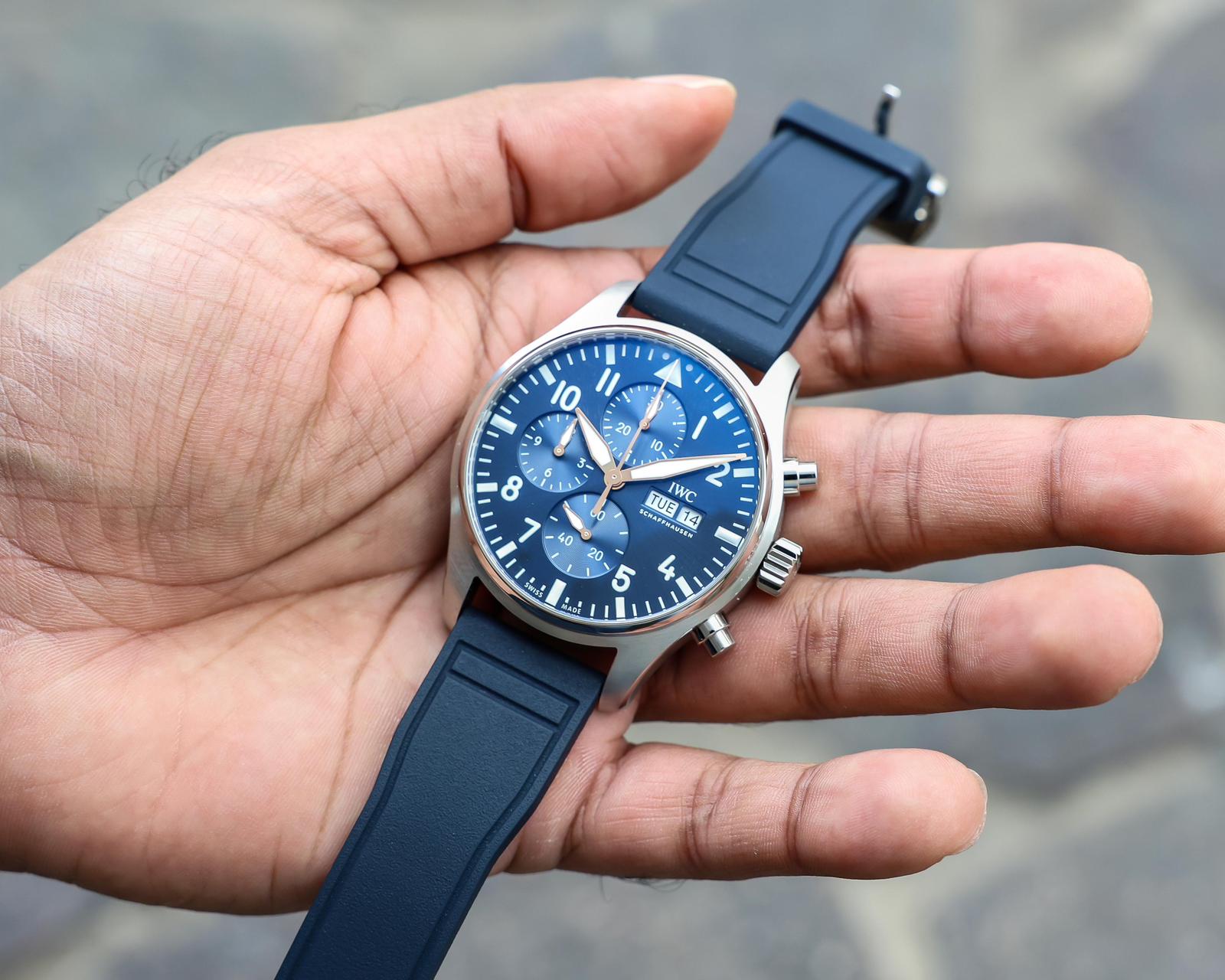 Having the day and date wheels colour-matched to the dial could perhaps present a more balanced aesthetic, but I think in this case it can be justified, as with the IWC logo in white sitting above, it helps the date features not feel out of place on the dial.
