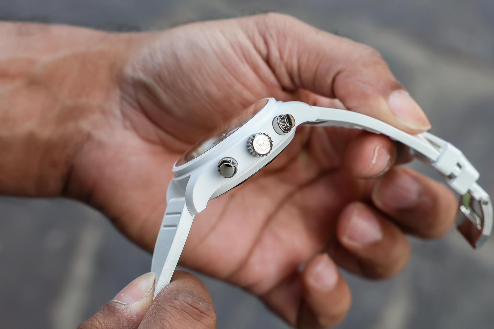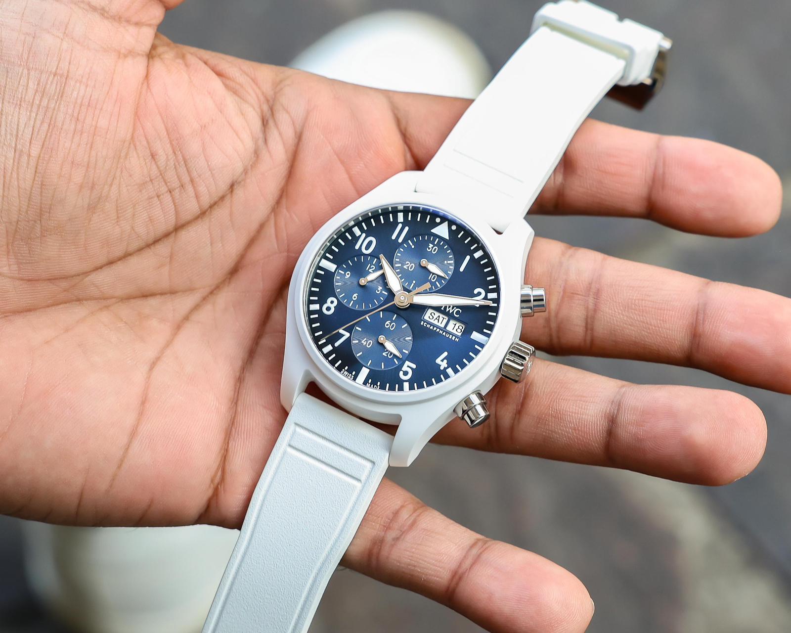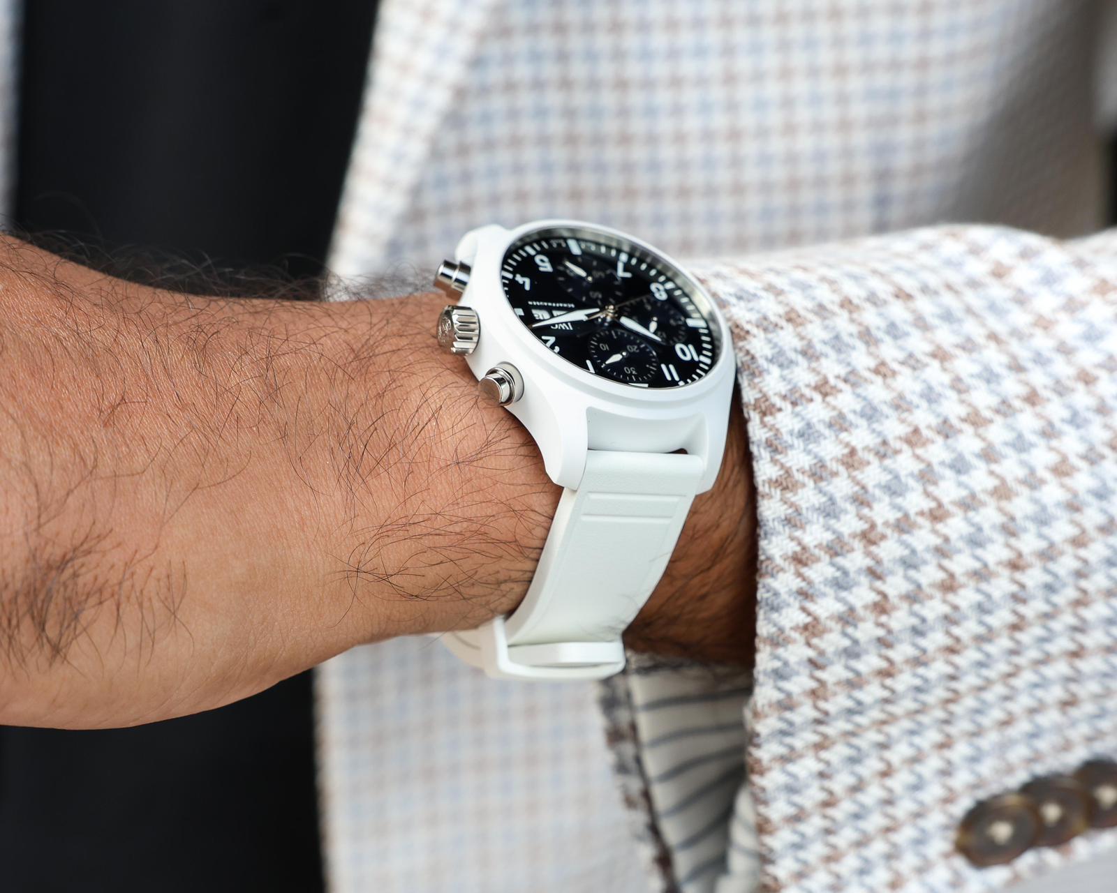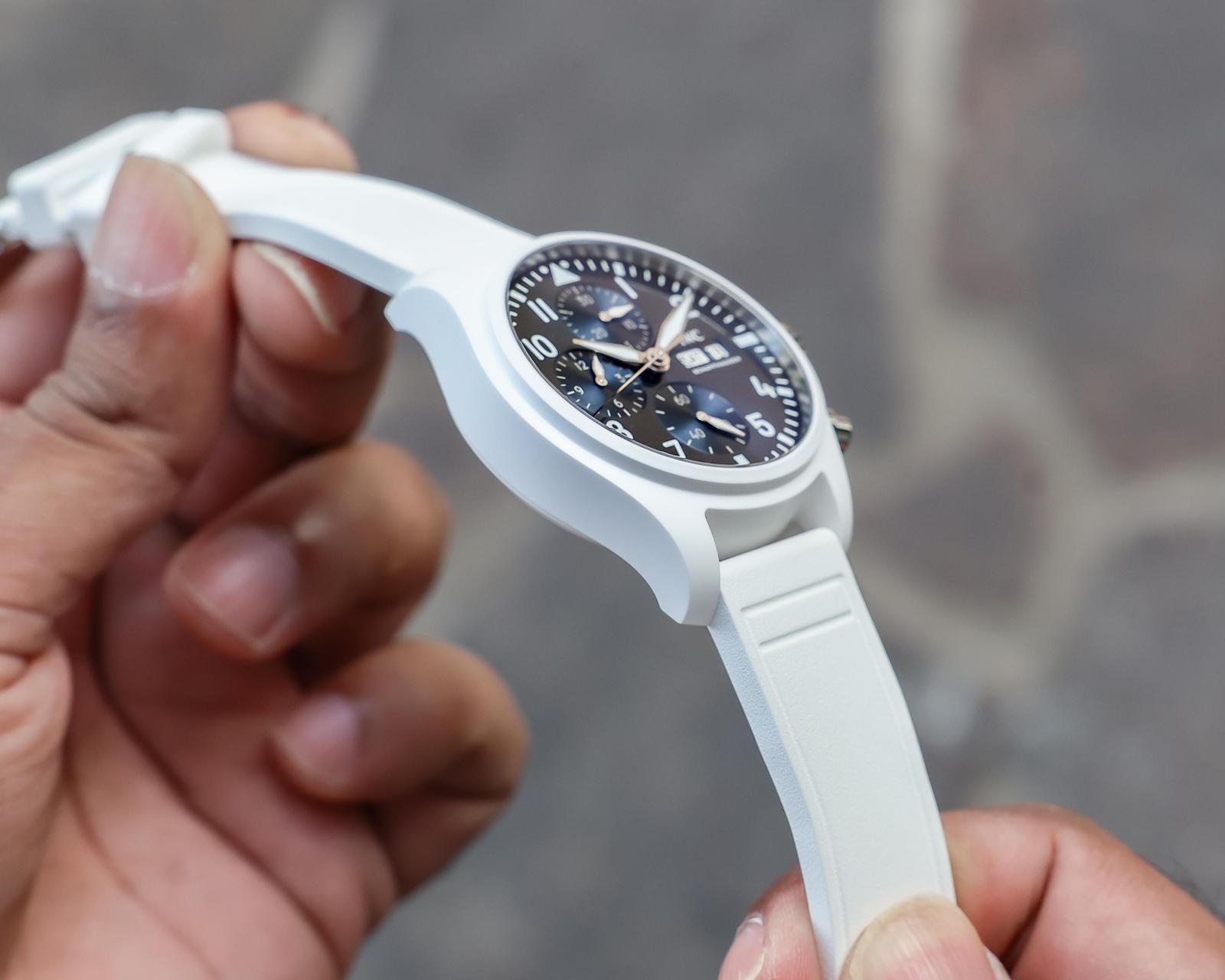The signature Pilot’s chronograph Arabic numerals for the indices, along with the bold minute track, are retained here, and while this can make the dial appear busier, it actually works really well against the white ceramic case. Unlike the steel variant, which features gold-tipped hands, this white ceramic model features rhodium-plated or steel-toned hands. While I would have liked to have seen a bit more colour, I think this works well too, as it allows the white Super LumiNova to take centre stage, which, with the white ceramic model being an overly white-themed timepiece, fits in nicely with the overall aesthetic.