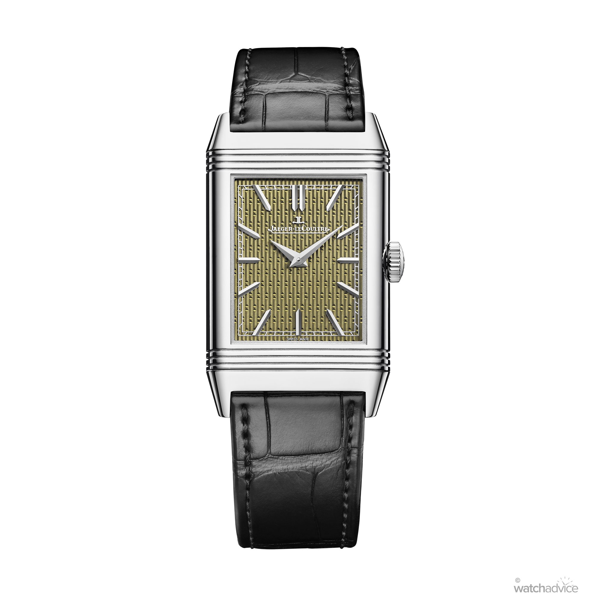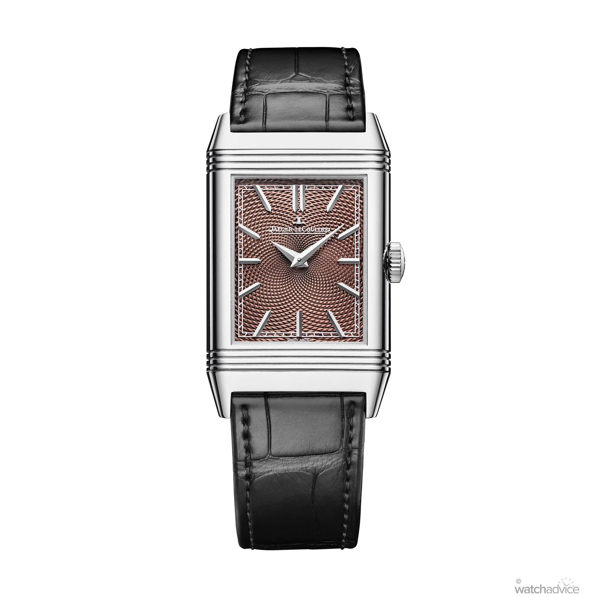 The front of this Reverso features a hand-guilloché dial that has a stunning barleycorn pattern. This intricate engraving requires 49 finely cut lines, each line being completed through three separate passes of the rose-engine lathe, bringing the total to 147 passes. The dial is then finished with a light walnut-brown enamel coating.