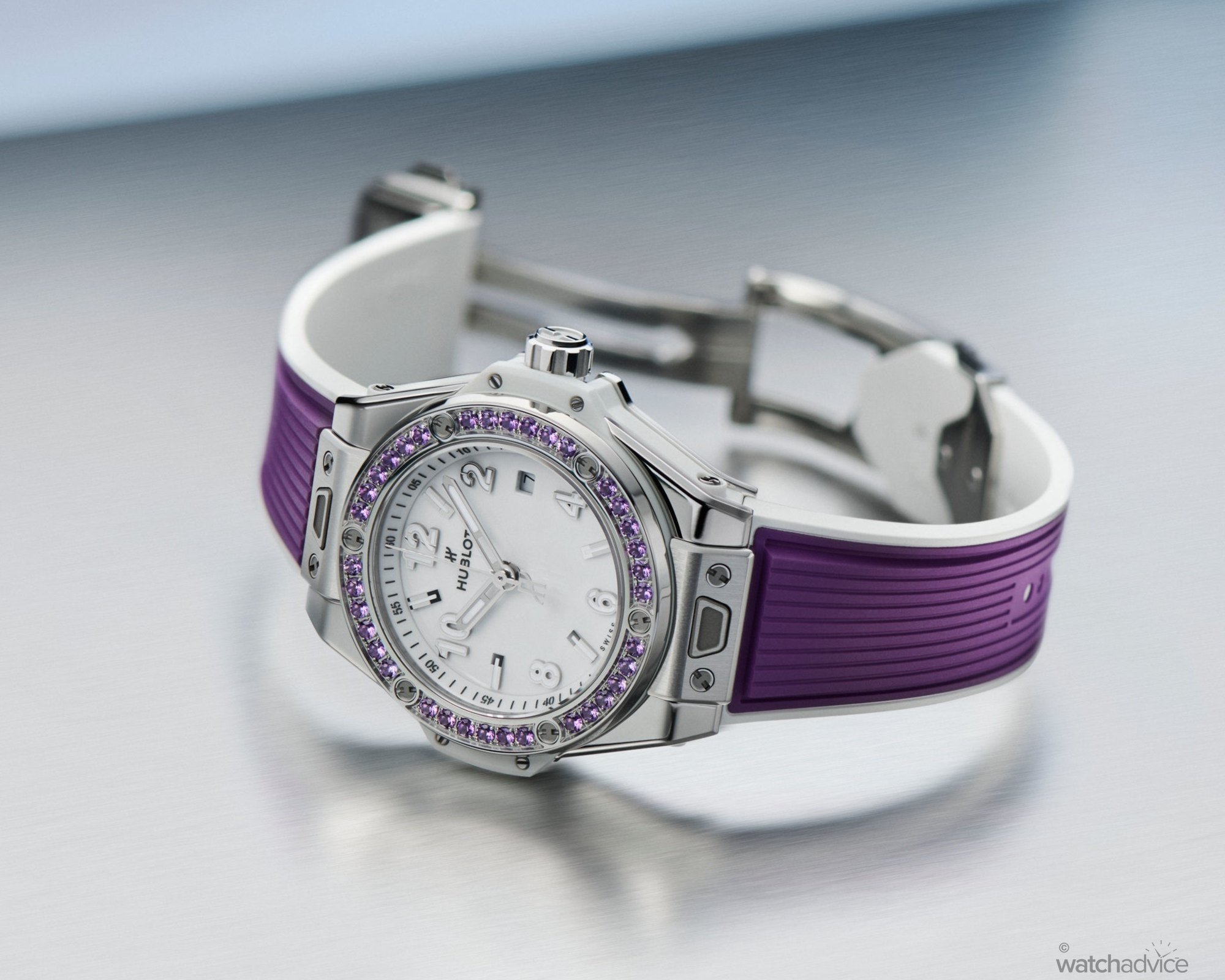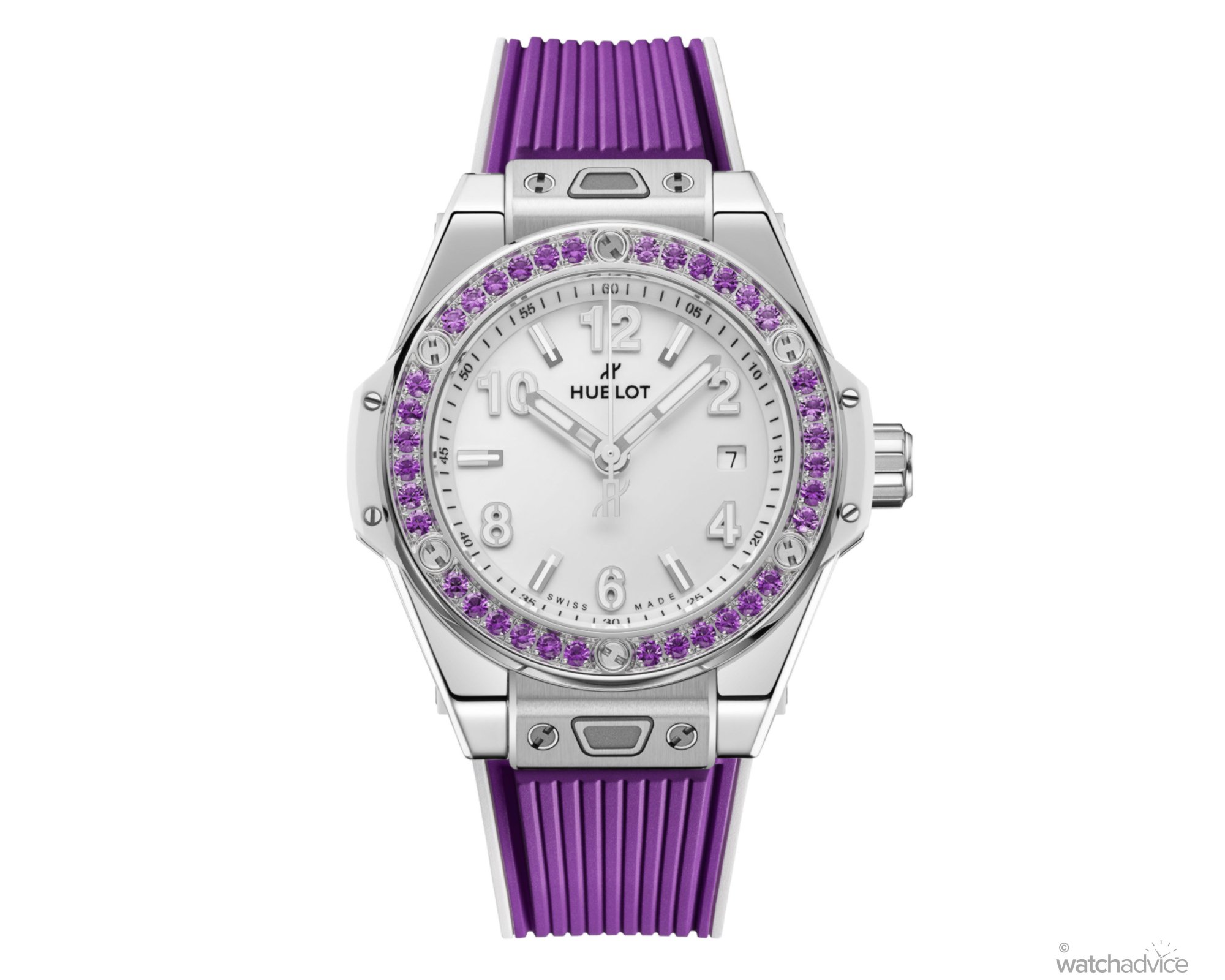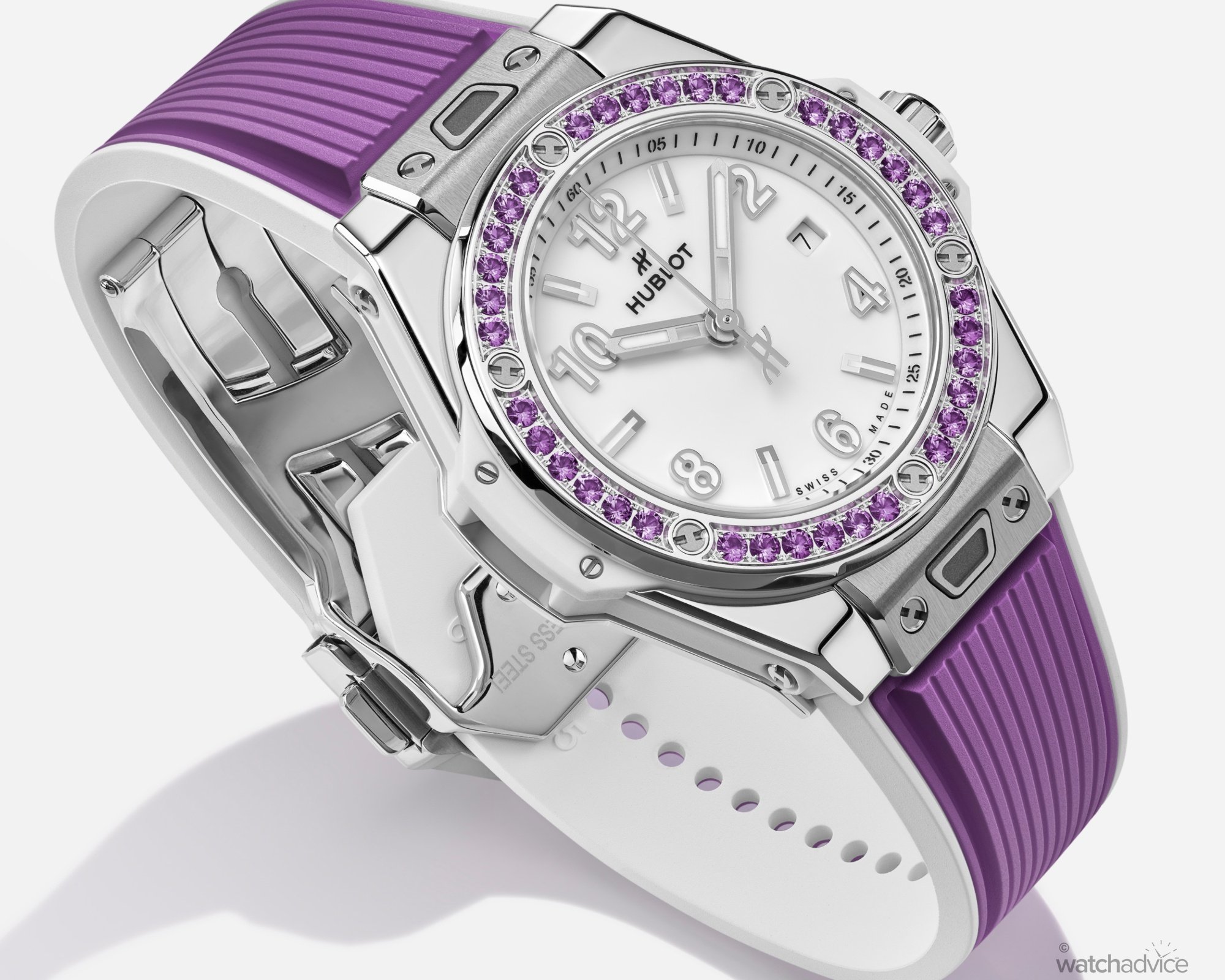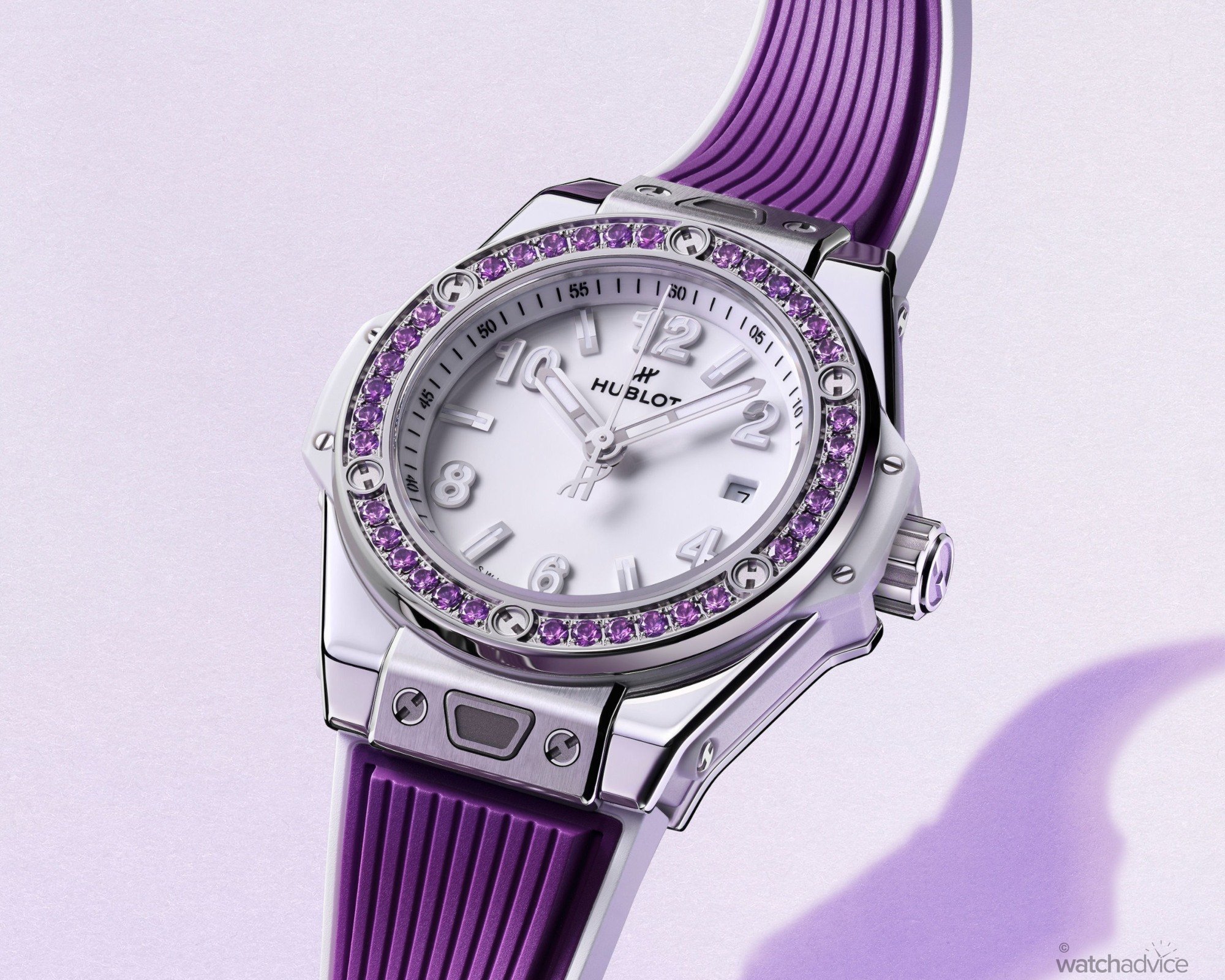 Each is then meticulously cut, polished, and set by hand, creating a seamless and consistent flow of colour around the bezel. The gemstones and strap are complemented by Hublot’s signature H-shaped titanium screws, a clean white dial, and bold Arabic numerals. With its cooler tones, the violet hue stands out without overpowering Hublot’s iconic silhouette.