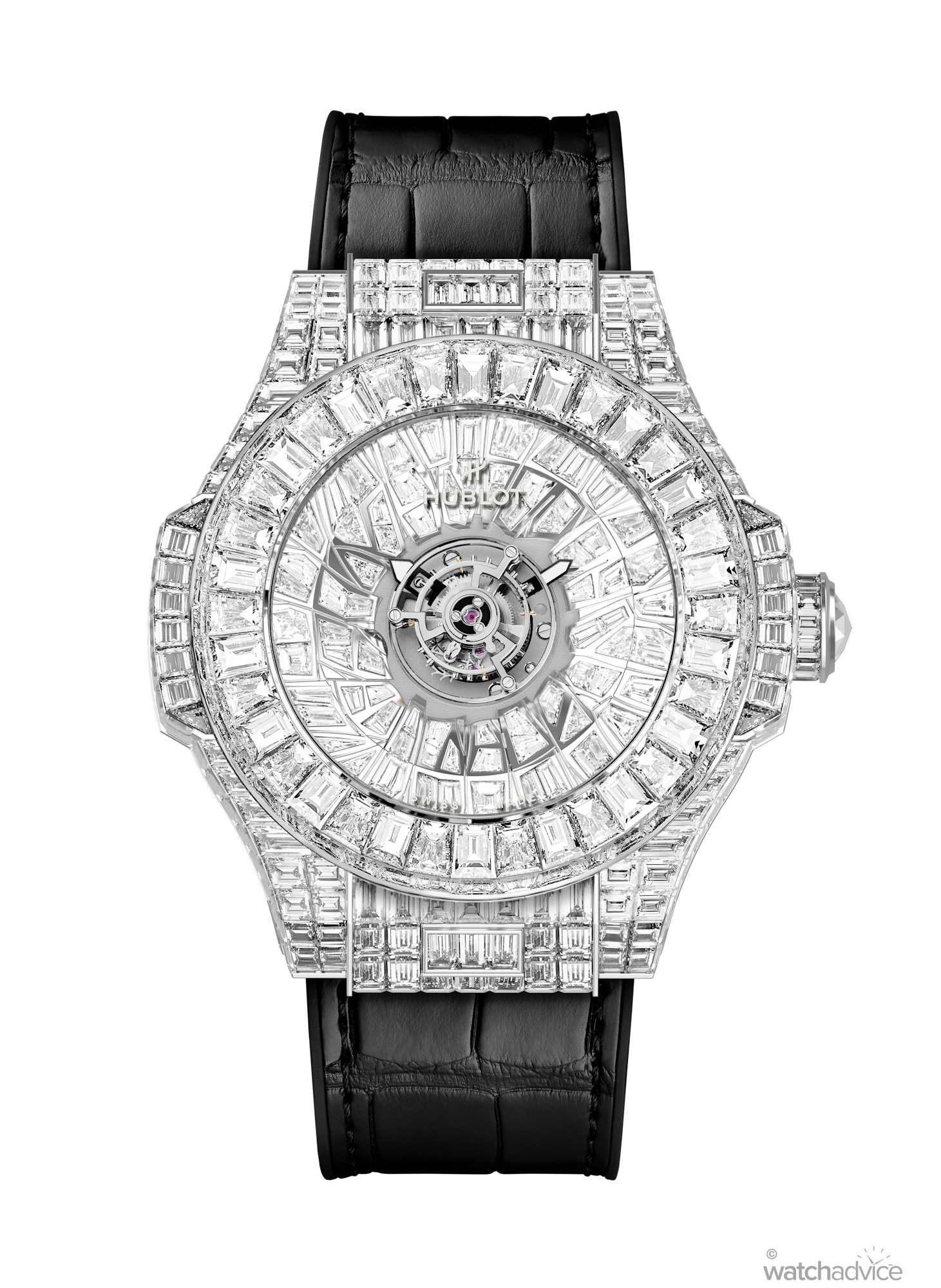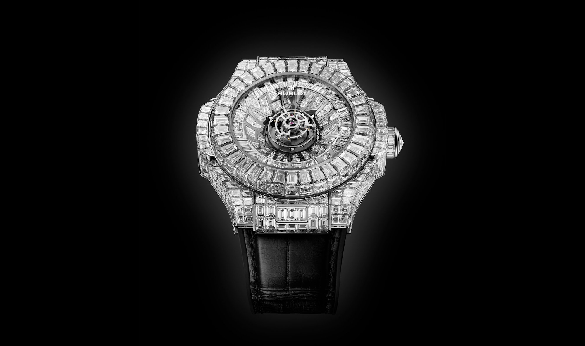 For this astonishing creation, Hublot has used 500 diamonds, totalling approximately 44.6 carats, in unique shapes that are arranged in a dynamic vortex around the central mechanical masterpiece that is the flying tourbillon. The design was specifically created by Hublot to “symbolise the attraction of energy and focus at the heart of watchmaking’s most celebrated complications.”